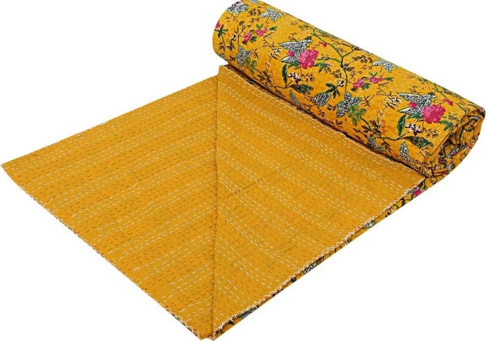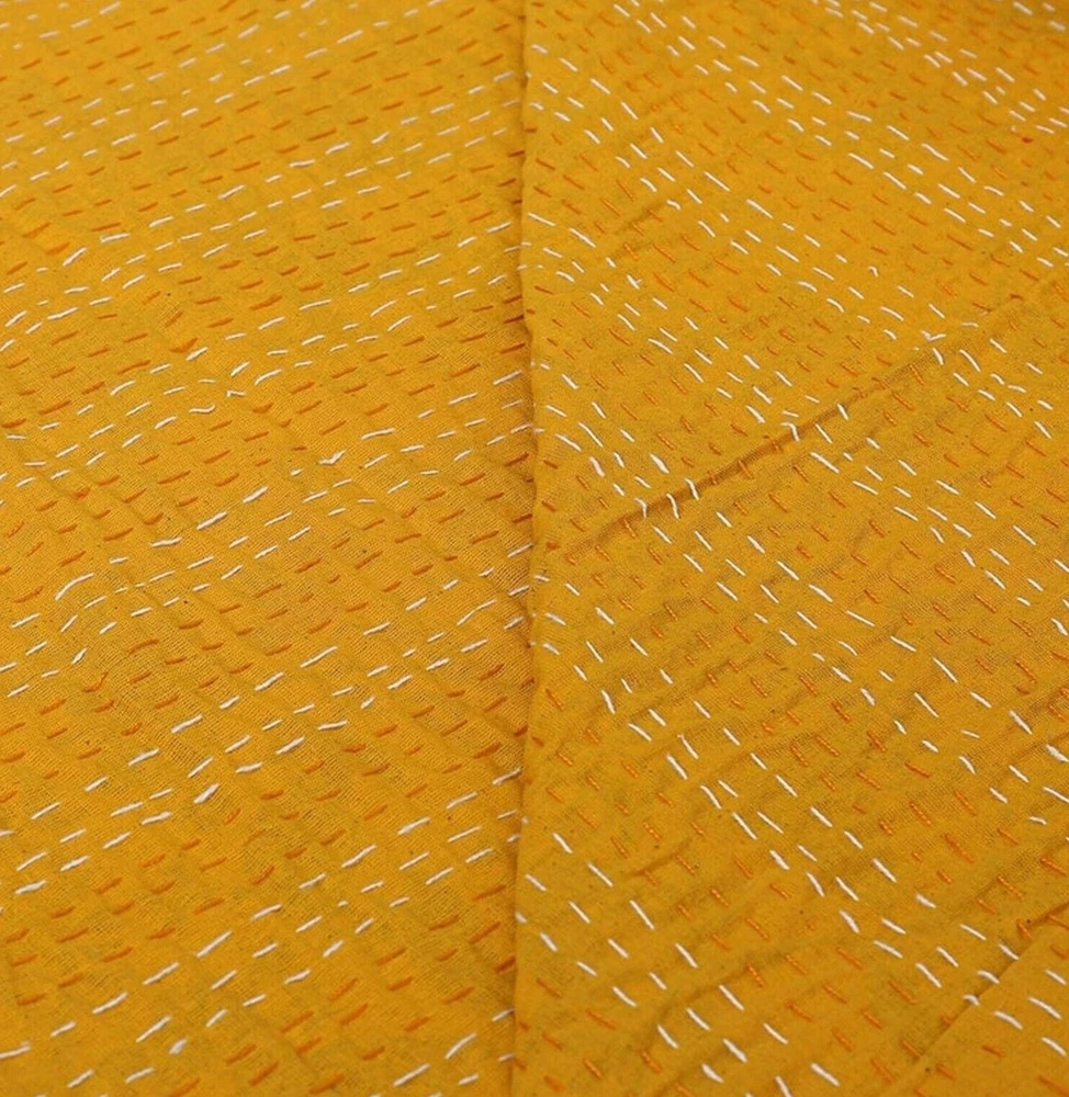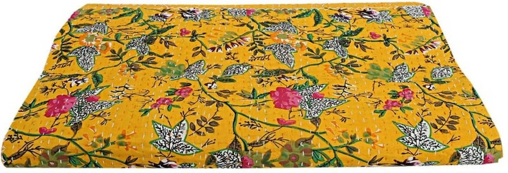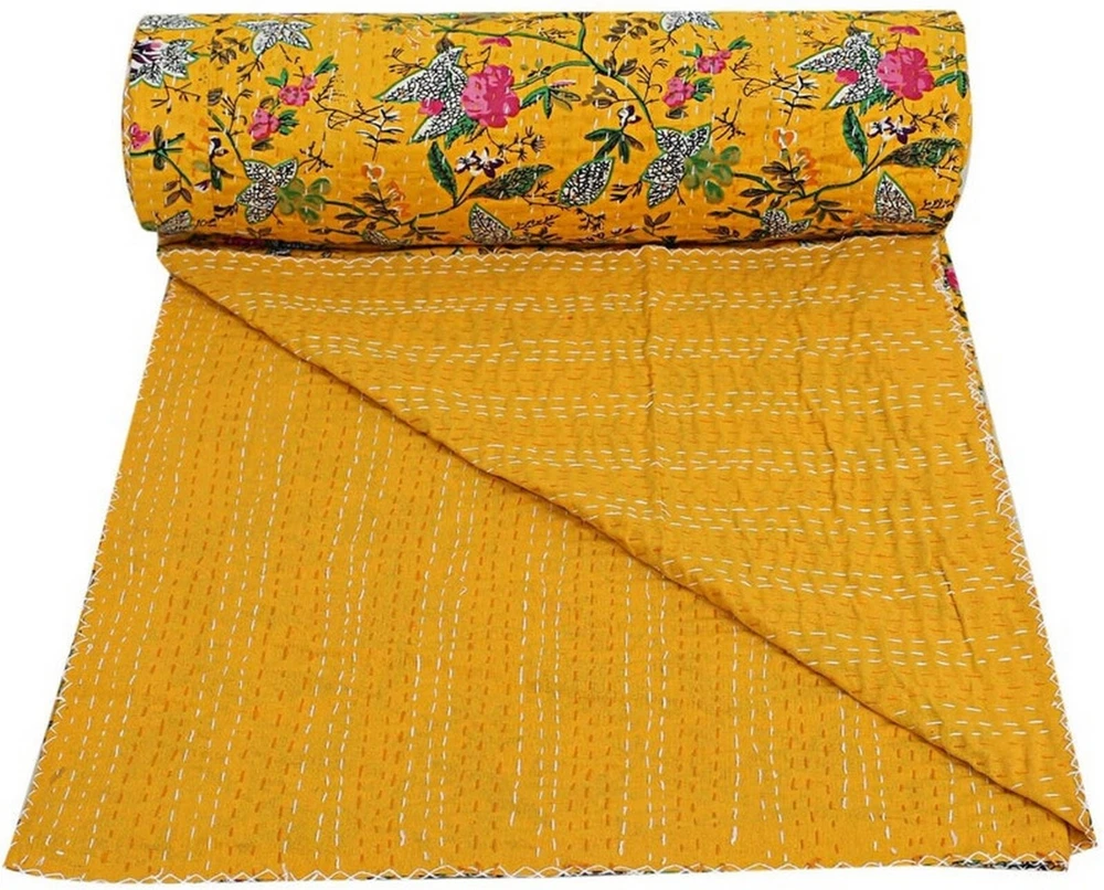 Add a touch of luxury to your bedroom with this beautiful Indian handmade vintage Kantha quilt throw. The rectangular quilt is made of 100% cotton and features a stunning floral pattern in yellow. It's perfect for all seasons and comes with a double bedspread size suitable for a queen-sized bed. The coverlet is quilted and machine washable, making it easy to care for. The unique Indian style adds a boho touch to your decor, and it's perfect for teens, adults, unisex baby & toddler, and kids. This luxurious item is a must-have for anyone looking for a high-quality bedding option. This vintage Kantha quilt is a perfect addition to your home decor. It is machine washable and easy to maintain. The quilt is suitable for teens, adults, unisex baby & toddler, and kids. This bedspread is a great way to add a cozy and comfortable touch to your bedroom. Blanket Indian Twin Handmade Bedspread Kantha Work Bohemian Bed Decor Throw Blanket 60X90 inch => Floral Kantha Quilt => Material: 100% Cotton => Size:- Twin 60 x 90" Approx. => Size:- Queen 90 x 108" Approx. Note:-As this is Applique Hand Floral Kantha, There will be variation in patches Every Piece Comes Different Base Color will Be same. You Will Received Little Bit Differ As Shown In Picture. Note - loose threads to be expected. Note - The entire Two Layer of Silk and Cotton quilt is hand embroidered with end number of straight stitches to create a unique product, one of a kind, that it’s a perfect GIFT too. , All these make them a Patchwork Quilt. Note - There is no batting inside the two layers. Cotton fabric King Size Kantha Stitch Quilt , Blanket / Bedspread. , * Floral pattern on the front side. * Backing with solid pattern. * Colored threads are used to develop the Kantha pattern. NOTE: Once You Bought Item From Our Store You Will 100%Satisfied. And You Will Get As We Describe !