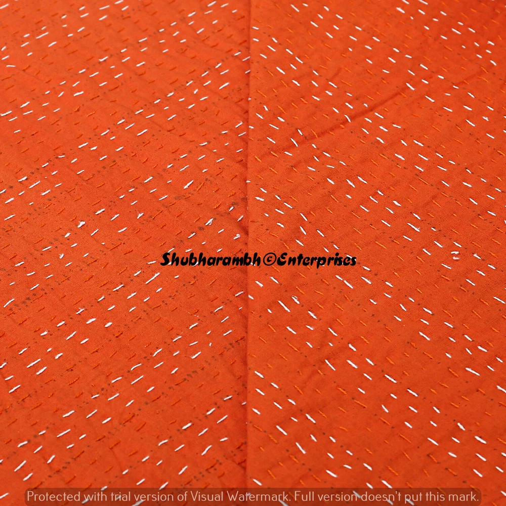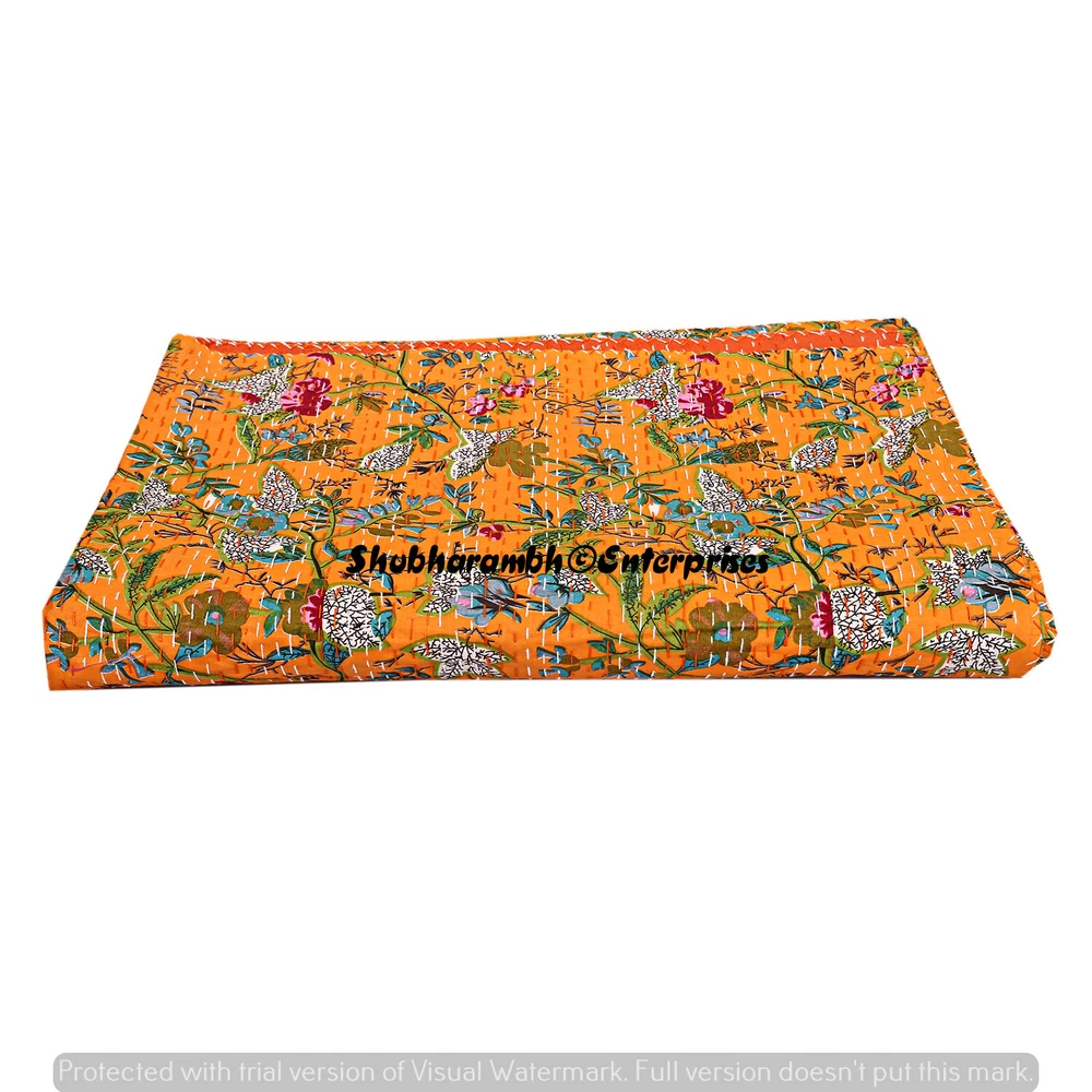 Indian Orange Floral Kantha Throw Blanket Reversible Comforter Handmade Blanket