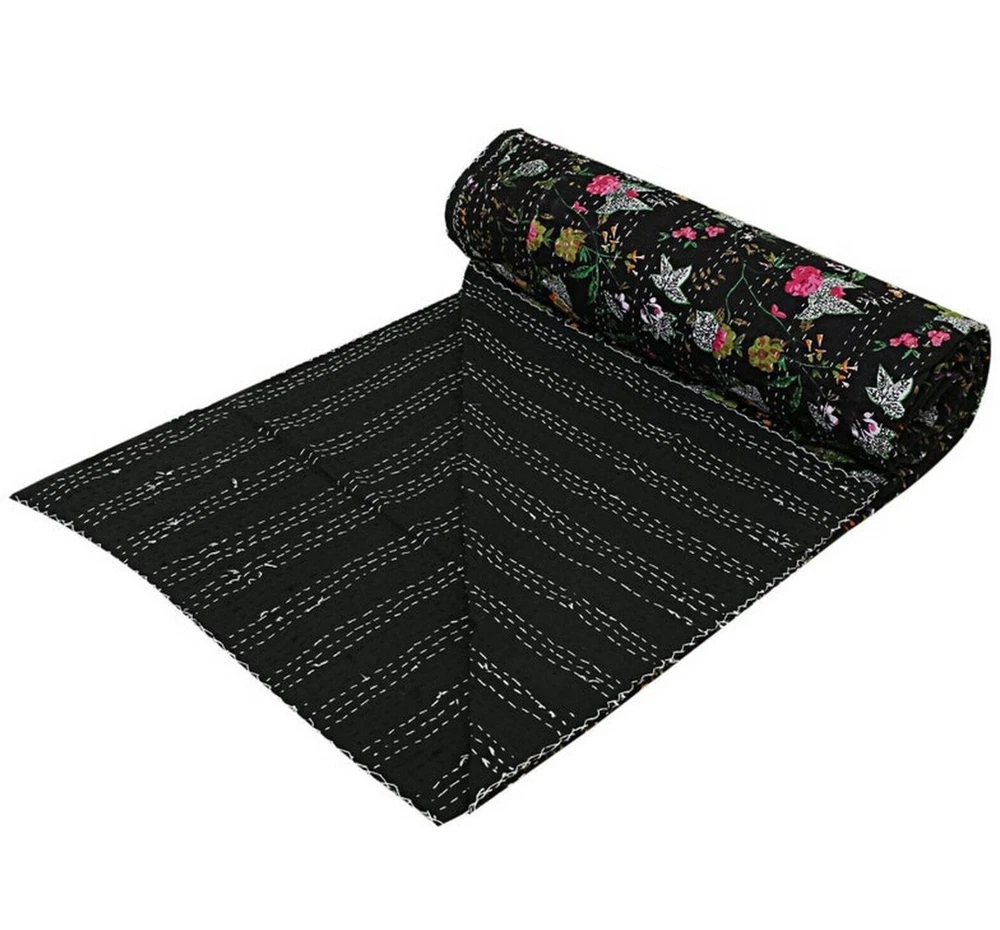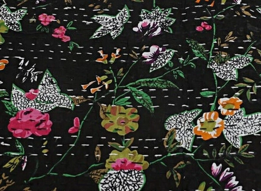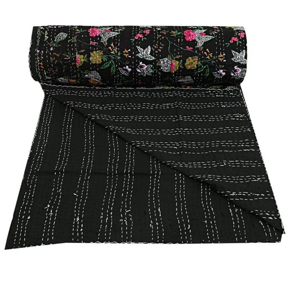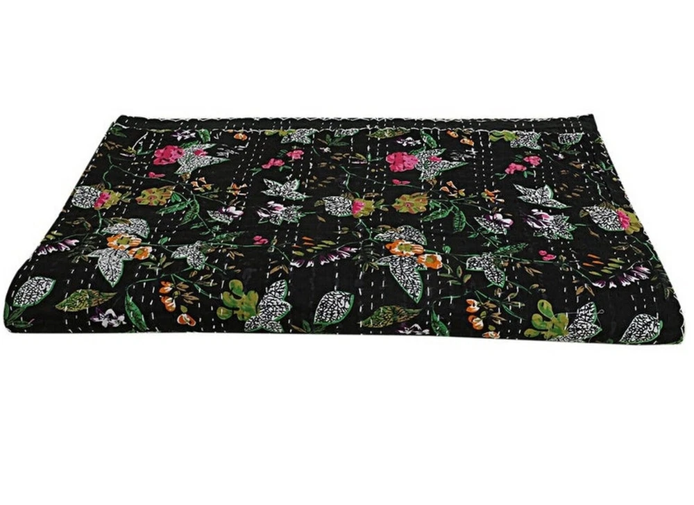 Transform your bedroom into a luxurious haven with this beautiful black Kantha quilt. The intricate floral pattern adds a touch of elegance to your space, while the all-season insulation ensures comfort and warmth. This rectangular quilt is perfect for a queen-sized bed and is made of 100% cotton for a soft and cozy feel. The quilted design adds texture and depth to your bedding, and the machine washable fabric makes it easy to care for. Whether you're looking for a boho-inspired bedding option or simply want to add some luxury to your bedroom, this Indian Paradise Kantha quilt is the perfect choice. This vintage Kantha quilt is a perfect addition to your home decor. It is machine washable and easy to maintain. The quilt is suitable for teens, adults, unisex baby & toddler, and kids. This bedspread is a great way to add a cozy and comfortable touch to your bedroom. Blanket Indian Twin Handmade Bedspread Kantha Work Bohemian Bed Decor Throw Blanket 60X90 inch => Floral Kantha Quilt => Material: 100% Cotton => Size:- Twin 60 x 90" Approx. => Size:- Queen 90 x 108" Approx. Note:-As this is Applique Hand Floral Kantha, There will be variation in patches Every Piece Comes Different Base Color will Be same. You Will Received Little Bit Differ As Shown In Picture. Note - loose threads to be expected. Note - The entire Two Layer of Silk and Cotton quilt is hand embroidered with end number of straight stitches to create a unique product, one of a kind, that it’s a perfect GIFT too. , All these make them a Patchwork Quilt. Note - There is no batting inside the two layers. Cotton fabric King Size Kantha Stitch Quilt , Blanket / Bedspread. , * Floral pattern on the front side. * Backing with solid pattern. * Colored threads are used to develop the Kantha pattern. NOTE: Once You Bought Item From Our Store You Will 100%Satisfied. And You Will Get As We Describe !