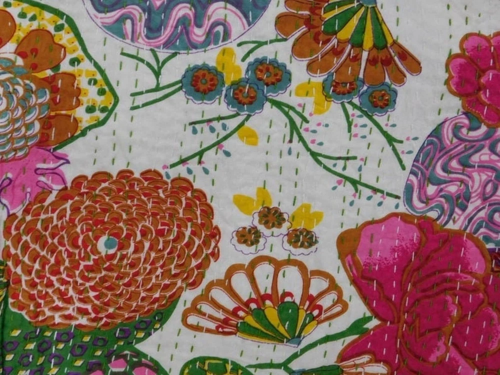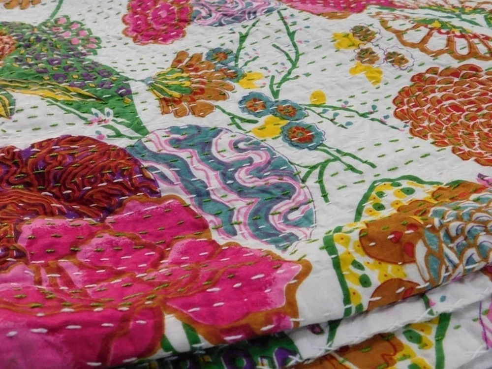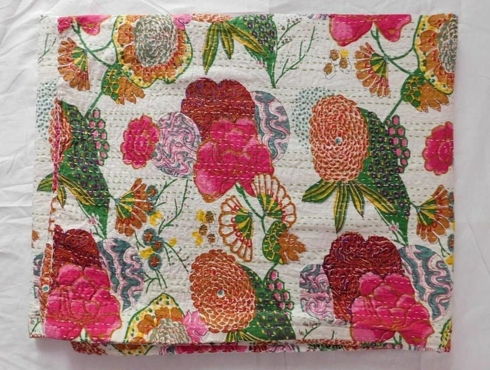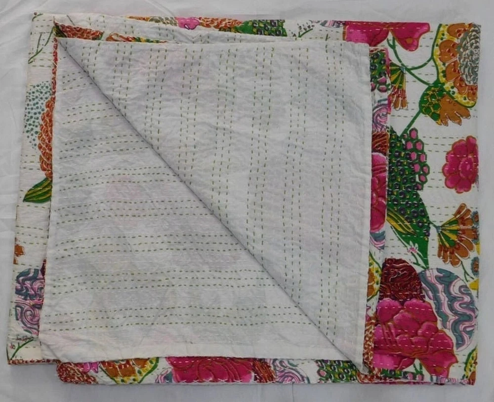 Transform your bedroom into a luxurious haven with this beautiful Indian Paradise Kantha Bedspread. The rectangular coverlet is made of 100% cotton and features a stunning white color with a fruit pattern that adds a touch of boho style to your bedding. The quilted blanket is perfect for all seasons and is machine washable for easy maintenance. This personalized coverlet is suitable for teens, adults, unisex baby & toddler, and kids. The Indian-inspired design is perfect for those who love luxury and comfort. The coverlet is made in India and features a no-closure type. Add this gorgeous Kantha quilt to your collection and enjoy the ultimate comfort and style in your bedroom. This vintage Kantha quilt is a perfect addition to your home decor. It is machine washable and easy to maintain. The quilt is suitable for teens, adults, unisex baby & toddler, and kids. This bedspread is a great way to add a cozy and comfortable touch to your bedroom. Blanket Indian Twin Handmade Bedspread Kantha Work Bohemian Bed Decor Throw Blanket 60X90 inch => Fruit Kantha Quilt => Material: 100% Cotton => Size:- Twin 60 x 90" Approx. => Size:- Queen 90 x 108" Approx. Note:-As this is Applique Hand Floral Kantha, There will be variation in patches Every Piece Comes Different Base Color will Be same. You Will Received Little Bit Differ As Shown In Picture. Note - loose threads to be expected. Note - The entire Two Layer of Silk and Cotton quilt is hand embroidered with end number of straight stitches to create a unique product, one of a kind, that it’s a perfect GIFT too. , All these make them a Patchwork Quilt. Note - There is no batting inside the two layers. Cotton fabric King Size Kantha Stitch Quilt , Blanket / Bedspread. , * Fruit pattern on the front side. * Backing with solid pattern. * Colored threads are used to develop the Kantha pattern. NOTE: Once You Bought Item From Our Store You Will 100%Satisfied. And You Will Get As We Describe !