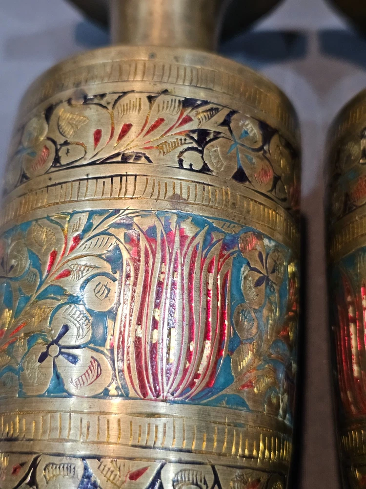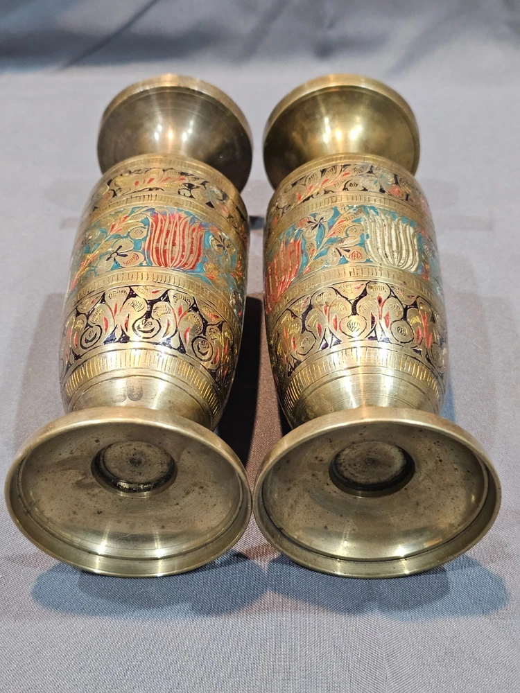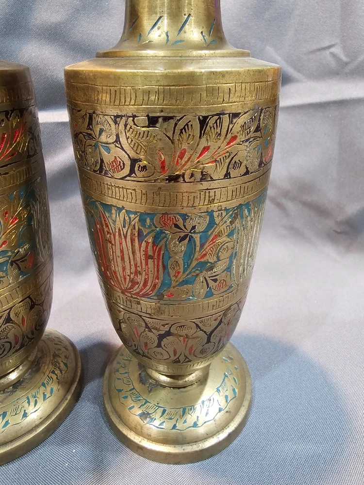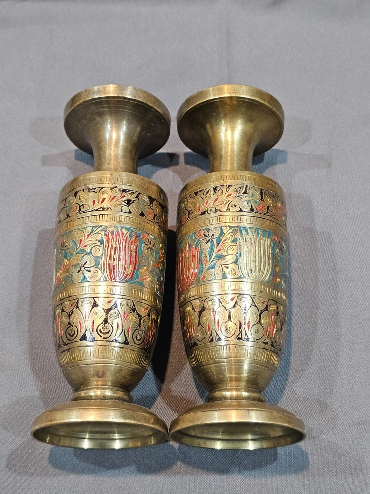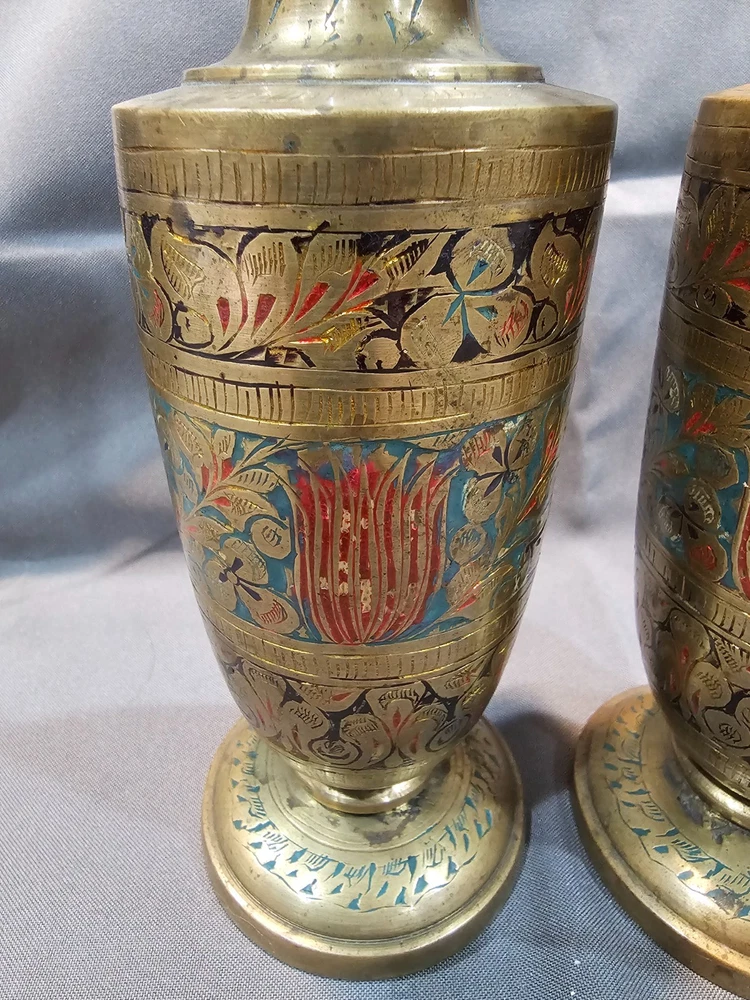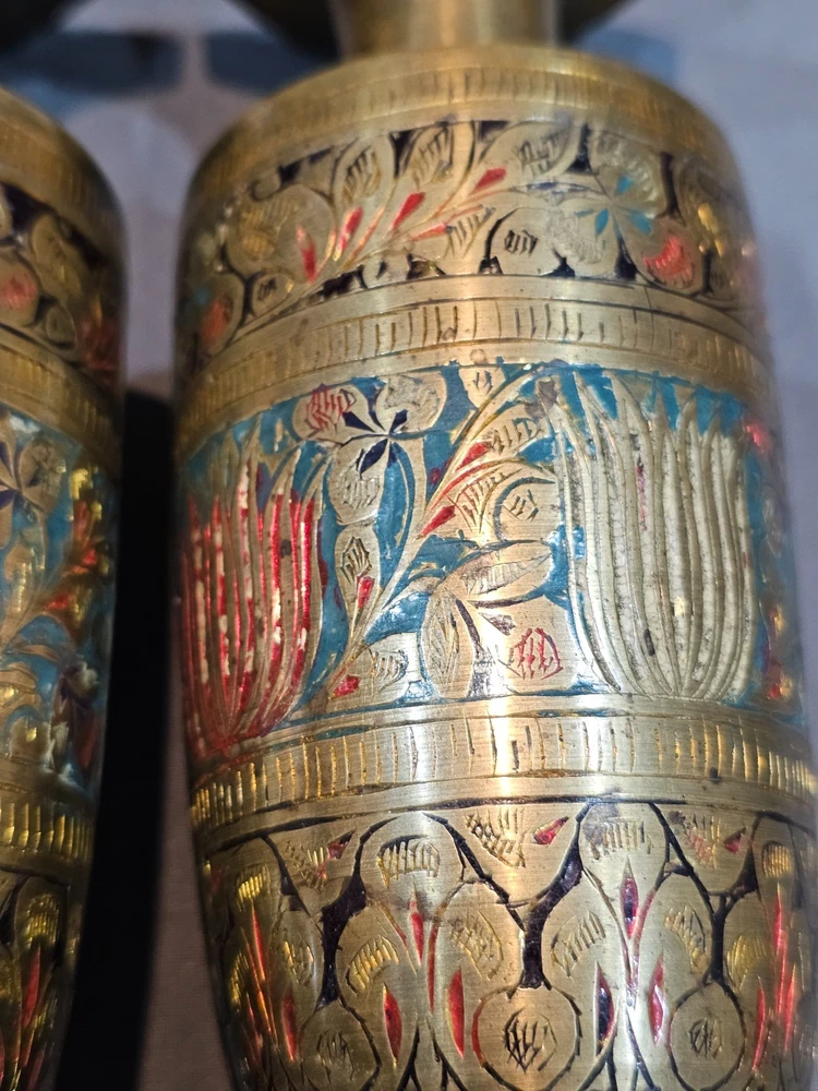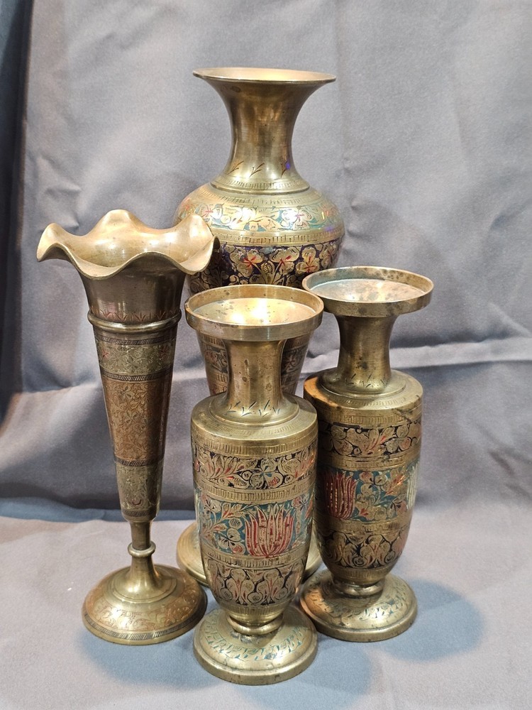 Indian Solid Brass Vase Lot of 4 with Intricate Floral Etching & Enamel Details