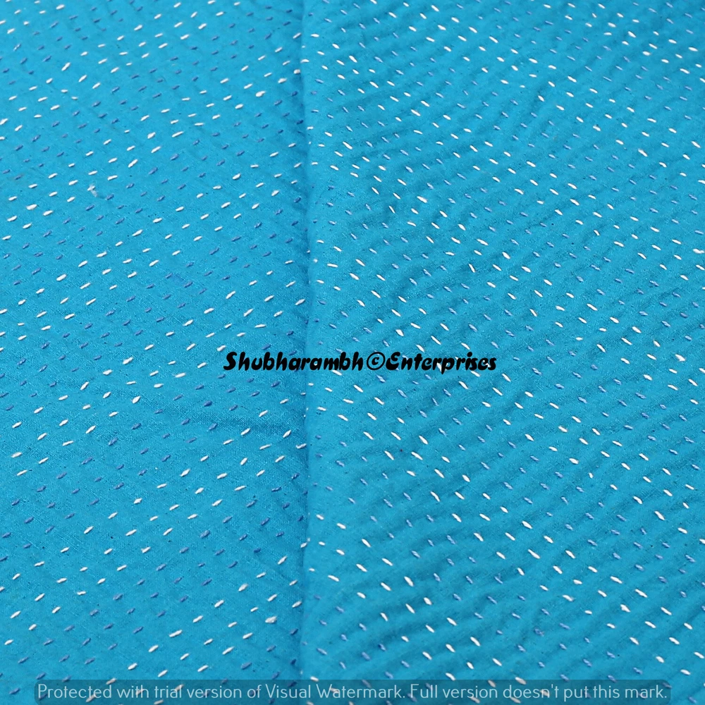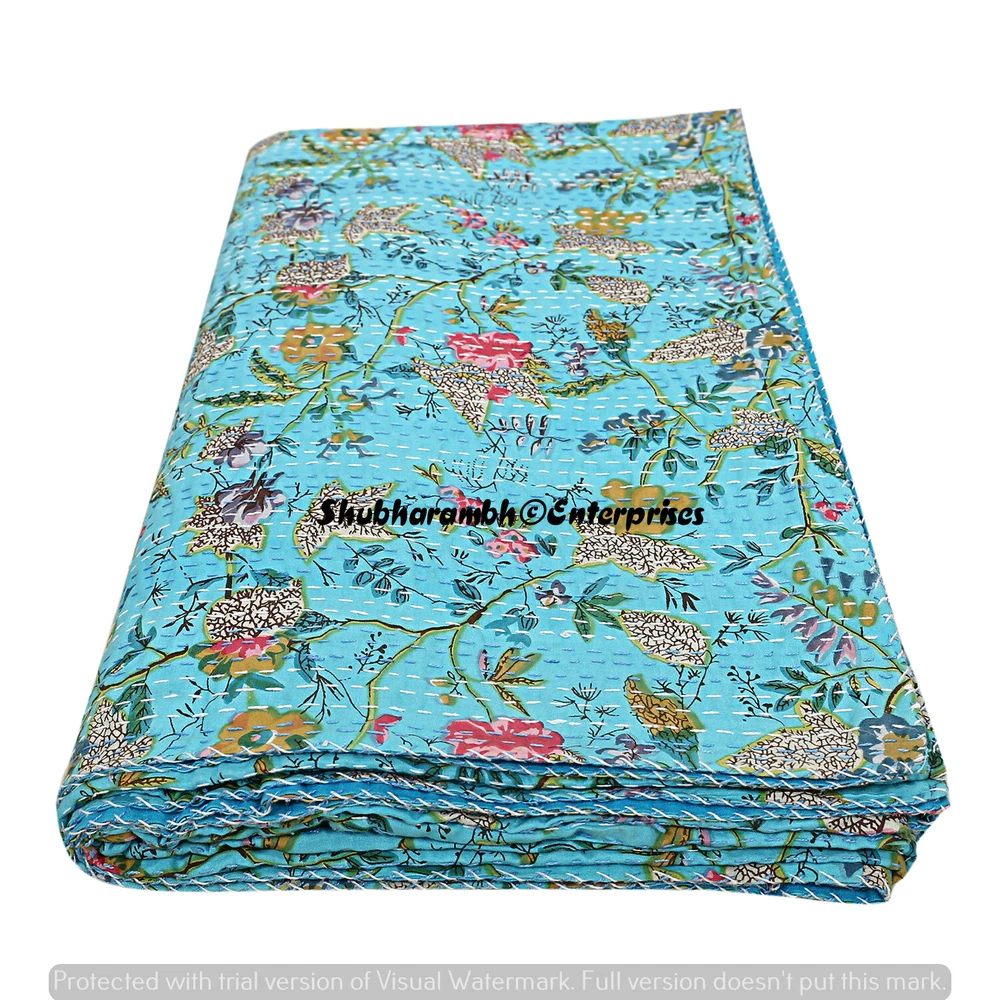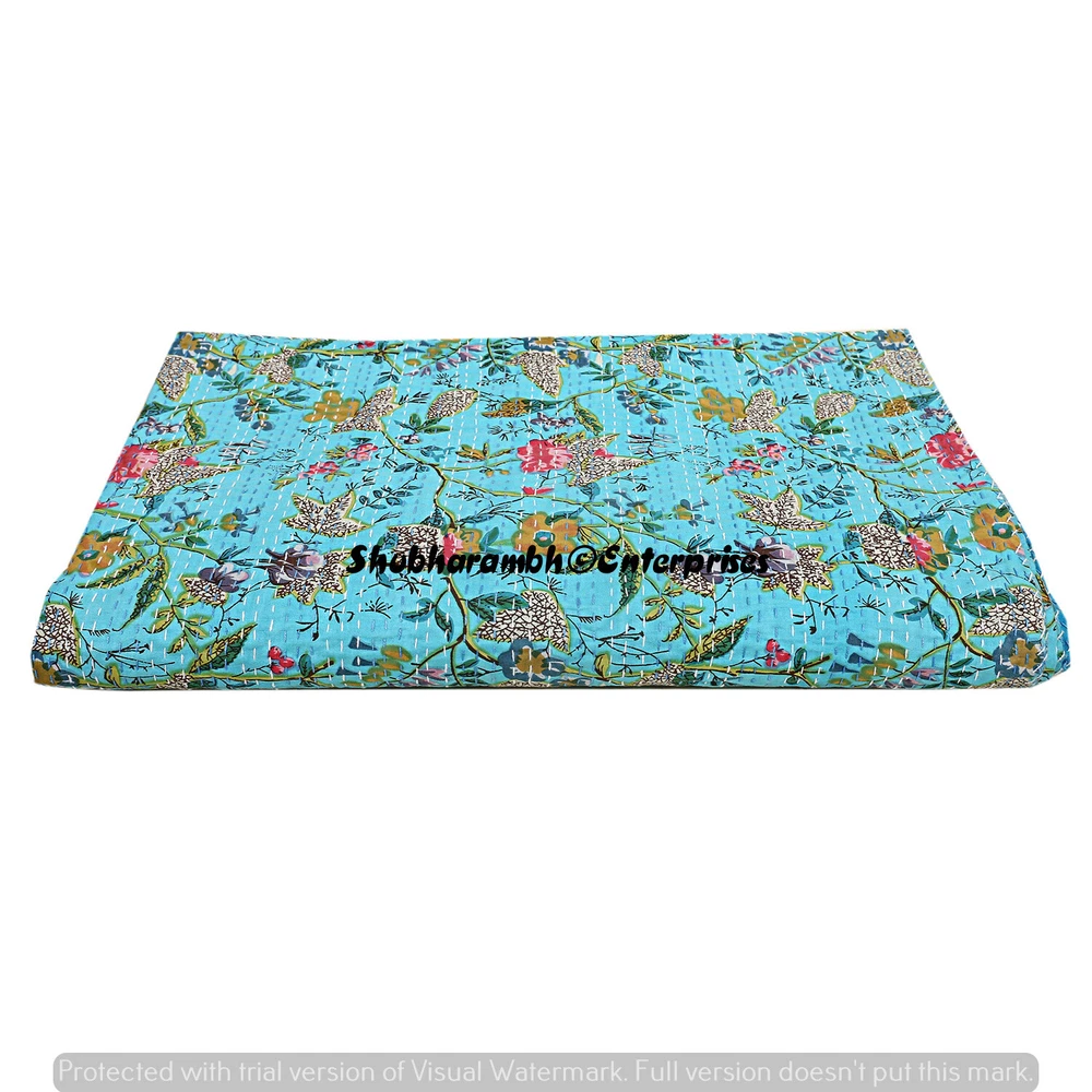 Indian Turquoise Cotton Bedcover Hippie Queen Kantha Quilt Bedding Bedspread