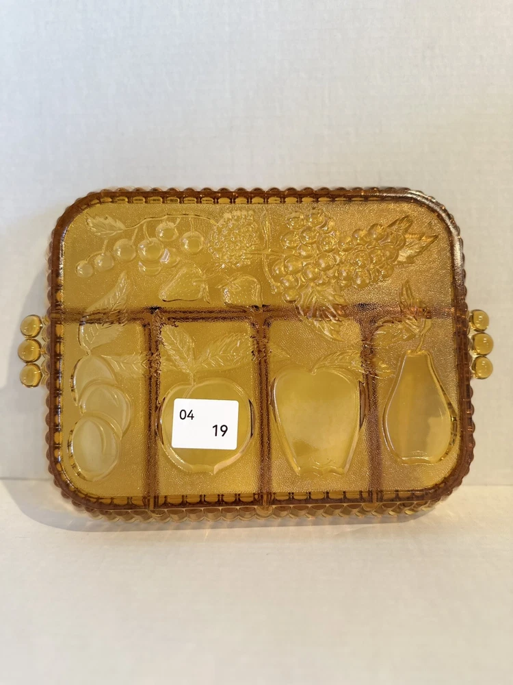 Elevate your serving game with this stunning Indiana Glass Amber Divided Part Relish Serving Dish Tray. The intricate fruit design on the carnival glass adds a touch of elegance to any table setting. Perfect for hosting dinner parties or holiday gatherings, this dish is sure to impress your guests. Crafted from high-quality glass and produced in a beautiful gold color, this relish dish is a must-have for any collector or home chef. Use it to serve your favorite condiments or as a decorative piece in your home.