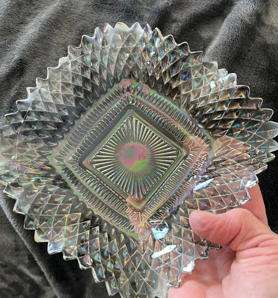 Experience the charm of vintage elegance with this Indiana Glass Smokey Gray Iridescent Ruffled Diamond Point Edge Dish Bowl. Crafted in the 1950s, the piece boasts a stunning diamond pattern, pressed glass production style, and a captivating gray color that exudes a timeless allure.Perfect for storing your cherished trinkets or as a decorative piece to enhance your home's aesthetic, this original bowl is a testament to the craftsmanship of its era. Its ruffled edges add a touch of sophistication, making it a delightful addition to any collection or decor.