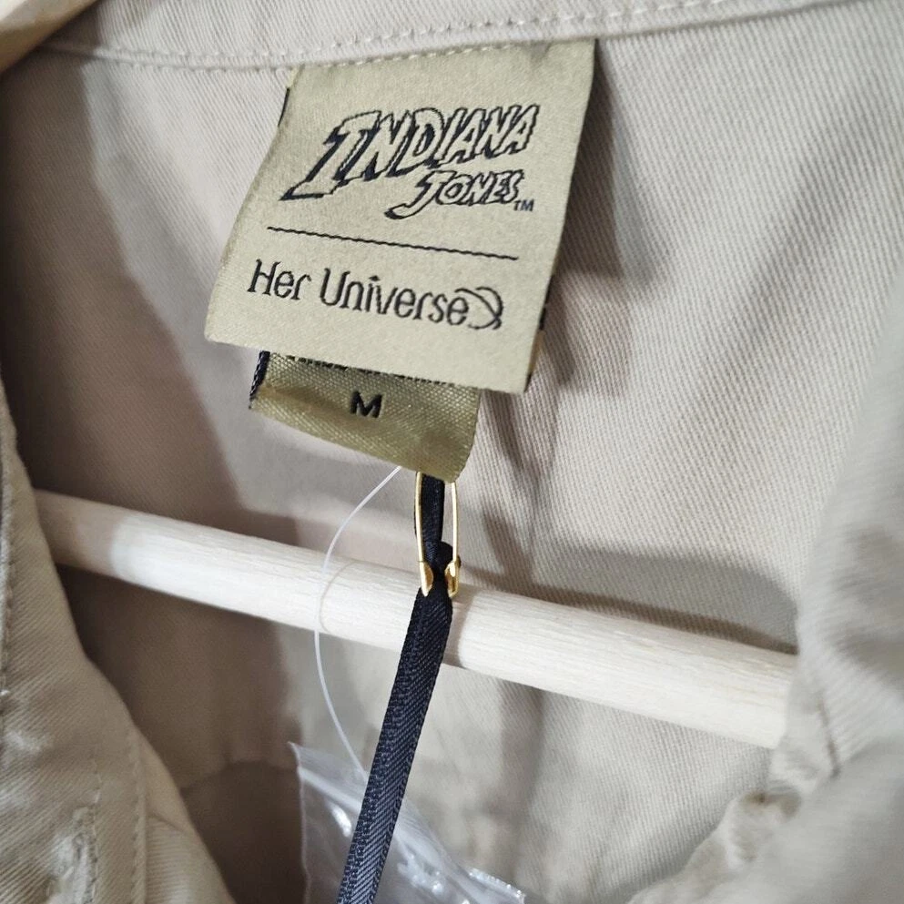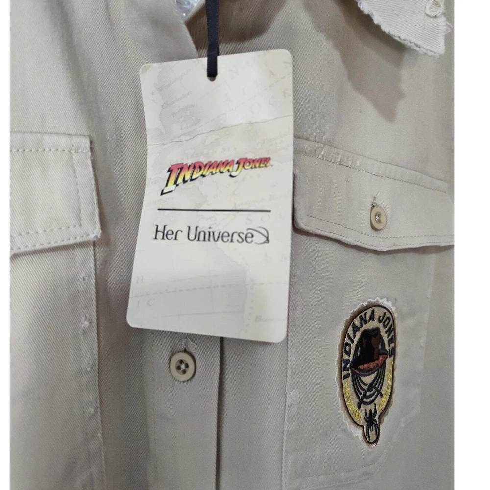 Unleash your inner adventurer with this Her Universe Disney Indiana Jones Utility Overshirt! This long sleeve button-down shirt in a rugged tan features a stylish frayed hem and two chest pockets, one adorned with a patch that says "Indiana Jones" alongside the classic Indy hat. The back of the shirt boldly declares "Expert of the Occult," adding a touch of mystery. As a BoxLunch Exclusive, this utility overshirt is perfect for fans of the legendary archaeologist. Embrace the spirit of adventure with this unique and practical piece! Size: Measurements are approximate Size medium Condition: New with tags. Have a magical day Pet-free, smoke-free home.