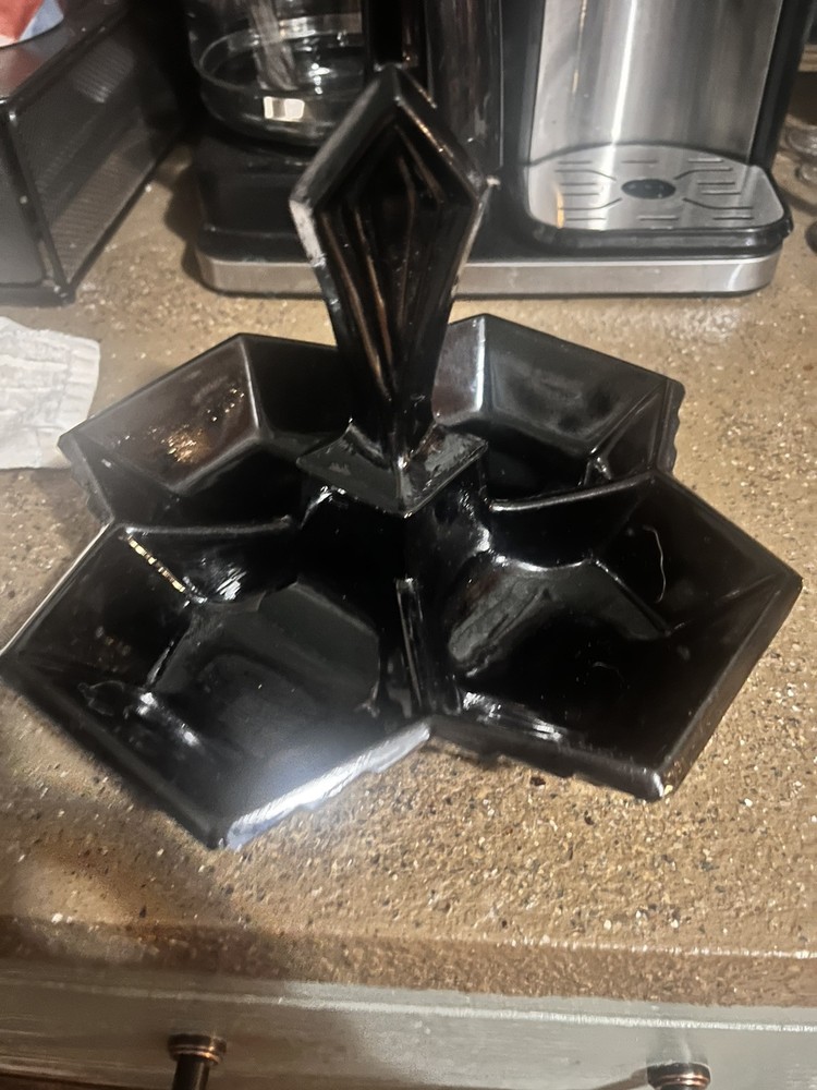 The Indiana Tiara Pyramid Black 4 Part Handled Server Candy Relish Dish is a vintage decorative piece made of pressed glass in an Art Deco style. This candy dish features a solid black color with a glossy finish, four compartments for serving various items, and decorative handles for easy carrying. It is both freezer and dishwasher safe, making it suitable for everyday use. This unique piece was manufactured in the United States during the 1970s by the Tiara brand, adding a touch of retro charm to any table setting.
