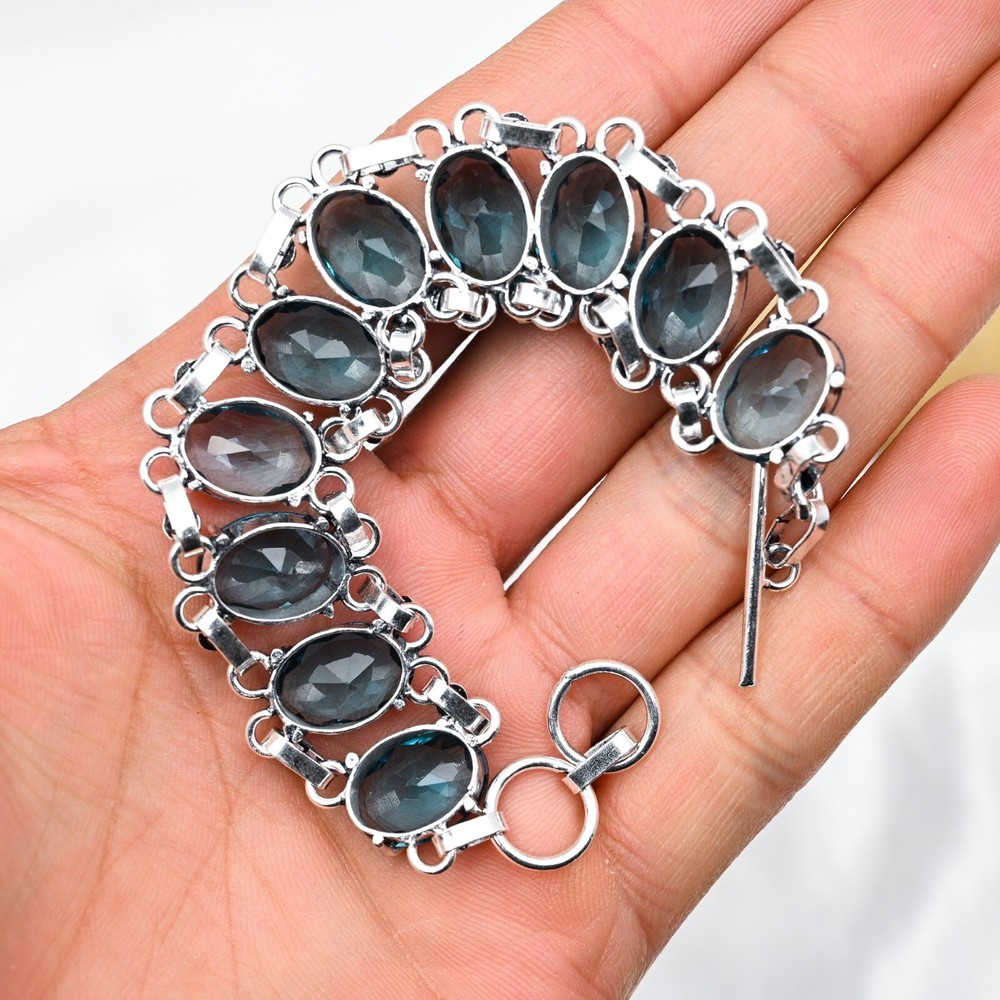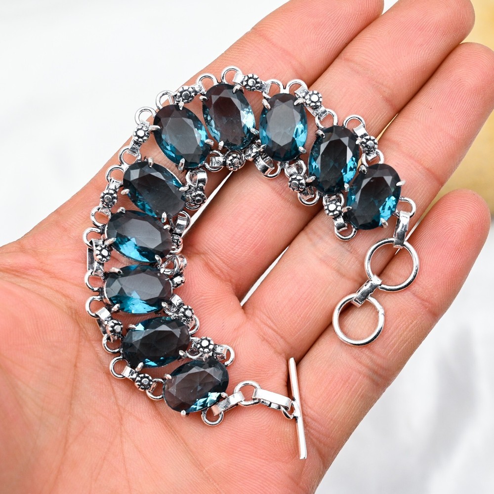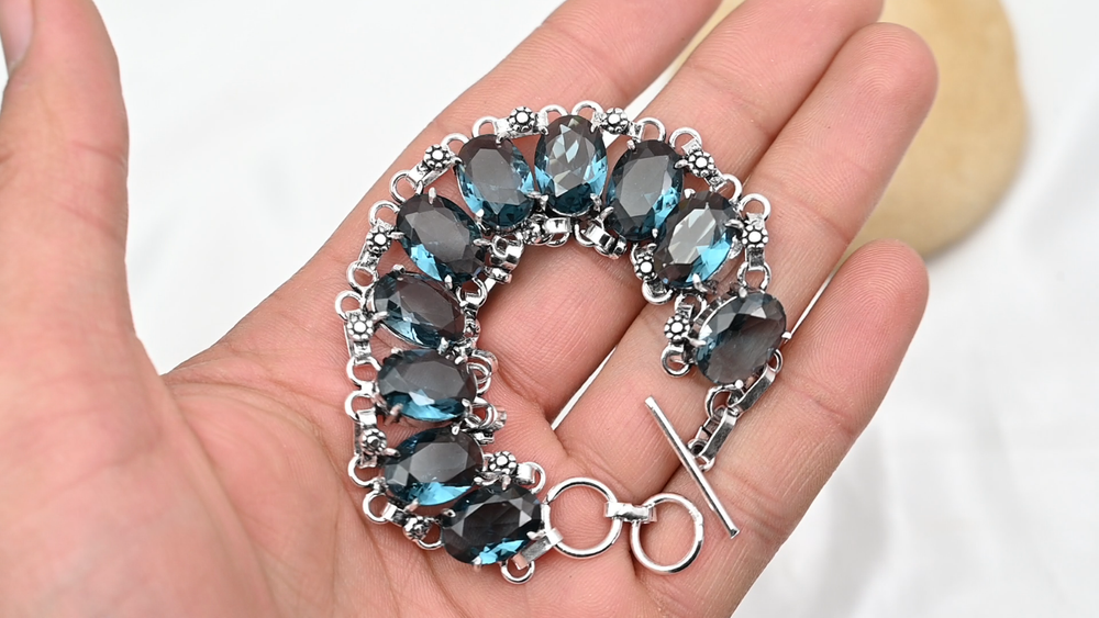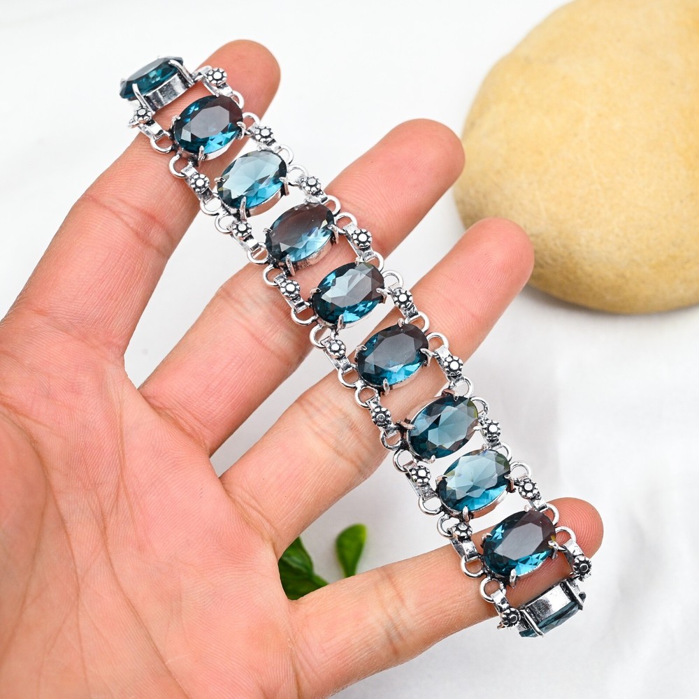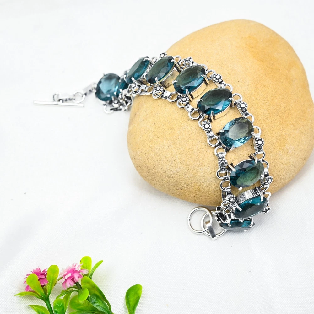 Shape:Same As PictureColor:SilverFeatures:AdjustableCountry of Origin:IndiaCut Grade:ExcellentMain Stone Creation:NaturalChain Type:N/AMaterial:GemstoneMain Stone Width:N/AMain Stone Color:BlueMetal Purity:925Style:ChainCountry/Region of Manufacture:IndiaMain Stone Shape:OvalDiamond Color Grade:N/AMetal:SilverNumber of Diamonds:N/AMain Stone Treatment:Not EnhancedCharm Type:Same As PictureBase Metal:Sterling SilverCollection:HandmadeMain Stone Length:N/AOccasion:Anniversary, Birthday, Christmas, Engagement, Mother's Day, Valentine's Day, WeddingType:BraceletDiamond Clarity Grade:N/ABrand:HandmadeItem Length:8 inches with Adjustable ChainMain Stone Depth:N/ATotal Carat Weight:10 carat and aboveNumber of Gemstones:10Closure:ToggleSetting Style:BezelCertification:N/ATheme:Beauty, Bohemian, Ethnic, Halloween, LoveSecondary Stone:Indicolite TourmalineColored Diamond Intensity:N/AMain Stone:Indicolite Tourmaline