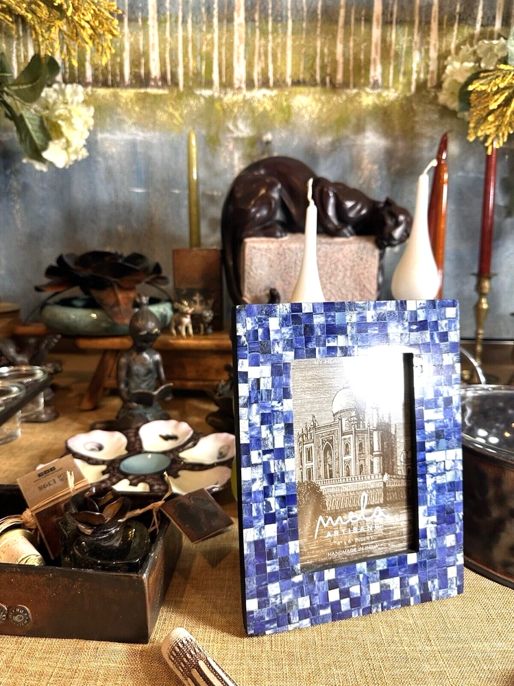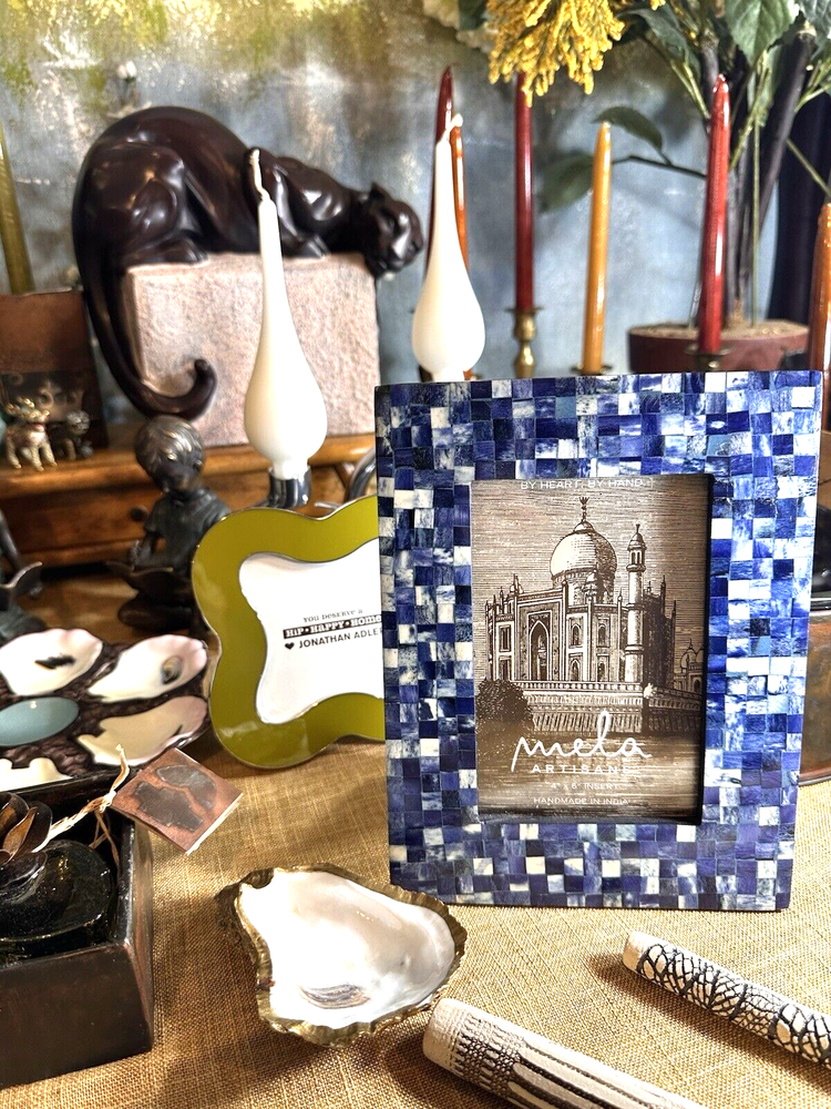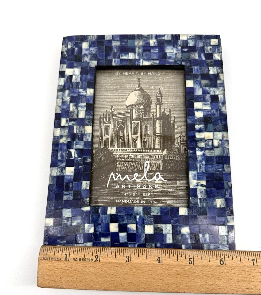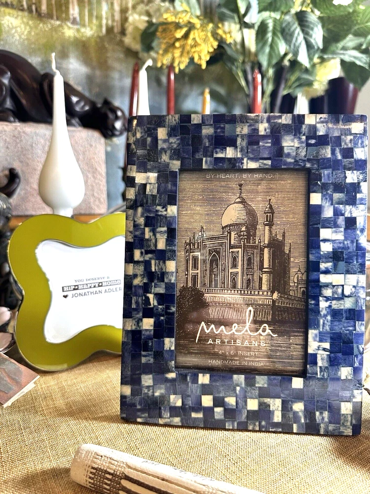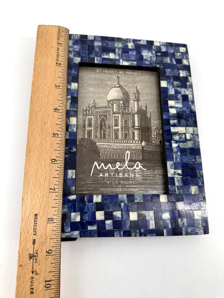 The Mela Artisans Indigo Hand Painted Photo Picture Frame is a contemporary designer piece featuring small indigo tiles in various shades of blue, creating a beautiful abstract pattern. Made by artisans in India, this 4x6 frame has a rear-loading photo insertion and a matte finish. The frame measures 8.5 inches in height, and 6.5 inches in width, with a portrait orientation and clear glass. This unique and stylish frame is suitable for all occasions and would make a stunning addition to any home decor. Great condition. Artist signature on back in metal. You will receive the picture frame that is in the picture. If you are new here, you may see if other items that will be listed this week or next week. So, you get a sneak peak of what is coming up next! :)!! Here is my Ebay shop: YouBeYou LLC If you have any questions even after you have purchased the item --- I am here for you to answer any questions that you may have! I strive to work diligently with every buyer to ensure they are a satisfied buyer, so please contact me anytime. This is a pre-owned item and I take great care to accurately describe the item but please see the pictures for full details. While we do our best to list every item in detail, these are vintage and pre-owned items, and some flaws are to be expected. Please see all photos/ video as they are a large part of the description of our items. Items come from a smoke-free environment. Each item is described in accurate detail with multiple measurements and various photos at different angles front and back, side to side, top and bottom. I have additional similar items that I have yet to list that you may be interested in. Feel free to follow my store ( YouBeYou LLC ) to see those when posted. Please see all photos/ video as they are a large part of the description of our items. I strive to make every purchase a pleasant experience. Please feel confidence in you purchase that I'll make every effort to correct any issues that may arise. If used, there are always some signs of wear -- well, because it is used, vintage, or antique. Most items are used -- Each item is inspected for quality. It is very important to us that you have a happy Ebay experience! Thank you for supporting a small business like ours! (Note: pictures may include measurements, and some have a video.)