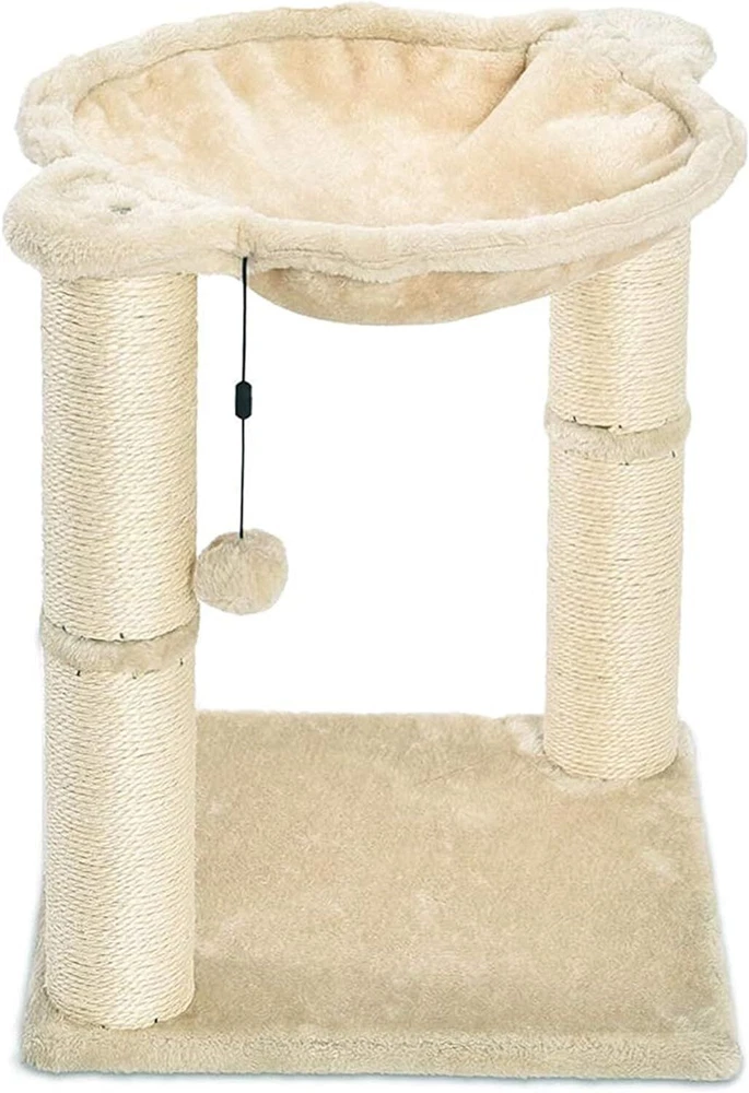 Product Description Cat tower in Beige designed to engage indoor cats in climbing and scratching and cozy naptime 2 sturdy scratching posts, plush suspended hammock, secure base, and a replaceable dangling soft ball toy Natural jute fiber provides an optimal texture for cats to sharpen claws and keep nails healthy Redirects cats away from scratching household carpet or furniture Easy to assemble in a matter of minutes; spot clean as needed Product Dimensions: 15.8 x 15.8 x 19.7 inches (LxWxH) Product Description An Amazon Brand. From the Manufacturer H&E