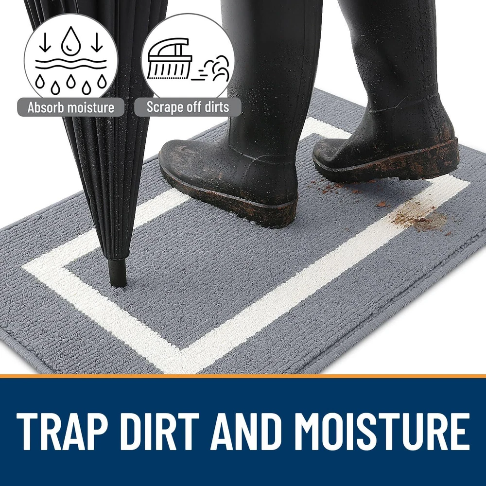 TO MAKE EVERYDAY LIFE EASIER We are dedicated to bringing our customers premium, high-quality, and functional household products at reasonable prices. Our vision is to continuously innovate and improve our products based on customer needs as well as current industry trends. With many different color and sizes to choose from, you will easily find mats to coordinate with your decor! FEATURES:- Constructed of 100% high-quality polypropylene fabric- Dimensions: 20" x 32" x 0.4" / 24" x 36" x 0.4"/ 32" x 48" x 0.4"/ 35" x 59" x 0.4"- Grey, Black and Khaki - Non-slip TP rubber backing- Ribbed weave to work as shoe scraper TAKE A LOOK AT SOME POPULAR QUESTIONS FROM OUR VALUED CUSTOMERS: ☛ HOW CAN I CLEAN THIS MAT? For a quick clean, simply vacuum with a hand-held or regular sized vacuum. Your mat can also be spot cleaned using a mild soap and a damp cloth. For deeper cleans, use a garden hose to rinse off outdoors. Always air dry. Never use bleach on the mat. ☛ CAN I USE THIS MAT UNDER LOW-CLEARING DOORS? Yes! Our mat is designed with a 0.4” sleek, low-pile for most low-clearing doors or entryways. This mat works in both interior and exterior spaces. ☛ HOW EFFECTIVE IS THIS MAT IN CAPTURING DIRT AND MOISTURE? Good question. We’ve intentionally designed our door mats with the solid and practical polypropylene fiber to help keep dirt and moisture trapped in the absorbent mat fabric and off your floors! [FRIENDLY NOTE] Upon arrival, your doormat may have some wrinkles due to being folded during packaging. No worries—this won't impact its functionality. Simply toss it in the washing machine, lay it flat for a couple of days, and let it naturally regain its shape. Alternatively, a quick pass with a hot iron will smooth out any remaining wrinkles. [SOFT TOPSIDES AND ELEGANT DECOR] Transform your space with 's indoor door mats, boasting a gentle yet sturdy topside. The refined geometric design brings an air of beauty and sophistication, establishing a warm and inviting atmosphere. Experience the harmonious blend of comfort and aesthetics as the soft topsides cradle your feet in luxurious elegance. [CAPTURES DIRT AND MOISTURE] Step into comfort with 's indoor door mat. Crafted to effectively capture dirt and rapidly absorb moisture, this mat is perfect for your entryway. Ensure your shoes are promptly rid of water, dust, grit, muck, sand, and more. Elevate your entrance with 's versatile doormat. [EFFORTLESS ELEGANCE] 's door mat features a slim 0.4-inch profile complemented by reinforced overlock edges, presenting a chic and streamlined aesthetic. The considerate design guarantees smooth door operation while keeping the mat securely in place. Cleaning is a breeze – a quick shake, a sweep with a broom, or a pass with a handheld vacuum maintains its fresh appearance. For a deeper clean, toss it in the washing machine with cold water and tumble dry on low heat. [PERSONALIZED WELCOME] Craft a personalized welcome for your home with 's door mat. Its neutral yet stylish design seamlessly complements any decor, providing a platform for expressing your unique taste. Versatile and suitable for all weather conditions, this door mat fits effortlessly as a front door mat, outdoor mat, welcome mat, indoor entryway mat, shoe mat, dog doormat, or floor mat. Ideal for use in various areas, such as the mudroom.