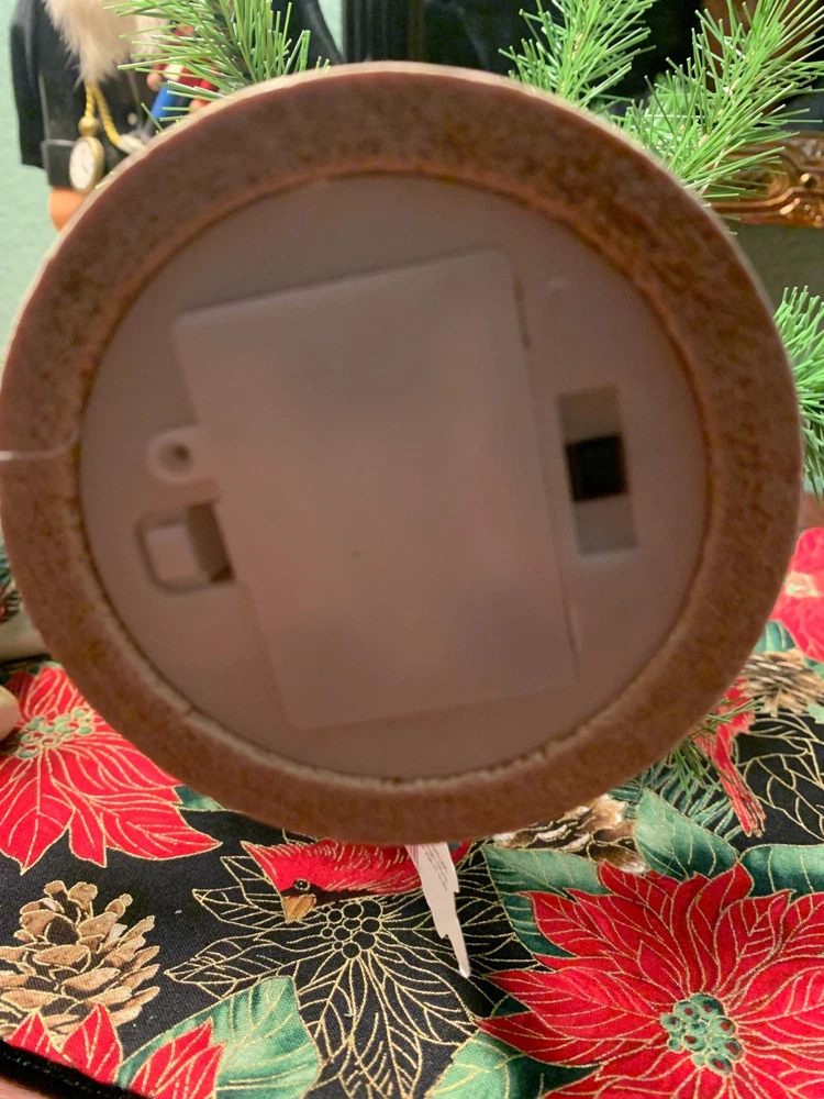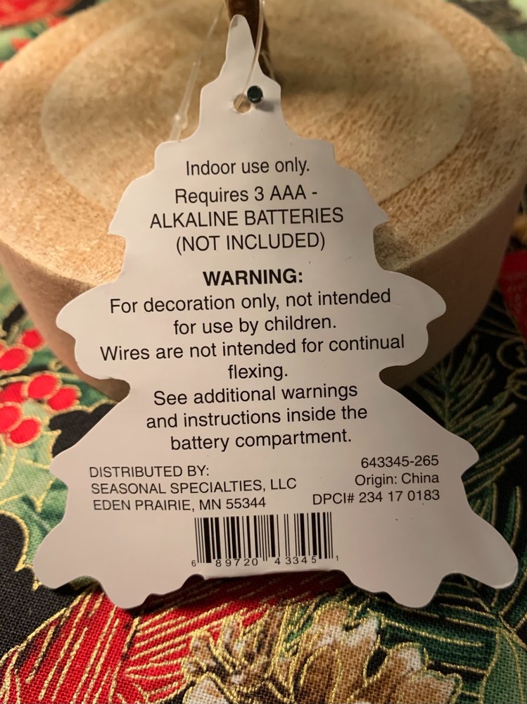 Indoor Lighted Mini Christmas Tree 10 warm white LEDs and 6 brown pinecones Battery operated - three AAA batteries (not included) 17" tall, 9" wide 3 1/2" diameter wood base