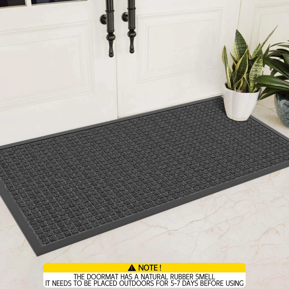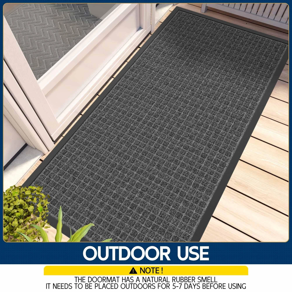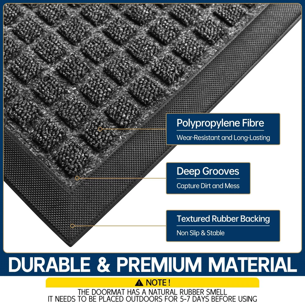 CAPTURES MUD AND MOISTURE: The surface of this entrance mat has a deep plaid design that quickly traps mud, dirt, moisture and debris deep in the grooves, keeping your home tidy in rainy and muddy weather WEATHERPROOF AND DURABLE: The entryway rug surface is made of tightly woven polypropylene material, which has good fixing and abrasion resistance, and the color will not fade even after a long time of use. Low-pile design allows easy passage even for low doors NON-SLIP BOTTOM: The bottom of the outdoor floor mat are made of natural rubber, waterproof, and wear-resistant, which keeps the mat fixed in place, Quality for outdoor use in all weather. Both safe and comfortable (Fresh rubber smell on the bottom, please leave it in a ventilated place for about 5-7 days) EASY TO CLEAN: Light dirt can be shaken off directly or cleaned with a vacuum cleaner, For deeper clean, can directly rinse with water, after rinsing, it can directly dry in the sun, and keep the bottom dry when in use LARGE DOORMAT VERSATILITY: Heavy duty doormats are perfect for high traffic areas such as entrances, outdoor patios, garages, gardens, laundries, or any outdoor space, and can also be used as a commercial doormat to keep floors clean in public places