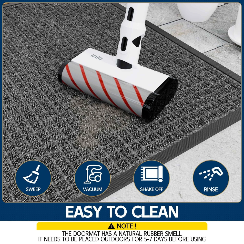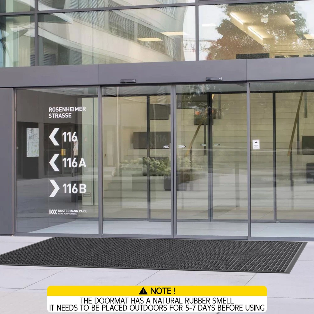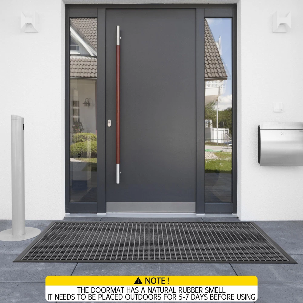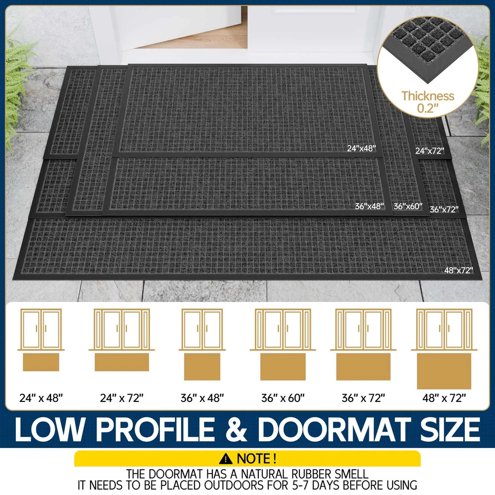 CAPTURES MUD AND MOISTURE: The surface of this entrance mat has a deep plaid design that quickly traps mud, dirt, moisture and debris deep in the grooves, keeping your home tidy in rainy and muddy weather WEATHERPROOF AND DURABLE: The entryway rug surface is made of tightly woven polypropylene material, which has good fixing and abrasion resistance, and the color will not fade even after a long time of use. Low-pile design allows easy passage even for low doors NON-SLIP BOTTOM: The bottom of the outdoor floor mat are made of natural rubber, waterproof, and wear-resistant, which keeps the mat fixed in place, Quality for outdoor use in all weather. Both safe and comfortable (Fresh rubber smell on the bottom, please leave it in a ventilated place for about 5-7 days) EASY TO CLEAN: Light dirt can be shaken off directly or cleaned with a vacuum cleaner, For deeper clean, can directly rinse with water, after rinsing, it can directly dry in the sun, and keep the bottom dry when in use LARGE DOORMAT VERSATILITY: Heavy duty doormats are perfect for high traffic areas such as entrances, outdoor patios, garages, gardens, laundries, or any outdoor space, and can also be used as a commercial doormat to keep floors clean in public places