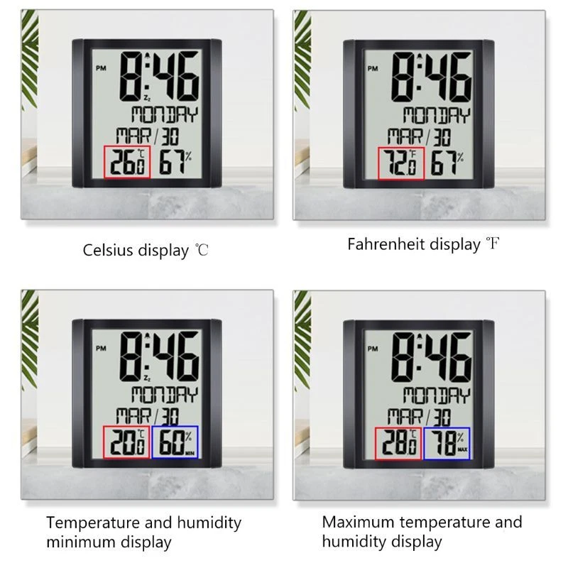 Indoor Room Electronic Temperature Humidity Meter Digital Thermometer Hygrometer Wall Clock for Extra Large Digital Display for Time Day Calendar Indoor Thermometer Hygrometer Table Desk Stand & Wall Hanging Feature: Large screen display, alarm clock function, snooze function; Indoor thermometer and hygrometer function. Specification: Product model: TS-8608 ABS+electronic components Size: 20*20*for cm/7.87*7.87" Packing size: 22.5*22.5*5cm/8.86*8.86*1.97" Colour: Black Power supply: 3 x 1.5V AAA batteries (not included), insert batteries, it will emit a beep sound and then to the standard display and display the temperature and relative humidity of INDOOR. Default display when turned on: Time: 0:00 January 1st, 2020 Week language: for Time format: 24HR Date display format: Month-Date Unit: temperature (℃), relative humidity Temperature and humidity detection instruction: INDOOR temperature detection -1~+48 ℃ (+30.2~+118.4 ℉) If the detection temperature of INDOOR is -1℃ (+30.2℉), it will display LL.L℃ & ℉; if above +48℃ (+118.4℉), HH.H℃ & ℉ Humidity of INDOOR: 20%~95% The temperature and humidity detection cycle of INDDOR is 60 seconds. When the alarm sounds, the temperature and humidity detection is not performed, and the INDOOR temperature and humidity value is not updated. If the detection humidity of INDOOR is lower than 20%, it will display 20%; than 95%, and also display 95% Notice: 1. When the characters are unclear, fuzzy, flashes madly or a symbol appears, it is recommended to replace the 2. For both table placing and wall hanging. 3. It has no backlight. 4. Week display is only available in English. Note: 1. There may be slight size due to manual measurement, different measuring methods and tools. 2. The picture may not reflect the actual color of the item because of different photographing light, and display