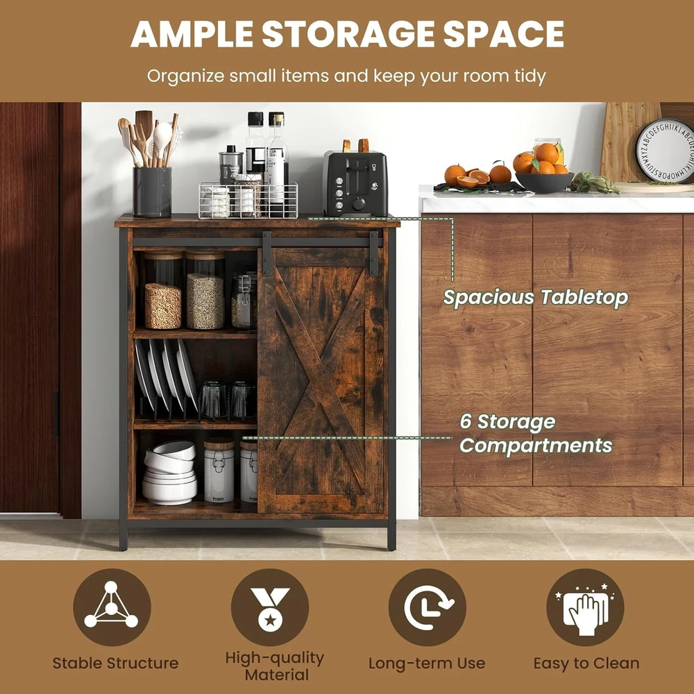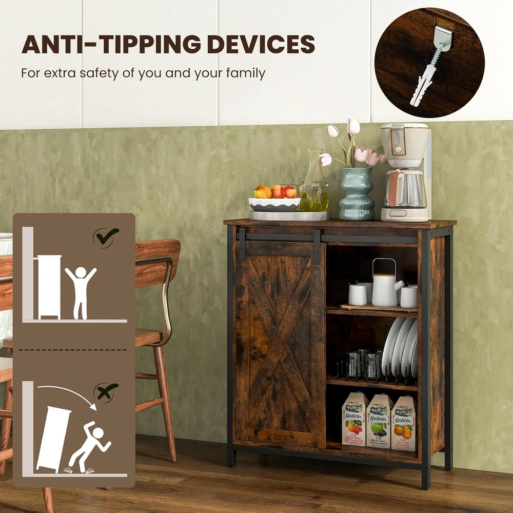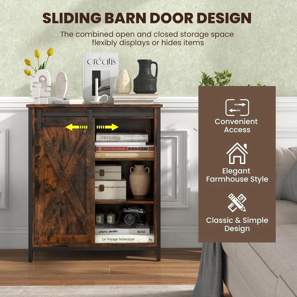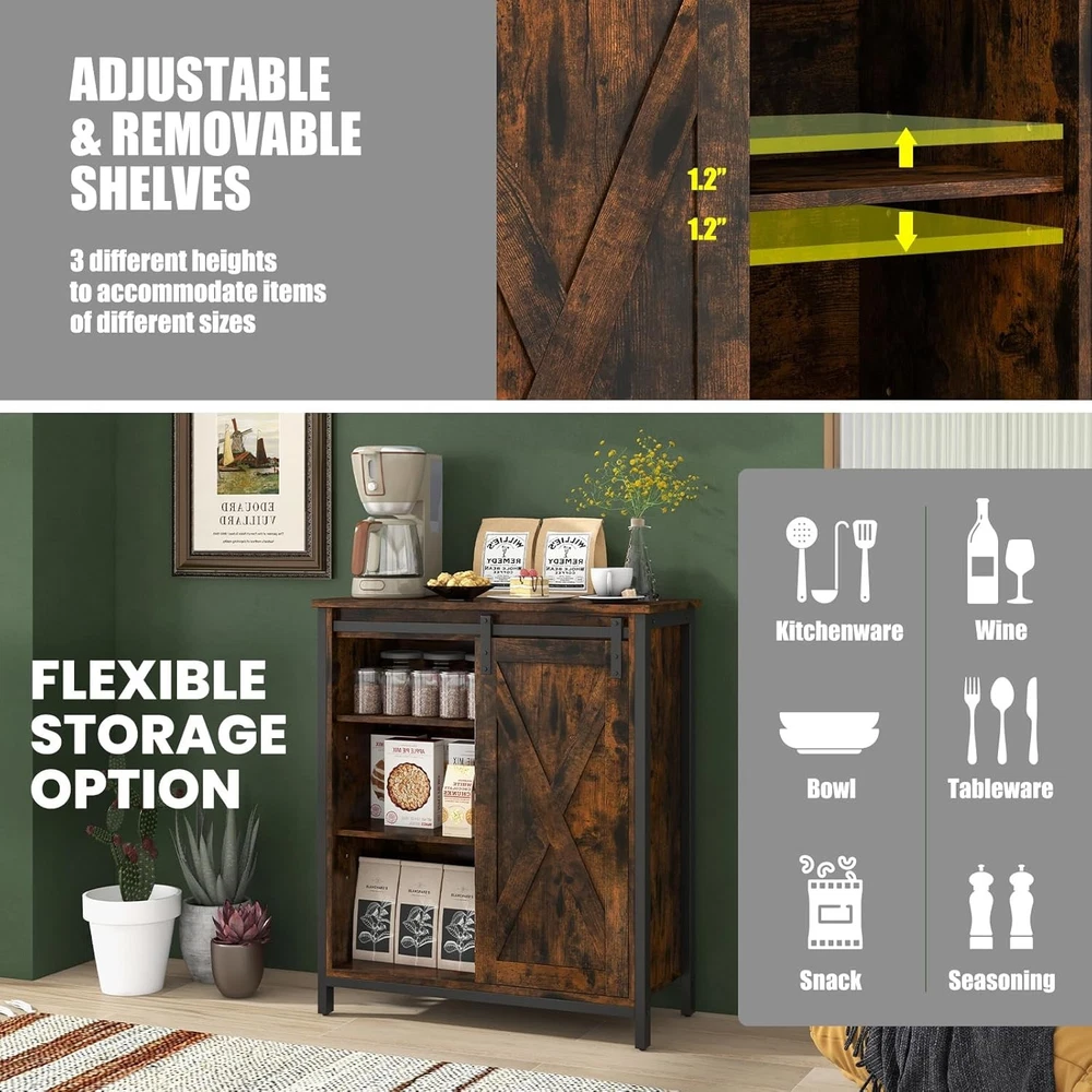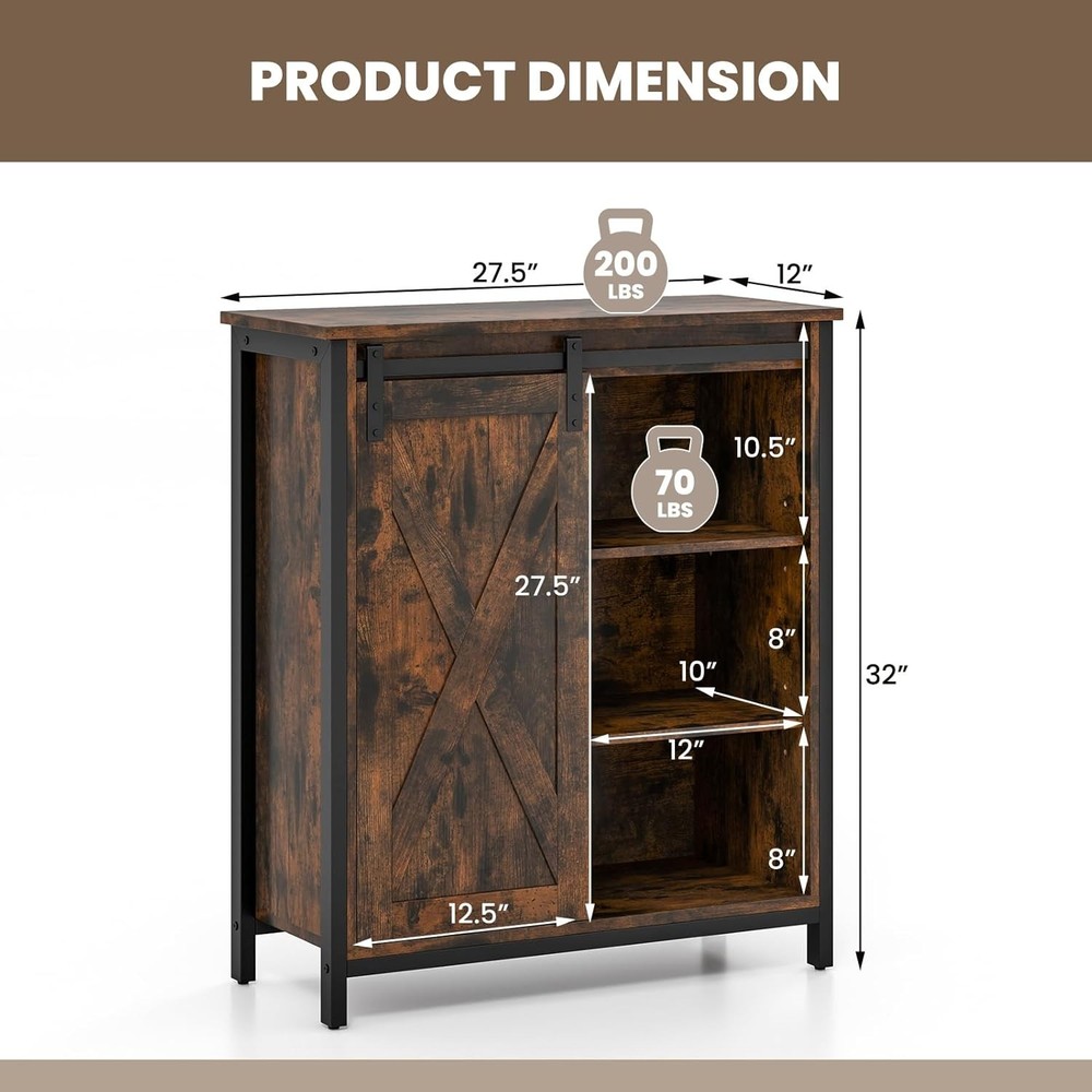 Product Description Description Our farmhouse storage cabinets are suitable for any space from the kitchen to the hallway, adding a touch of sparkle to your home.The 3-position adjustable shelves, with heights to accommodate a wide range of item sizes, ensure that your space is neat and clutter-free. The cabinets' sliding barn doors not only provide easy access, but also add a rustic aesthetic that allows you to effortlessly mix and match open and closed storage. The cabinets are made of high-grade materials and powder-coated metal frames for durability and stability. With a clean, classic design and a spacious tabletop, this cabinet blends perfectly into different home décor while providing extra space to display your favorite items. It is the ideal combination of functionality and style and is the perfect addition to enhance your living environment. Specifications: Color: Rustic Brown Material: MDF, PB, Metal Product Dimension: 27.5" x 12" x 32" (L x W x H) Size of Each Compartment: 12" x 10" x 8" (L x W x H) Sliding Door Size: 25" x 12.5" (L x W) Height of Each Compartment (from Top to Bottom): 10.5"/8"/8" Ground Clearance: 2" Weight Capacity of Top: 200 lbs Weight Capacity of Each Shelf: 70 lbs Net Weight: 38.5 lbs Package Includes: 1 x Storage Cabinet 1 x Instruction On Aug 14, 2025 at 18:32:26 PDT, seller added the following information: