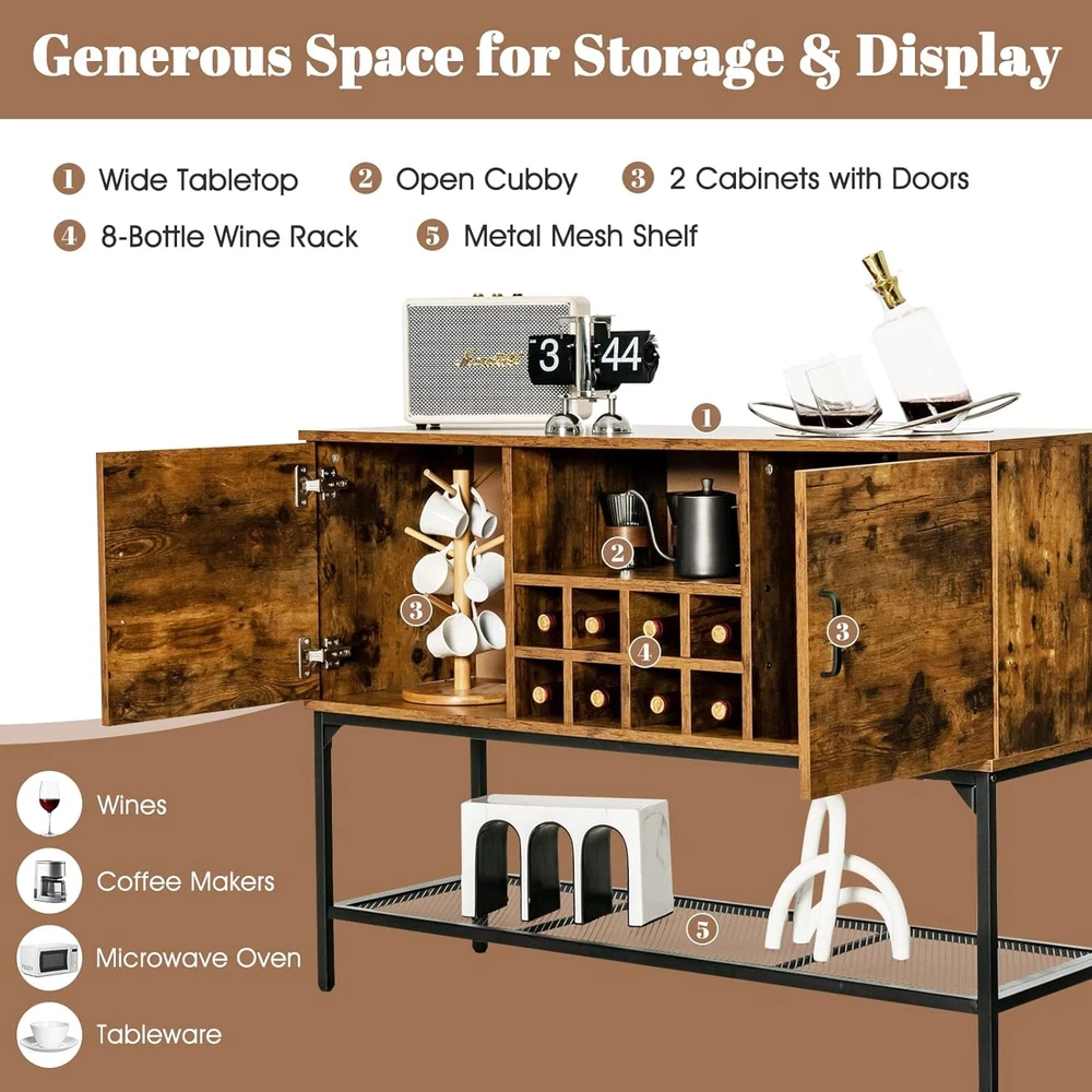 Product Description About this item [Using It as Wine Cabinet?]: Of course! The coffee bar cabinet boasts plenty of storage space, and the most particular part is the 8-bottle wine rack. There you can treasure your wine collections for a special moment to share with your family and friends! Meanwhile, you can also get 2 door cabinets, an open compartment as well as a mesh shelf for storage. [Fit It Where You Need]: With so many storage options, the buffet table will be of great help to tidy up your daily essentials, keeping chaos out of sight and bringing order back. You can put it in the kitchen or dining room for holding small appliances and tableware, or let it be in the living room or entryway for some grab-to-go items. [For Years It Still]: Be stylish and sturdy as it is first set up! The construction of thickened engineered wood and rustproof metal frame endows a large bearing capacity (up to 450lbs) to the kitchen buffet storage cabinet. Not to mention that there are reinforced features, including the triangular structure and the adjustable foot pads, to ensure superb sturdiness and stability. [Making Your Room More Welcoming]: We are dedicated to providing you with the most perfect combination of versatility and personality. With rustic brown wood grain and black metal frame, the buffet sideboard breathes a flair of natural vigor into your home, making it a warm and inviting place to live in. [Assemble with Ease]: Get relaxed! You are not helpless to assemble the buffet cabinet, since we spare no effort to make every step in the instruction easy to follow. And the accessories? They are easy to recognize with labels. If you have any problem, feel free to contact us! What We’d Like to Share: Refresh your space with this industrial bar cabinet! The collision of warm color and black frame makes the kitchen cabinet an eye-catching piece that creates a rustic and vintage atmosphere. Moreover, by providing you with various storage options open or enclosed, the buffet table is a good choice for your to build up an ideal home bistro or coffee station. The wide and flat tabletop is just appropriate for various household appliances, such as a coffee maker, while the 8 wine grids well accommodate the delicate bottles. Then, you’ll have a place to enjoy your leisure and pleasure moment and say bye-bye to chaos or trivial. Specification: Color: Rustic Brown Material: Engineered Wood + Metal Overall Dimensions: 48” x 16” x 33.5” (L x W x H) Open Compartment Dimensions: 16” x 14.5” x 7” (L x W x H) Clearance Between Cabinet and Mesh Shelf: 11” Clearance Between Floor: 4.5” Total Weight Limit: 450 lbs Weight Limit of Countertop: 140 lbs Net Weight: 68.5 lbs Package includes: 1 x Buffet Sideboard 1 x Instruction