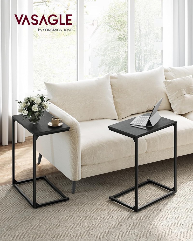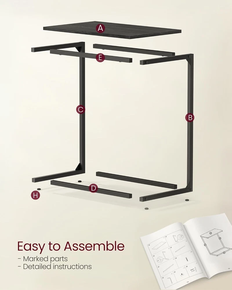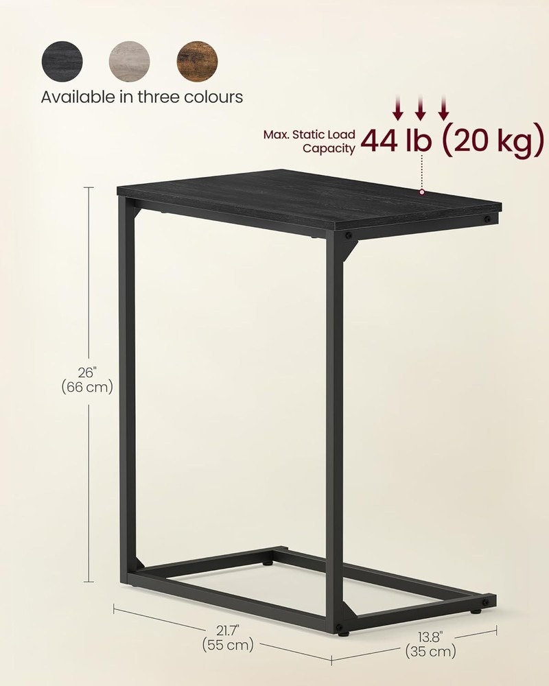 [C Shape Table]: The unique C-shaped side table have rustic brown boards and Black metal frame, Item dimensions 13.8"D x 21.7"W x 26"H [Variety of uses]: The side table can be used as an end table, couch table or bedside table in your living room or bedroom. Simply place your laptop on this table and pull it towards you [Assemble with ease]: No need to spend much time on the nuts and bolts, this laptop table comes with numbered parts and detailed instruction, will be ready for your online meeting in a moment [Adjustable feet]: This end table has adjustable feet that also compensate for unevenness, increasing the stability of the side table, and prevents the floor from being scratched. [What you get: A flexible side table that is perfect for working on the sofa or having breakfast in bed from our practical ALINRU Collection