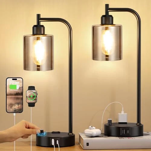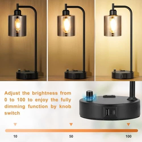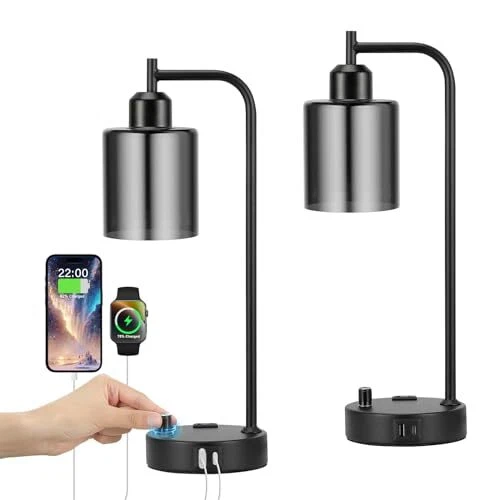 Return Policy Fast Delivery Trusted seller Industrial Desk Lamps for Office Set of 2 - Fully Dimmable Bedside Lamps with USB A C Ports and Outlet, Black Nightstand Lamps with Grey Glass Shade for Living Room, Table Lamps for Bedrooms Reading Product Description STEPLESS DIMMABLE LAMP - You can turn on/off and turn up/dim the lights by rotating the dimmer knob. The operation is simple and suitable for people of any age. Compared to 3-way dimming lamp, this bedside lamp has more brightness settings. This means that each lamp set can meet the lighting demands of various usage scenarios, such as sleeping and reading. Compared to touch lamp, the lamps have a more stable controller and you won't be troubled by frequent malfunctions of touch sensors. USB-C & USB & AC OUTLET CHARGING PORTS - Each farmhouse nightstand lamp integrates with a USB-C port, a USB port and a 2-prong AC outlet (5V/2.1A), which are available for use whether the black table lamps set of 2 are on or off. With that you'll have an easy access to charge mobile phones, tablets, kindle readers, power banks, e-watch, mini-humidifier and others. TWO 6W LED BULBS INCLUDED - You will receive two 6W E26 LED bulbs which worth $12, bonus but high quality, no flickering, no buzzing and less heat output. It has a bright light and easy on the eyes, rated to last 25,000 hours. And it is perfectly suitable to use the thomas edison lamp as bright desk lamps for home office. MODERN DESIGN FOR INDUSTRY STYLE - Adopted thick cylinder glass shade, pairs with rust-proof matte black finish iron, these rustic bedside lamps set of 2 perfectly combine a touch of vintage style with modern industry design, suitable for decorating anyw in home and office, such as bedroom, living room, dorm, guest room, kids room, and also perfect gift choice for festivals, birthday and housewarming. 'S WORK WITH SINCERITY - As a 6-year old store, we have been committed to providing customers with the most suitable lighting fixtures. The bedroom lamps for nightstand set of 2 are the modern aesthetic decor that we have newly developed to give back to our customers. We will provide you with customer service throughout the entire process, whether it is pre-sales, during sales, or after sales. If any problems arise, please contact us, we will ensure that you receive new and intact lamps! Shipping Returns Payment Shipping Shipping is FREE to all addresses other than APO/PO boxes in the lower 48 states. All our stock ships from US-based warehouses. Shipped via USPS or UPS (depending on location and package weight) Unless stated otherwise, all orders will ship within 24-72 hours of your payment being processed. Check our feedback to see the great reviews of FAST shipping we offer. Returns Seller does not accept returns Payment We currently accept payment via eBay managed payments only. Once payment is cleared, we will dispatch your shipment within 1-3 business days. Please refer to the "Shipping" tab for more information regarding shipping speed to your destination.