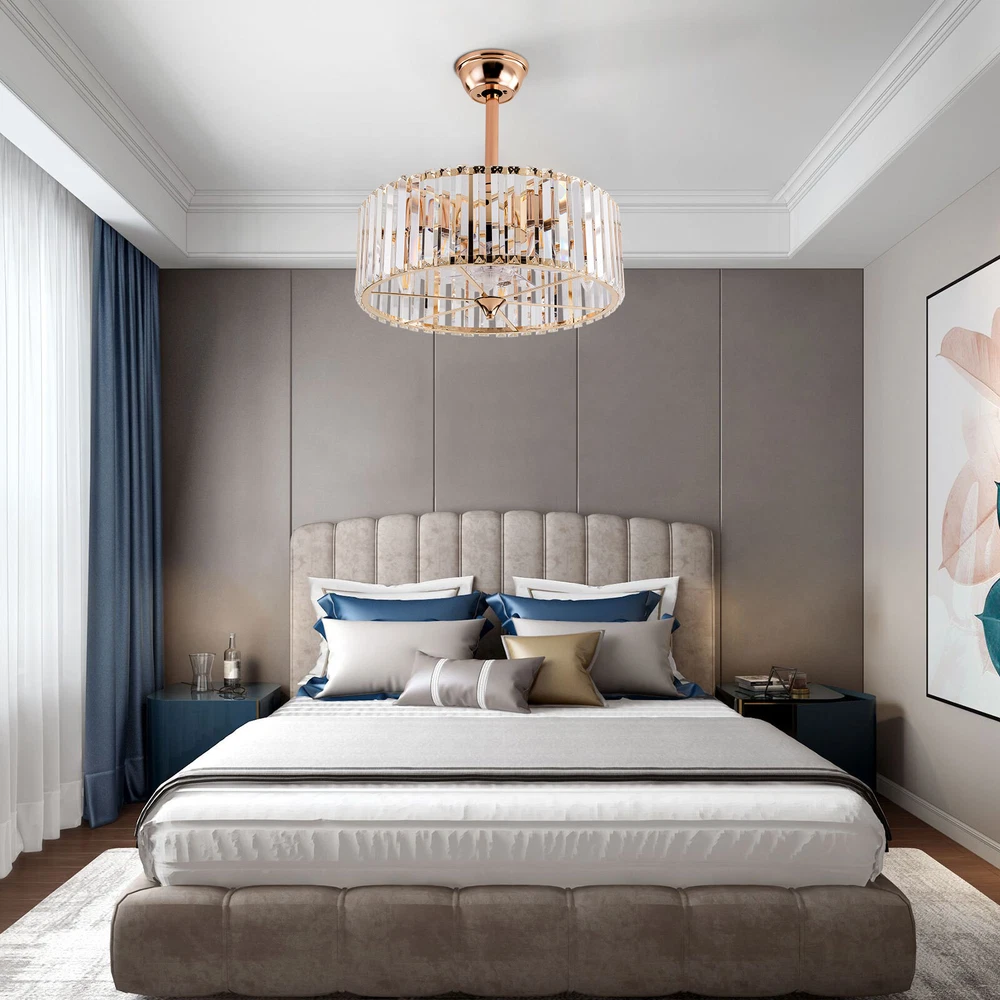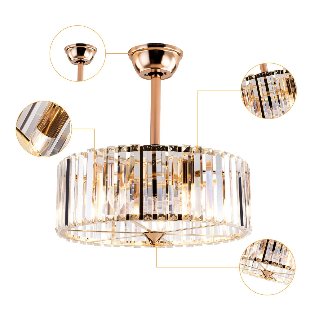 Specifications Color: Gold Material: Copper, Tempered Glass, ABS Surface Treatment: Solder Process Style: Retro Motor Type: Pure Copper&Reversible Motor Number of Fan Blades: 7 Mounting Type: Ceiling Mount Rated Voltage: 85-265V Rated Power: 40W Power Source: DC Wind Speed Gears: 6 Timing: 1/2/4h Bulb Size:5*E26/E27 (Not Included) Suitable Area: 10-15㎡/107-161ft² Electric Fan Design: Ceiling Fan Room Type: Bedroom, Living Room, Dining Room, Living Room, Kitchen Controller Type: Frequency Conversion Remote Control Efficiency: E Noise: About 40dB Base Size(L*H): 15*5cm/5.9*1.96inch Lampshade Size(L*H): 45*16.5cm/18*6.5inch Down-rod Length: 12cm/4.8inch, 25cm/9.8inch Product Height: 33.5cm/13.26inch, 46.5cm/18.26inch Package Included 1 * Ceiling Fan Light 1 *English Manual 1* Remote Control Caged Ceiling Fan with Lights Remote Control Industrial Bedroom Ceiling Fan Description This 2-in-1 ceiling fan light allows you to feel the bright light and enjoy the coolness at the same time. It has six gears of wind speeds with a timing function to meet your daily usage needs. It can be integrated with different decoration styles and is ideal to create an excellent life and sleep environment to accompany you in all seasons. Key Features Stylish Exterior: The cylindrical lampshade, retro color scheme (Gold), and delicate lines make it very luxurious, and the strips of tempered glass are like beating piano keys. It can be a good decorative piece to blend in with different decor styles and add color to your room. Great Durability : The lampshade is made of high-quality copper with a s oldering process and tempered glass with high transparency, which is heat-resistant , strong, durable, and not easy to deform. The fan blades are made of ABS, which has high strength, good toughness, and good formability, which can ensure a smooth surface and good gloss. Excellent Performance: The 7 fan blades and pure copper motor can provide strong wind, which can not only improve the air circulation in the room to keep the air fresh but also can be used with air conditioners to balance the indoor temperature. Meanwhile, the reverse function can promote heat circulation in cold winters High Safety: It is enclosed with 7 ABS blades hidden in the cage to avoid an accident caused by getting involved in the blades, so it's much safer than traditional fans to protect your family away from the fan blade's danger. 2-in-1 Function: The ceiling fan light has the function of fanning and lighting. It can not only illuminate you but also reduce heat, which can save you a lot of space. Adjustable Speed&Working Time: It has 6 gears of wind speed and you can choose low speed to enjoy the comfortable breeze or high speed to cool down quickly. Meanwhile, You can control its working hours in advance (1/2/4 hour), which can bring you great convenience. Large Applicable Area: The item can serve an area of 10-15㎡/107-161ft². So you can feel the coolness and illumination over a considerable area. Easy to Clean : The smooth and flat shell, as well as the detachable fan blades, make this product easy to clean. You only need to clean it with a dry cloth, saving you lots of time and effort. Guaranteed Customer Service: We aim to provide quality products and services. If you have problems, please feel free to contact us. We will reply and solve the problem for you as soon as possible. Details Remote Control: It allows you to remotely control the timing, wind speed, etc, saving you lots of effort. Down Rods: This product is equipped with two down-rods with different lengths for different ceiling heights. Pure Copper Motor: It has stable performance, low-temperature rise, and low noise(About 40dB), providing a quiet working and sleeping environment. Meanwhile, there are a lot of heat dissipation holes on the motor shell, which can provide a good heat dissipation effect to ensure the stable operation and long service life of the motor. Application It is suitable for the living room, dining room, kitchen, study bedroom, small bedroom, conference room, and other places of 10-15㎡/107-161ft². Payment Delivery details Terms of sales About us Contact us Payment We accept ebay payment 。 Fees such as import duties, taxes are not included in the item price or shipping costs. These charges are the buyer's responsibility. Delivery details Shipping: 2-9 working days to: USA Terms of sales We maintain high standards of excellence and strive for hundred percent customer satisfaction. Feedback is very important to us. We hope that you contact us immediately before you give neutral or negative feedback, so that we can address your concerns. It is impossible to address issues if we do not know about them! About us Your satis faction is our ultimate goal. We work hard to earn your trust and future business. Our certified technicians have tested each item before shipping. The unit comes with 1 year limited warranty on all manufacturing defects. a) If you receive a defective item, you may return it or ask for a discount. Please contact us within 14 days after you receive the package. b) What you returned must be intact and in its original packaging as re? u. Customer is responsible for shipping costs of the returned item. c) We will cover the cost of shipping back t with the shipping rate indicated in the registration page. We will send you a new unit or refund the full payment you paid. Thank you. Contact us Business Hour Business Hour: Monday To Friday: 8:30 AM to 5:00 PM (Beijing China time) Due to time zones, our reply to your questions may not be immediately. But within above working time, we will reply your email within 24 hours. If it's non-workdays, please kindly be patient and wait till Monday. Please contact us with ebay message. Please feel free to contact us if you have any questions. Monday To Friday: 8:30 AM to 5:00 PM (Beijing China time) Due to time zones, our reply to your questions may not be immediately. But within above working time, we wi