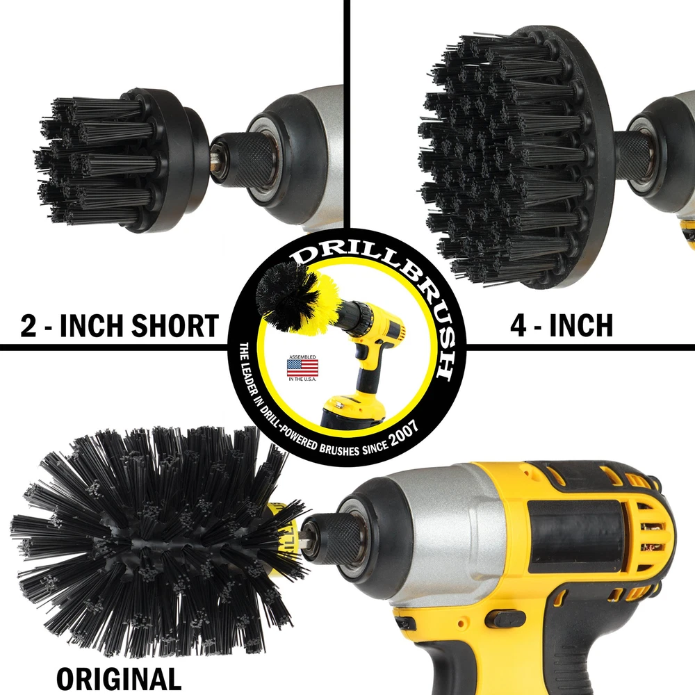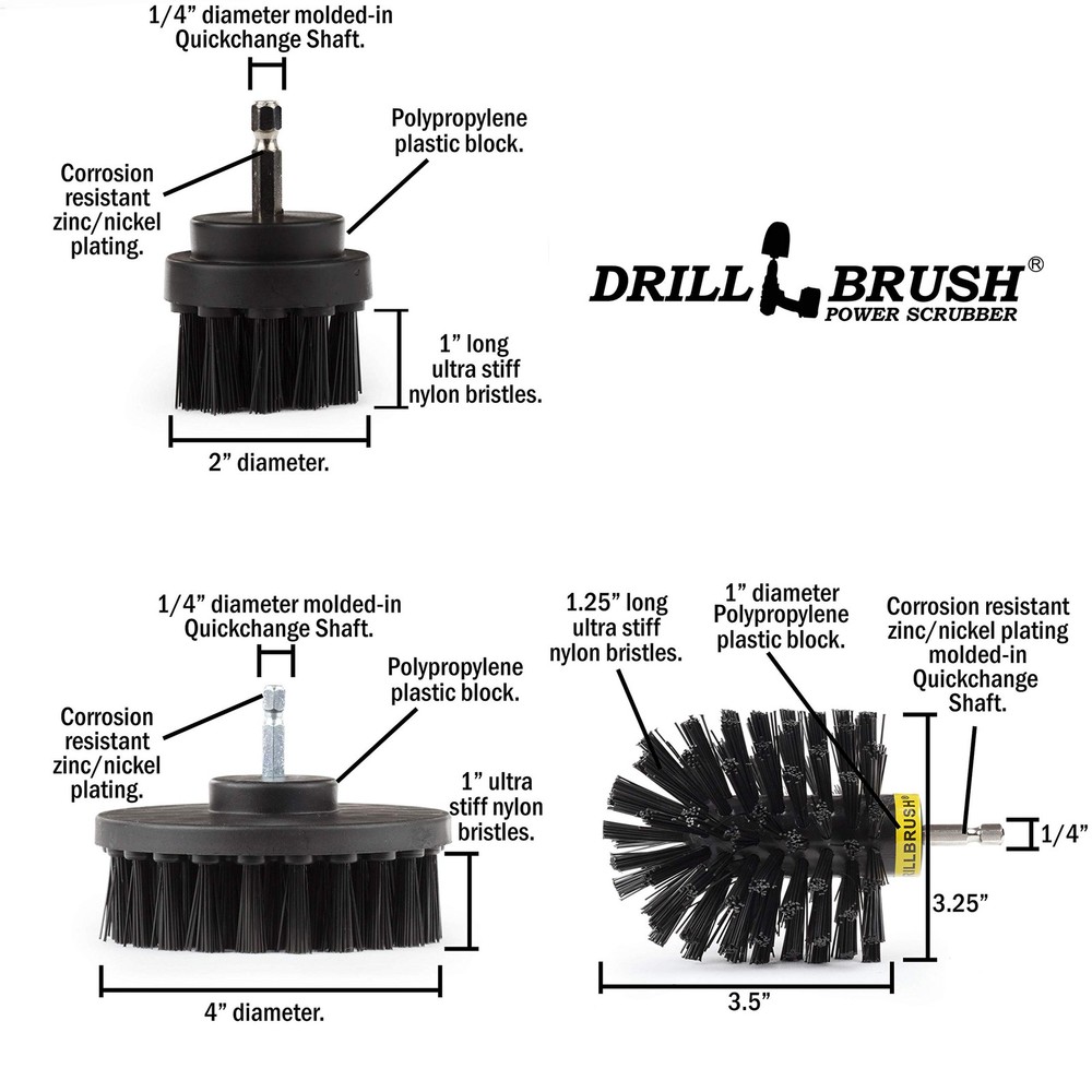 Common applications include cleaning BBQ grills, smoker grates, or oven racks of baked-on food and heavy grease deposits. Use outside for restoration of brick and mortar by removing rust, hard water or mineral stains. These brushes can also be used for industrial applications such as heavy duty stripping of loose paint and other harsh scrubbing applications. Erase stubborn painted graffiti from stone walls or metal surfaces. Clean your gas grill, smoker, oven, or grates with this no-wire kit. Our brushes have NO WIRES and are much SAFER: “A number of surgeons recommend that wire brushes not be used to clean barbecue grills. In some cases, bristles break off the brush which then become deposited in food cooked on the grill. Ingestion of these bristles can cause gastrointestinal perforation.” Modernize your arsenal of old-fashioned wire brushes that never get clean and tend to rust as well. Replace all your wire brush drill attachments with these aggressive, Ultra Stiff Black, all nylon, drill powered upgrades. No more broken and loose flying wires to deal with. All brushes feature a rugged steel, quarter-inch, quick-change shaft to fit most all drills and drivers. All Products have a 90 day no questions asked return window. If you are not completely satisfied with our product we will issue a or ship out a at the buyer's request. Cordless Drill NOT included