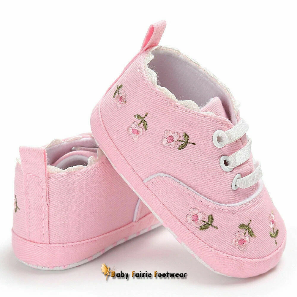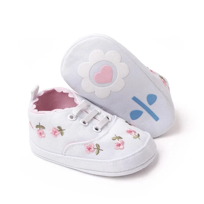 These infant baby girl sneakers are the perfect addition to your little one's wardrobe. The soft sole and elastic band closure make them comfortable for all-day wear while the floral pattern adds a touch of style. These casual shoes are suitable for all seasons and are great for pre-walkers. The cotton fabric lining and upper material keep your baby's feet cozy. CLEARANCE SOLD AS IS. DISCOLORATION ON THE BOTTOM OF THE SHOE.