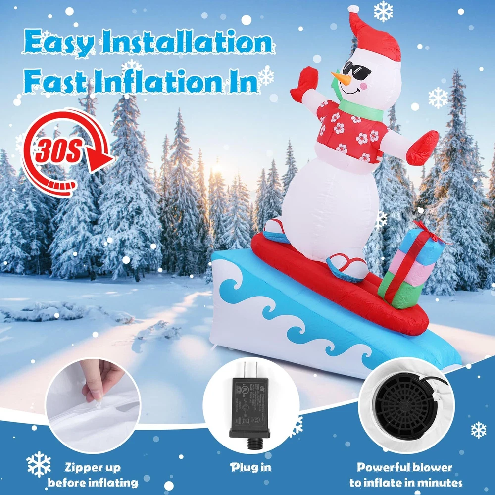 6FT Inflatable Snowman with LED Lights Surfing Snowman Blow Up Yard Decorations Xmas Decorations for Xmas Party Indoor Outdoor Home Garden Lawn Surfing Snowman Inflatable: This 6FT Christmas inflatable outdoor decoration seems to have just returned from surfing in the ocean and brought Christmas presents for you and your family, which will certainly give you, your family and guests a good mood. Your children may also hope to have a cute inflatable friend to accompany them at Christmas. This snowman inflatable is an ideal Christmas gift for kids, its vivid and funny appearance will make them love it at the first sight. Inflatable snowman with LED Lights: The built-in warm white LED lights help this Christmas decorations outside inflatable light up your garden and create a happy and warm Christmas atmosphere in the evening, which will easily catch the eyes of children, neighbors and guests. All of you can dance or talk happily in the warm light forgetting all troubles. Our light up snowman is ideal for both outdoor and indoor family Christmas party decorations to enliven the festival atmosphere. High-quality Inflatable Christmas Decorations: Made of high-quality umbrella cover fabric, this Christmas inflatables snowman can be used without worries in snowy or rainy days. With excellent stitching umbrella fabric, this inflatable christmas ornament won’t be torn apart or fade, and will accompany your family at Christmas next few years. What a perfect inflatable Christmas yard decoration. Christmas outdoor inflatables with Good Stability: There are 1 built-in sndbag, 3 6.6ft ropes and 7 stakes to help to fix the blow up snowman. You can easily install the outdoor snowman on the lawn, in the yard or in the garden. The inflatable snowman outdoor will be firmly fixed on the ground and won’t be blown down by the wind. Just let this Christmas inflatable snowman bring you laughter and joy at Christmas and enjoy a happy and wonderful Christmas party! Fast Inflation and Deflation: The snowman inflatable is quipped with a powerful air blower. Plug in and zip up, you'll see a inflatable snowman in 30s. Unplug and zip up, the snowman blow up can be quickly deflated. The 6.6ft power cord reduces the distance limit of power supply. Just feel free to have a Christmas party in the yard. Putting the Xmas inflatable snowman in front of the door of your store, shopping window will make them more eye-catching and attract more customers. Precautions: 1. Do not cover the surface of the blower during inflation. 2. Keep away from sharp objects. 3. Keep the plug and blower away from water. guarantees to serve you! If you have any questions, suggestions, ideas, please feel free to contact us!