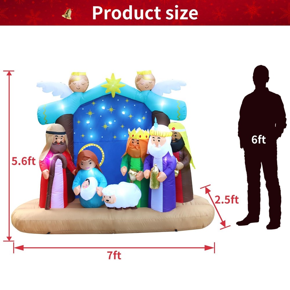 Premium Quality Fabric: Made from strong 210T polyester, ensuring long-lasting use and resistance to wear and tear. Illuminated Nativity Scene: Features 17 LED lights and a copper string light set, creating a bright and festive display that captures the essence of Christmas. Complete Setup Kit: Includes an air blower, stakes, ropes, and water bags for easy and secure setup in any outdoor or indoor space.In order to ensure smooth inflation, it is recommended to inflate at a standard voltage. Detailed Design: The nativity scene depicts the birth of Jesus, with detailed inflatable characters including Mary, Joseph, Baby Jesus, three wise men, two angels, and a sheep. Generous Size: Measures 7ft long and 5.6ft high, making it a striking and noticeable centerpiece for your holiday decorations.