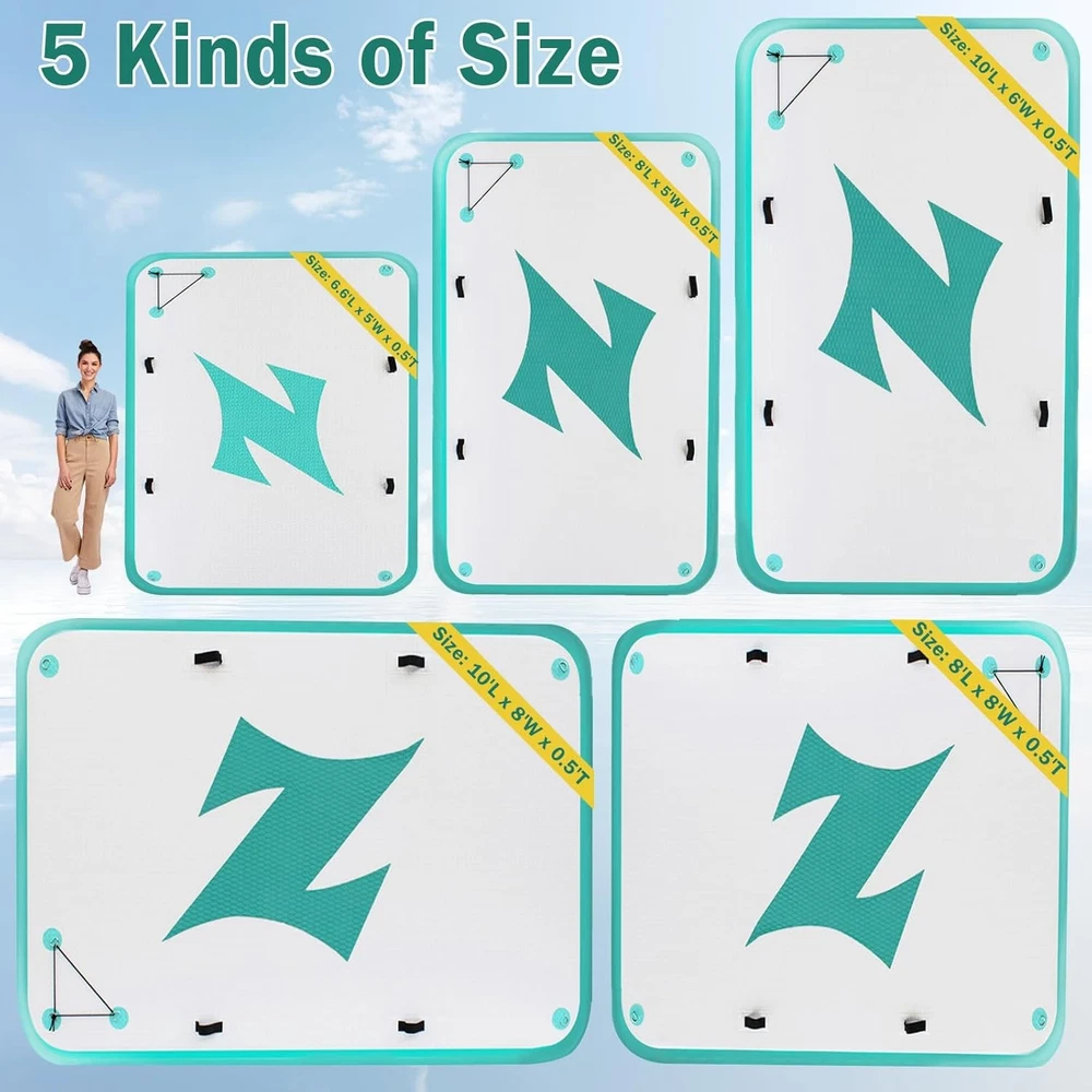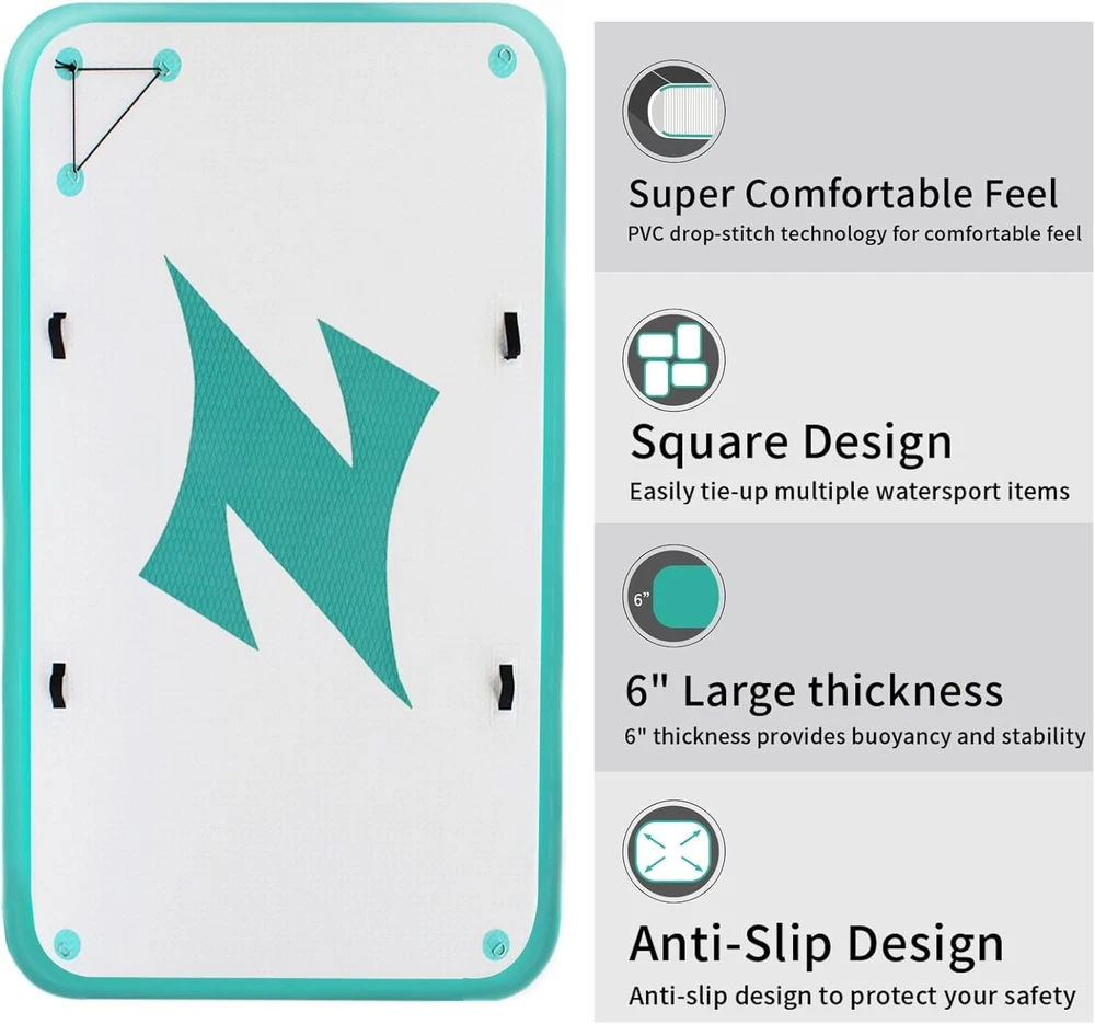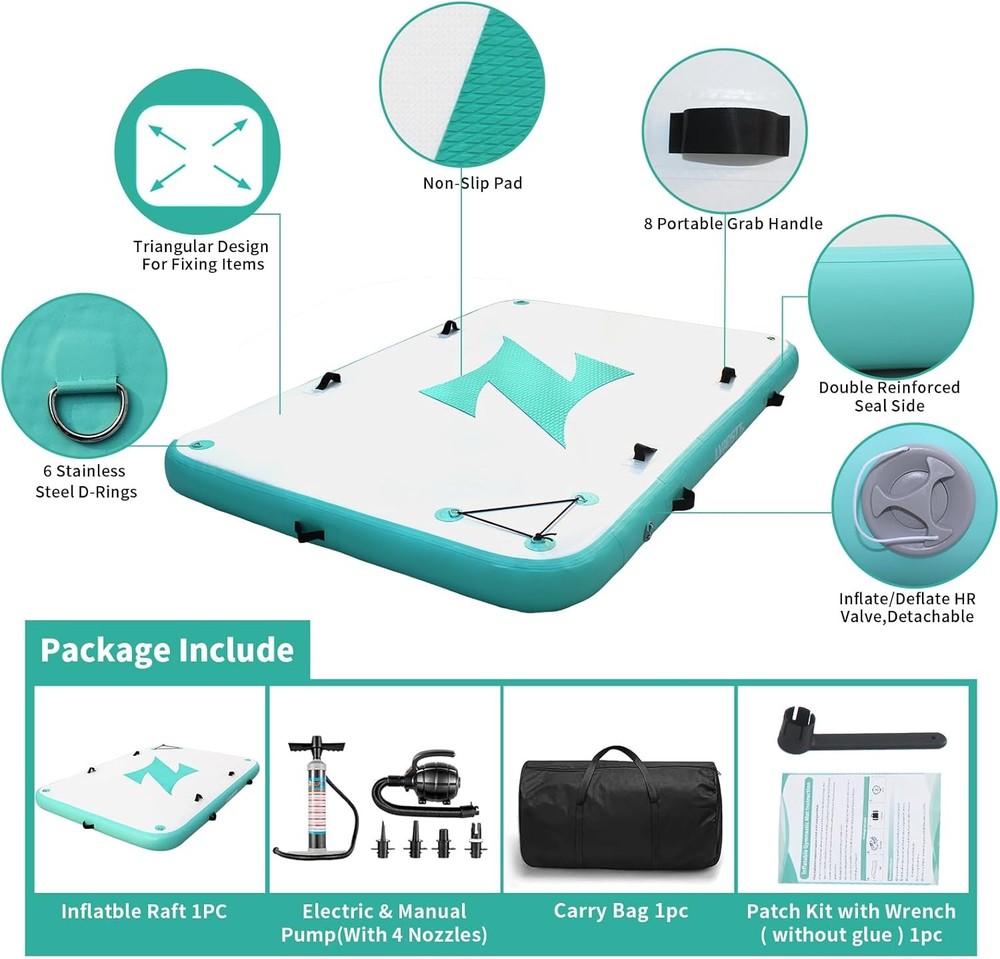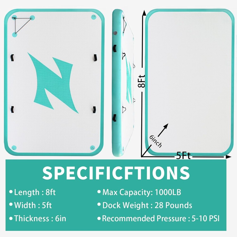 Inflatable Floating Dock Platform, 8'L x 5'W x 6"D, Mint Green Description Inflatable Floating Dock Platform, Floating Island for Lake, 6 inch Thickness, Enlarged & Non-Slip Inflatable Dock with Manual and Electric Air Pump for River, Pool, Beach, Ocean Features: Size: 8‘L x 5'W x 6"D, Weight: 32LB 【Durable/Non-SlipP/Stable】: Super-durable PVC material, double-layered 1.2mm thickness inflatable dock with enlarged and non-slip surface. No-leak after full of air, more stable and safe to protect kids or adults from falling into the water. 【Versatile Usage】: Our 6 inches thick inflatable islands make perfect giant lake inflatables dock , constructed from UV resistant high pressure layered PVC drop stitch. perfect for parties, swimming, yoga, lake lounging, tanning, getting on/off paddle boards, or as a floating deck off a boat. 【Multiple Options】: We provide 5 different size floating docks, that's mean the load capacity of them is different. For example, this floating platform size is 8*5ft, his maximum load capacity is at 500lbs, we recommend up to four adults use it at the same time. 【Thoughtful Design】: The inflatable dock is fitted with six stainless steel D-rings, using safety ropes with alloyed steel hooks to quickly connect the boat/dock; The platform has strong webbing handle on each of sides, easy to grip while in the water, makes it safer for you to play on the water. 【Easy to Operate】We provide a hand pump & an electric air pump to quickly inflate and deflate the dock for you, can use a manual inflatable pump at the beach and an electric inflatable pump at the poolside, bringing convenience to use and saving your time. In addition, the inflatable floating dock also provides a maintenance kit and a storage bag that is easy to store and carry. Product Details: Size: 8'L x 5'W x 6"D Color: Mint Green Brand: ZAFIED Material: Polyvinyl Chloride Product Dimensions: 96"L x 60"W Manufacturer: ZAFIED Weight Limit: 5E+2 Pounds Item Package Dimensions L x W x H: 22 x 15.5 x 9.5 inches Package Weight: 15.88 Kilograms Item Dimensions LxWxH: 96 x 60 x 0.04 inches Brand Name: ZAFIED Country of Origin: China Model Name: FT-8x5 Part Number: ZAF-FT-8x5 Style: 8'Lx5'Wx6"D Included Components: 1 x storage backpack, 1 x inflatable port nut adjuster, 1 x hand pump, 1 x electric air pump, 2 x PVC repair patch, 3 x inflatable adaptor nozzle Outer Material: PVC Sport Type: Boating Skill Level: Advanced Grip Type: Nylon Grip Size: 8'L x 5'W x 6"D Color: Mint Green Brand: ZAFIED Material: Polyvinyl Chloride Product Dimensions: 96"L x 60"W Manufacturer: ZAFIED Weight Limit: 5E+2 Pounds Handling We will ship all orders within 1 business day of payment. Delivery We Do Not Ship Outside of the Continental US. Return Policy All items qualify for returns within 30 days of receipt. Buyer is responsible for return shipping on any item that is not damaged. Feedback We take our reputation seriously, we buy and sell online, so we understand the value of trust. If you are unsatisfied with your order, please contact us and we will work with you to resolve it to your satisfaction.