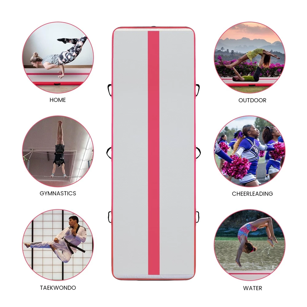 gym home air tumble track, make your gym training easier any where Home-edition gymnastic mat different size: DIFFERENCES WITH THE AIRBOARD The Airfloor is 10-15 cm high, gives more bounce . Features of Gymnastics mat : a. Set up in your living room, back yard, at the beach, anywhere, whether indoor or ourdoor. b. Easily portable from gym to gym. The Air Floor is so light and small it will easily fit on the back seat of your car. c. Inflating and deflating is done in a single minute. d. You can set the pressure to anything between rock-hard and bouncy-soft. e. Jumps can be repeated more often with less chance of overuse injuries than on traditional training equipment, martial arts, elderly gym, fitness ...AND MORE! 1. Air floor 2.Electric pump 3. Handle carry bag 【Skin-friendly and waterproof design】10ft/13ft/20ft inflatable gymnastic mats are made of filament-grade and high-quality PVC tarpaulin, which has better air tightness and durability due to the reinforcement of all seams. Compared to other sports equipment, gymnastic air cushions increase repetition frequency and reduce the chance of injury. Its 100% waterproof design can be used in swimming pools. 【Wide application 】 You can place the air floor on the artistic gymnastics floor,the gym floor, in high-performance training, fitness clubs,dance clubs, schools,gymnastic exercises,home entertainment, leisure centers, gymnasium, professional training, park or rental business. Also, it could be used on beach or water,backyard, grass land. 【Easy to store】The inflatable air tumbling mats can be fold and unfold quickly, optimum air pressure in all conditions, up to 5psi.Compared with the traditional foam-based mats, they take up much less space after deflating so the storage and transportation become pretty simple and economic. The electric air pump makes inflate easier. 【Package including 】Mat, backpack, grenade pump. 【Warranty】All air tumbling mat are backed by our 30-Day money back guarantee and 1 year product replacement warranty.