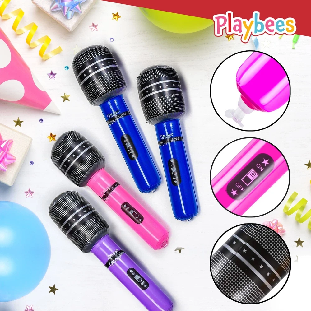 Unleash the ROCKSTAR in your kids with our karaoke-tastic inflatable microphones! Get ready for a colorful musical adventure featuring vibrant shades of blue, light blue, pink, and violet. This package comes with 12 pieces of microphone goodness, measuring a cool 10.5 inches each, and boasting an easy-grip handle for comfortable play at the beach, on road trips, or while camping out. Let the stage come alive as your little performers shine! These microphones are the ultimate props for costumes and role-playing, transforming your kids into the coolest rockstars around. Not only that, they add a magical touch to kiddie-themed parties, Halloween bashes, and all kinds of indoor and outdoor musical events. Get set for a musical extravaganza that's as easy as 1-2-3! Inflating and deflating is a breeze, making these microphones super portable and convenient. Take them on vacation, throw them in a beach bag, or make them the life of any party! Your kids can now unleash their inner idols and perform like pros, anytime, anywhere! The fun never stops with these fabulous microphones from Kicko! Fill your upcoming occasions with excitement using these delightful event supplies. They're perfect additions to party loot bags, promotional gifts, treats, and giveaways. Your little superstars will adore the endless hours of joy and laughter that await them! Safety and durability go hand in hand! Crafted from premium quality vinyl, these microphones are built to last, ready to withstand the wildest rockstar antics! Punctures and leaks are no match for their sturdy construction. 100% safe for your kids, they're the ultimate companions for never-ending fun!