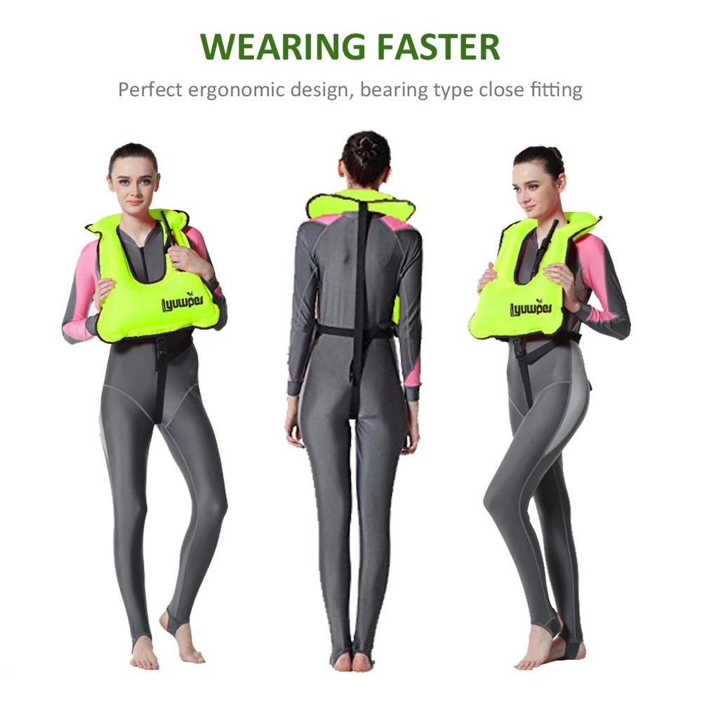 How to wear: 1.Loosen the straps to make them bigger; 2.Put your head through the hole and the crotch strap falls behind you; 3.Find the waist strap and bring it around you, secure the male buckle to the corresponding female buckle, do the same as the crotch strap; 4.Adjust the straps length to your most comfort; 5.Press down the air valve to inflate or deflate the air and when loosening your fingers, the valve will automatically lock the air in. What is the purpose: To ensure the water safety and prevent accidental events. To elevate your confidence and self-reliance in the water. Warm Tips: 1.Before the purchase, check the size chart carefully; 2.Why there is a crotch strap rather than leg strap and mesh fabric on the back? Because our goal is to maximize your exploration passion and challenge potential by wearing a diving suit without fear of direct sunlight on your back; on the contrary, leg straps can restrict your foot movements, if the size of them is not suitable, it may even strangle the skin of the thighs; alternatively, due to uncoordinated leg posture, the leg straps may break easily; and furthermore, like some styles, they rely solely on waist straps, it is difficult to control and balance the vest to ride up or slip away under the push of water waves, and it may even compress your chest until you feel suffocated and chocked. So, we apply the crotch strap, and it can effectively solve these obvious problems; 3.Do remember not to adjust the straps too loosely or too tightly. Wearing it with a wetsuits can achieve much superior comfort; 4.To grip tightly along the valve to inflate or deflate and do not shake it vigorously to avoid damaging the internal press mechanism; 5.Do remember not to inflate excessively, otherwise you will be afloat on the water rather than stay face down to snorkel. Proper buoyancy can meet your best snorkeling experience. Snorkeling Vest: small footprint, large buoyancy (from 80 to 220 lbs) while snorkeling; fluorescence colors provide excellent visibility, great for learners & swimmers Fast Inflation, Fast Deflation: snorkel vest supports the body, just right fully inflated without the need of excess air, convenient mouthpiece location Horse Collar Style Over The Neck: all snorkel vests and zippered jackets on the market adopt this design style, simple to put on and take off, very comfortable without skin abrasions, fitting well for most adults (not all adults) Adjustable Waist & Crotch Straps: latch straps vertically and horizontally, providing a secure and worry free, easy pinch buckles for fast removal Flexible, Lightweight & Compact: easy to pack, a little smart companion for journey (bonus mesh bag included) Proper Use & Warm Warning: inflatable snorkeling vest is not certified as a professional life jacket or life preserver and is just designed for leisure and other low-impact water activities. Prior to each use safe, take a test to make sure inflatable snorkel vest is inflated and deflated properly. In short, the buddy rule, never swim alone and always remember that do not rush to use it anywhere and anytime.