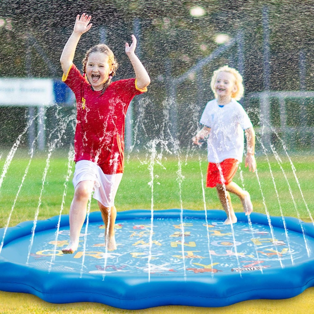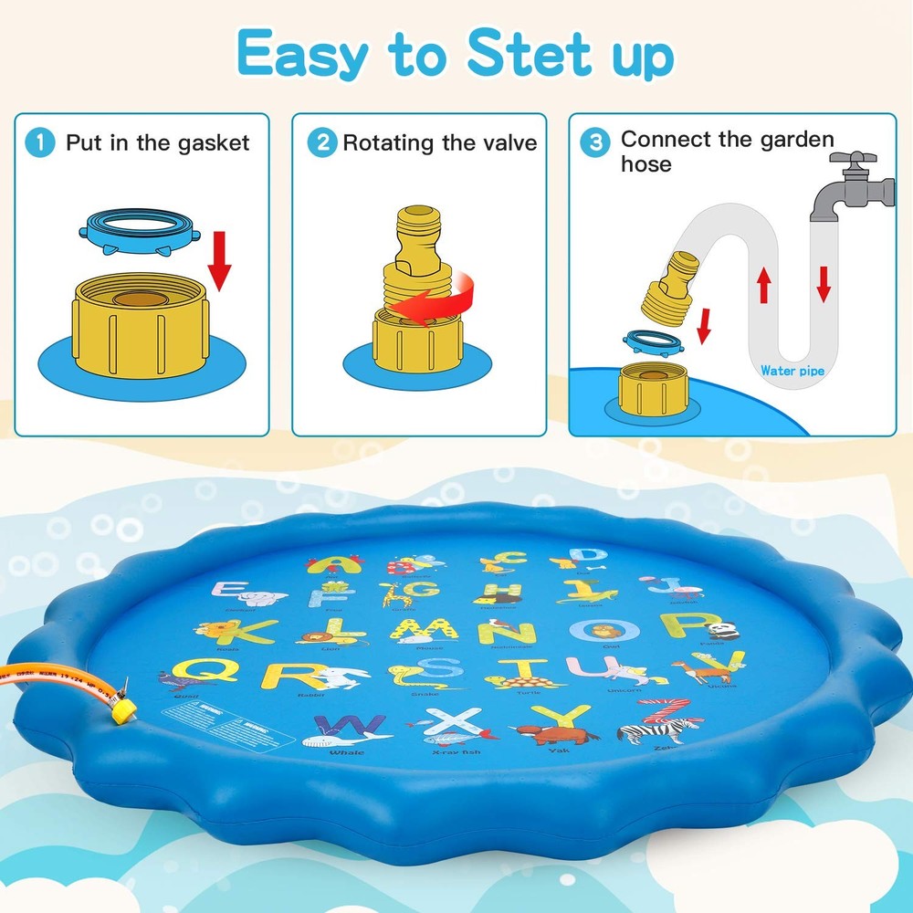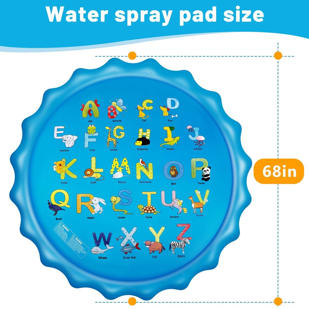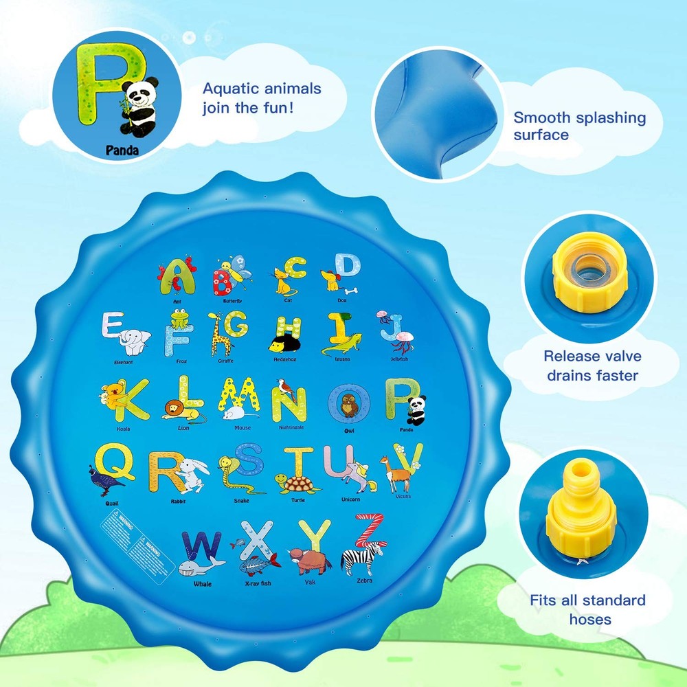 The perfect alternative to your traditional kiddie pool or sprinkler! This splash pad is a great alternative to a traditional swimming pool for kids who are not yet ready to swim. Our scientists combined the best parts of a kiddie pool, sprinkler, slip n slide, and water toys to make the most entertaining fountain spray pad for kids on the market! Complete with child-friendly features, children can safely splash in the comfort of your own backyard. Specification: Name: Water Spray Pad Material: Environmental protective and non-toxic PVC Size(about): diameter 170cm /67inch Package contains: pipe connector, water proof ring, splash pad Sets Up in Seconds 1.Put the gasket on the connector 2.Install the water pipe connector 3.Connect water pipe to the mat 4.Attach water pipe to the faucet and fill the water The water fully inflates the ring and pushes the water out through the holes around the sides of the pool. Water also collects in the middle play area. Benefits of Splash Play mat 1.Keep kids active 2.Motivate children to play outside 3.Practice sharing and playing together 4.Help fine-tune motor skills and build muscles Superior Material: Our kids water toy splash pad is made of imported heavy duty PVC material without BPA; The water injection port is designed with waterproof gasket for easier installation. Provide children with tons of fun with this splash pad--all you have to do is hook the kiddie mat up to the hose and you are ready to go Adjustable Water Height Fun: This play sprinkler pad features adjustable height.Low water pressure sprays water about 15- 30 cm in the air, while the height increases with water pressure. Water sprays inward, toward the pool area of the circle. Note: When the water pressure exceeds the normal range, water may shoot outside of the pool area Thickened Edge Wave Ring Design: Ours is a patented circular mat with a wave ring around the edge. Water fully inflates the ring and shoots out through the sprinkler holes around sides. Water also collects in the middle play area so your baby can splash in a mini inflatable baby pool Bigger 67" Splash Play Mat for More Fun: This upgraded sprinkler toy has a large diameter of 67 inches, which is suitable for up to four people within the circle. This backyard toy can be used as your mini swimming pool. The ring around the outside has small holes where the water shoots up Learning Through Play:Enjoy the “A to Z” alphabet animals while playing in the sprinkle and spray mat.This kids sprinkler pad is suitable for children 3 years of age.This educational kiddie pool and sprinkler provides your child with opportunities for learning and play in one incredible pool