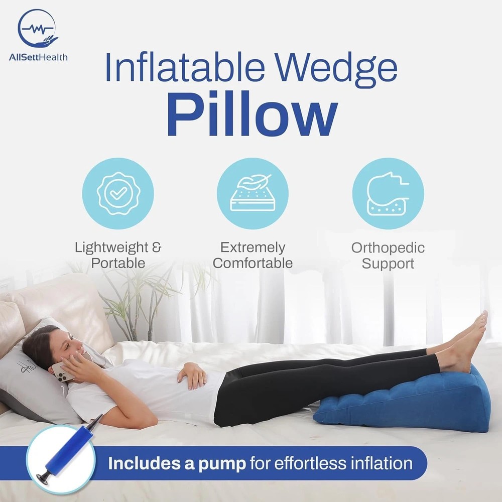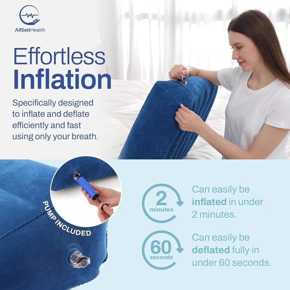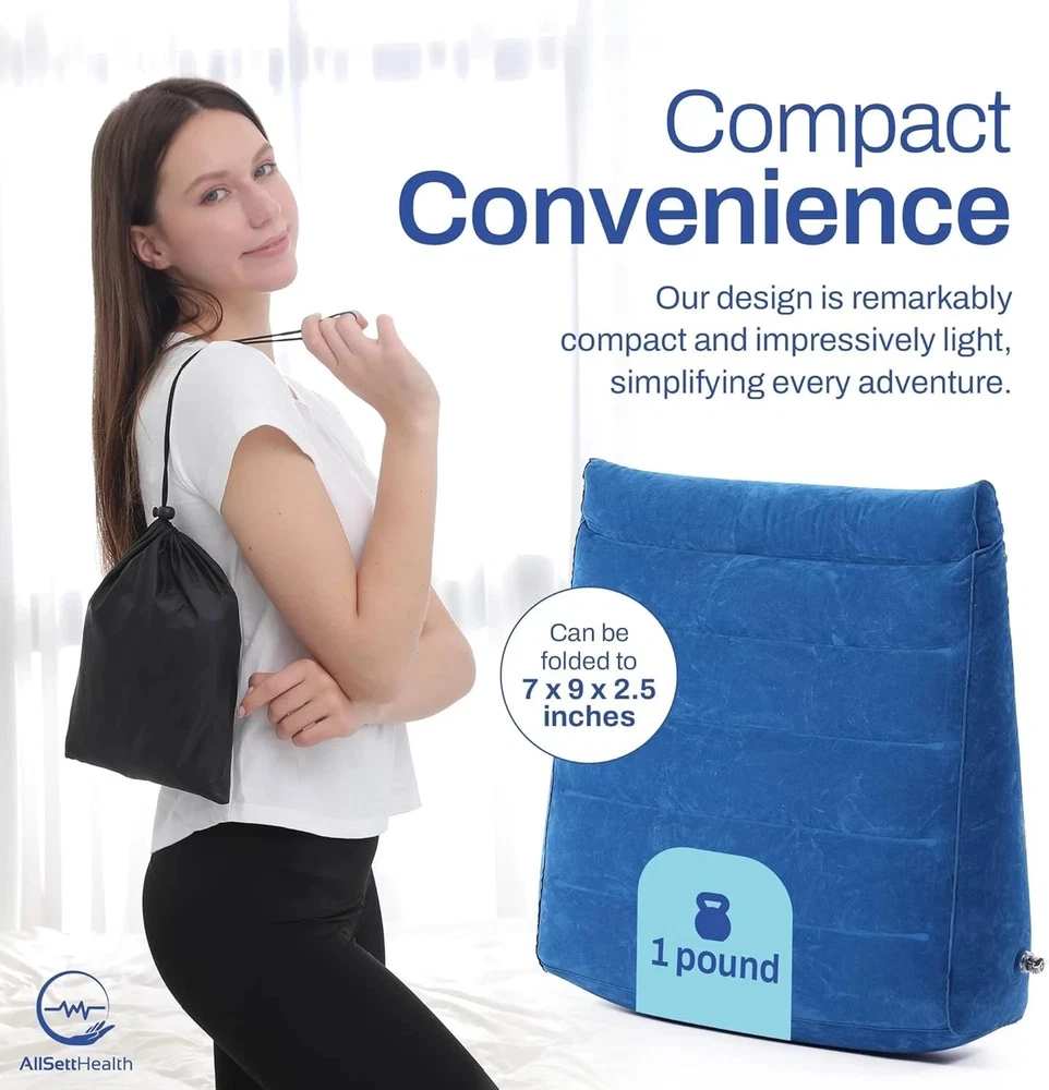 Multiused Wedge Pillow: When blowing up the inflatable wedge pillow, it assumes a triangular shape that offers a nice surface on which to support. That makes the inflatable wedge good enough for your relaxation. It lends appropriate support to your neck, knees, and back whether lying down or sitting. Alleviates a Wide Range of Problems: It's so versatile that you can use the inflatable wedge pillow in multiple ways. Moreover, the inflatable bed wedge has so many health benefits. Assists with symptoms of acid reflux, heartburn, Gerd, snoring, pregnancy, back pain, muscle aches, and more. Premium Material: The inflatable pillow wedge is made with a soft-flocked surface, it's comfortable to use as a backrest when reading or watching TV. No harmful chemicals or odor. Moreover, its premium quality material makes it very durable. Lightweight & Convenient: this wedge pillow is portable and weighs less than 1 pound with the dimensions of 21″x23″x7″when fully inflated. And comes with a great carry bag. Perfect for travelers or home use.