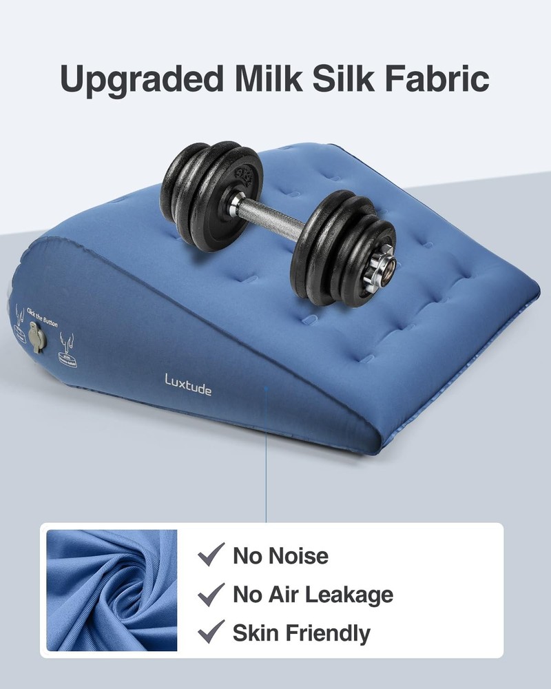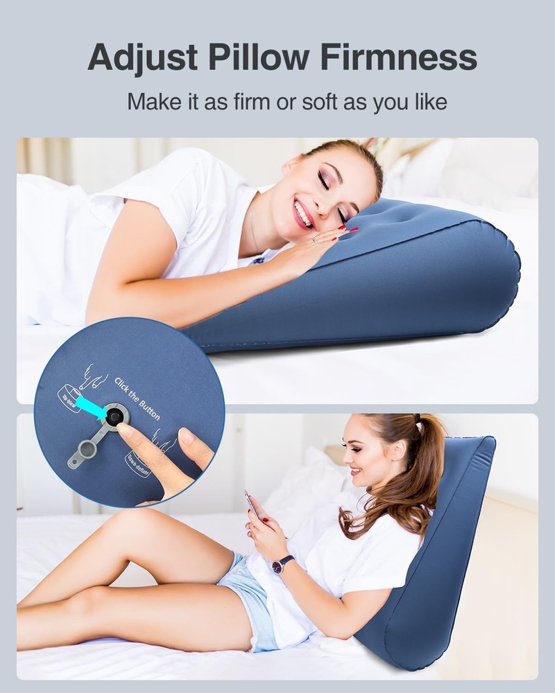Inflatable Wedge Pillow for Sleep Apnea, Travel Wedge Pillow for Back Pain , Knee Leg Elevation Pillow, Inflatable Bed Wedge Pillow for Sleeping, Back Support Pillow for Sitting Up ❤【Adjust the Firmness】: Our inflatable wedge pillow uses the Button Valve design, effectively reducing quality issues of air leakage, and its inflatable design allows you to adjust the firmness to your desired level, this ensures that you get the perfect amount of support and comfort for your specific needs ❤【Comfort & Durable】: The outer material is made of Milk Silk Fabric, more skin-friendly, soft and comfortable than PVC flocking, no friction noise, no peculiar smell, it can be cleaned easily with a damp cloth. Dot matrix exterior design can prevent the body from slipping off the bed wedge pillow while sleeping ❤【Perfect for Travel】: It is only 7x4inch, 0.88lb when folded in the carry bag, ultra small and lightweight, easy to put into your backpack or suitcase, the perfect inflatable wedge pillow for travel, a good trip starts with quality sleep ❤【Air Pump Inflation】: Suggest using an air pump (not included) to inflate this travel wedge pillow, it will be quickly inflated about 2 minutes, due to the Button Air Valve design, it is difficult to inflate by blowing with your mouth ❤【Benefits】: The wedge pillow for sleeping provides support for the back and neck, ideal for those who suffer from back or neck pain, as well as for post-surgery recovery or during pregnancy. It provides a natural solution for chronic heartburn, acid reflux and snoring, helpful to increase blood flow, promote breathing and improving sleep quality ❤【Multipurpose】: Not only for back support while lying down or sitting, but also as a leg elevation pillow, knee wedge pillow. Its unique shape makes it perfect for reading, watching TV, or lounging in couch, the great gift for people who prefer to sleep in an elevated position