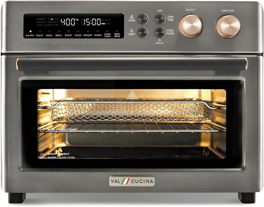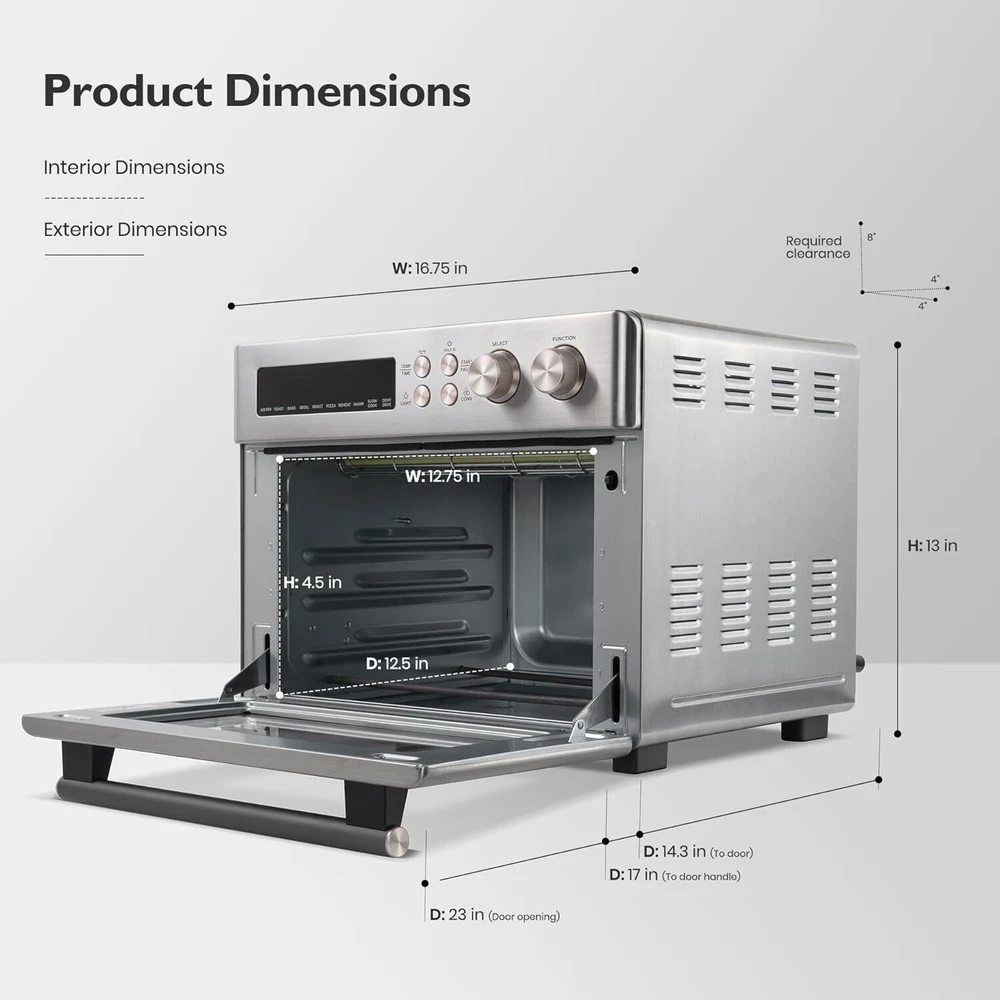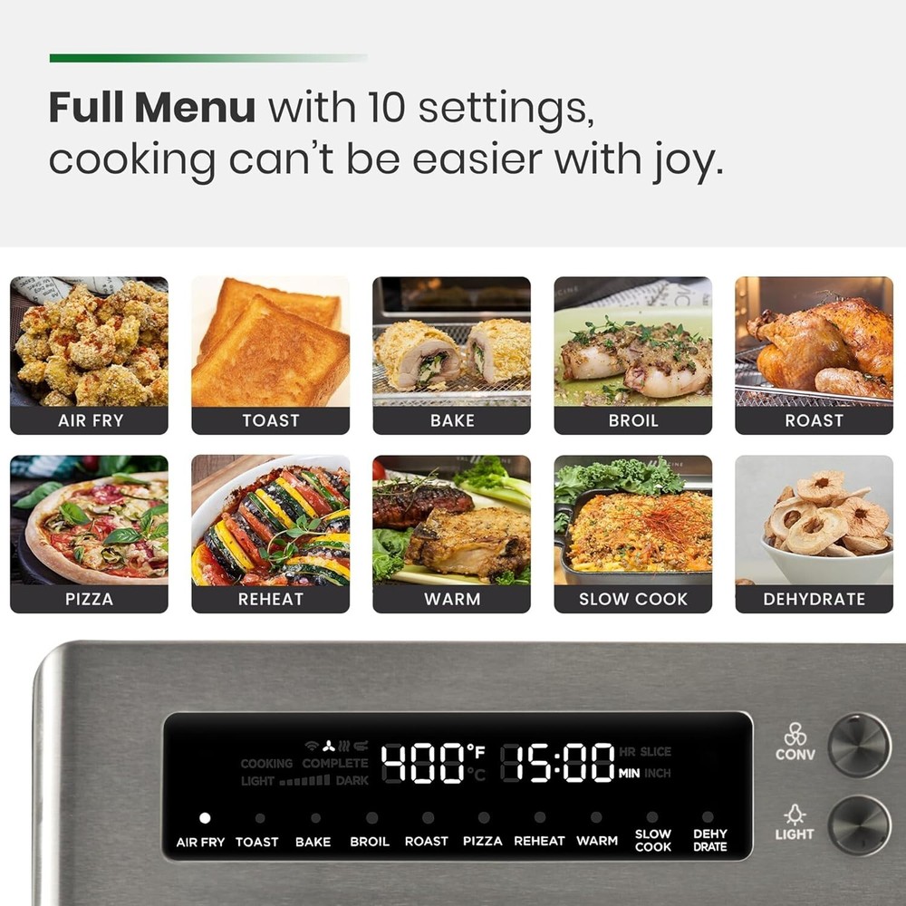 Infrared Heating Air Fryer Toaster Oven, Extra Large Countertop Convection Oven 10-in-1 Combo, 6-Slice Toast, Enamel Baking Pan Easy Clean with Recipe Book, Black Matte Stainless Steel [INFRARED HEATING + TRUE CONVECTION AIR FRY] Our cutting-edge technology features a powerful and effective heat radiation system, coupled with a high-velocity heated-air circulation, which results in a quick and deliciously flavorful brown crust while preventing food from becoming overcooked or dried out. It ensures that the interior of food remains tender and juicy, stays succulent and moist up to 35%, providing a perfect balance of texture and taste. [SUPER VERSATILE “10-in-1” AIR FRYER CONVECTION TOASTER OVEN] Unlike typical air fryer or oven with a single function, we take it up a notch by offering 10 preset digital functions that include Air Fry, Toast, Bake, Broil, Roast, Reheat, Warm, Slow Cook, and Dehydrate. This versatile 10-in-1 combination allows you to prepare a variety of dishes with ease and convenience, making your cooking experience more enjoyable than ever before. [FAMILY & PARTY SIZE CAPACITY] stands out on the market with a 30%-60% larger capacity. You can easily roast a 5-6lb chicken, toast 6 slices of bread, cook a large batch of French fries, 20 chicken wings, or bake a 12-inch pizza, all in one go. This larger capacity is perfect for families, entertaining, or meal prepping, making it a versatile and essential addition to any kitchen [CRUNCHY and HEALTHY COOKING EXPERIENCE]Our Air Fry feature is a healthier alternative to traditional frying, reducing fat by up to 75%. Enjoy all your favorite foods guilt-free, including deep-fried favorites like fries. With intensive and efficient infrared heating combined with true convection, our air fryer toaster oven delivers perfectly crispy and golden results every time. This delivers an exquisite blend of texture and flavor, ensuring a superb culinary experience. [FAST, SAFE & EASY to USE] With 1750W of power and six heating elements, the Air Fryer toaster oven cooks 40% faster than traditional ovens. The even distribution of heat reduces preheating time by up to 30%, saving your valuable time in the kitchen. Our user-friendly digital display and analogue controls make cooking effortless and enjoyable. countertop oven boasts a variety of accessories: an Enamel Baking Tray, Wire Rack, Air Fryer Basket, Crumb Tray.