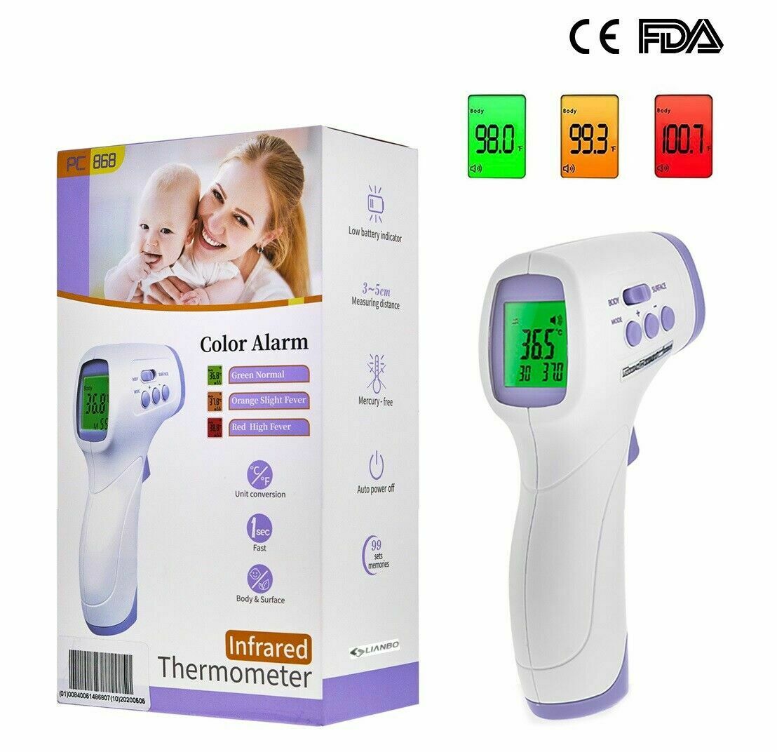 BRAND NEW PRODUCT, USA INVENTORY, WILL SHIP WITHIN 1 BUSINESS DAY. FDA Certified Reg #880.2910 NON CONTACT VERY ACCURATE - Digital thermometer for body or surfaces in C° or F° READS FOREHEAD OR SURFACES - Medical infrared thermometer EASY TO READ WITH BACKLIGHT - Large LCD display for easy to read quick results HIGH BODY TEMP ALERT - Built in fever alert alarm. 3 color display temperature range readings. 86.0-99.3 F° Green, 99.5-100.2 F° Orange, 100.4-109.4 F° Red