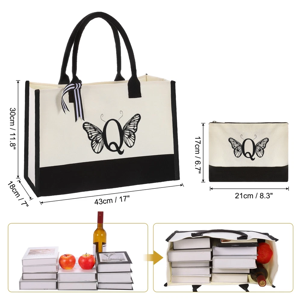 Document Large Capacity Tote Bag: You will receive a personalized canvas tote bag with the letter Q and a cosmetic bag. The tote bag is 43 x 18 x 30 cm / 17 x 7 x 11.8 Inch (L*W*H), which is spacious enough to be used as a grocery bag, shopping bag, beach bag and travel tote, and can accommodate laptops, clothes, cosmetics, books and other daily necessities.Easy to Carry: The tote bag is lightweight and equipped with sturdy handles that can be comfortably clamped on the shoulder, allowing easy access to your water bottle, sunglasses, umbrella, etc. In addition, the cosmetic bag is 21 x 7 x 17 cm / 8.3 x 2.72 x 6.7 inches(L*W*H), can carry toiletries, wallets, card holders, keys and other valuables at any time when traveling or on business trips. It can also be folded and stored in the pocket when not in use.Sturdy and Durable:The reusable shopping bags are of suitable size, made of good-quality thick canvas material, with PVC coated moisture-proof lining inside, and carefully sewn with dense stitching, ensuring that the bags remain intact and sturdy even under heavy loads, not easy to break, and can be reused for a long time.Stylish and Personalized:These bags are personalized with letters and exquisite patterns, and also come with a ribbon bow, which fits all your dressing styles and adds beauty to you. Our stylish bags for women are made of friendly materials and are easy to hand wash to clean. These bags are enough to meet most of your daily needs, and are also perfect to be used as gift bags during large events, festivals or parties.Personalized Gifts for Women: Reusable beach tote bag can be a good gift for teachers, ladies, girlfriend, wife, mother, and sister, such as a wedding gift, birthday gift, Thank you gift, Christmas gift and so on. Initial Q Canvas Tote Bag with Makeup Bag, Reusable Beach Tote Bag Large Capacity Tote Bag: You will receive a personalized canvas tote bag with the letter Q and a cosmetic bag. The tote bag is 43 x 18 x 30 cm / 17 x 7 x 11.8 Inch (L*W*H), which is spacious enough to be used as a grocery bag, shopping bag, beach bag and travel tote, and can accommodate laptops, clothes, cosmetics, books and other daily necessities. Easy to Carry: The tote bag is lightweight and equipped with sturdy handles that can be comfortably clamped on the shoulder, allowing easy access to your water bottle, sunglasses, umbrella, etc. In addition, the cosmetic bag is 21 x 7 x 17 cm / 8.3 x 2.72 x 6.7 inches(L*W*H), can carry toiletries, wallets, card holders, keys and other valuables at any time when traveling or on business trips. It can also be folded and stored in the pocket when not in use. Sturdy and Durable: The reusable shopping bags are of suitable size, made of good-quality thick canvas material, with PVC coated moisture-proof lining inside, and carefully sewn with dense stitching, ensuring that the bags remain intact and sturdy even under heavy loads, not easy to break, and can be reused for a long time. Stylish and Personalized: These bags are personalized with letters and exquisite patterns, and also come with a ribbon bow, which fits all your dressing styles and adds beauty to you. Our stylish bags for women are made of friendly materials and are easy to hand wash to clean. These bags are enough to meet most of your daily needs, and are also perfect to be used as gift bags during large events, festivals or parties. Personalized Gifts for Women: Reusable beach tote bag can be a good gift for teachers, ladies, girlfriend, wife, mother, and sister, such as a wedding gift, birthday gift, Thank you gift, Christmas gift and so on. Hot Item Payment 1.We accept eBay payment . 2.Payment must be received within 7 business days of auction closing. Shipping 1.We ship to your eBay or Paypal address. Please make sure your eBay and Paypal address is correct before you pay. 2.Items will be shipped within 1-3 business day when we received payment. 3.Delivery time depends on destination and other factors. Description Policy Initial Q Canvas Tote Bag with Makeup Bag, Reusable Beach Tote Bag Large Capacity Tote Bag: You will receive a personalized canvas tote bag with the letter Q and a cosmetic bag. The tote bag is 43 x 18 x 30 cm / 17 x 7 x 11.8 Inch (L*W*H), which is spacious enough to be used as a grocery bag, shopping bag, beach bag and travel tote, and can accommodate laptops, clothes, cosmetics, books and other daily necessities. Easy to Carry: The tote bag is lightweight and equipped with sturdy handles that can be comfortably clamped on the shoulder, allowing easy access to your water bottle, sunglasses, umbrella, etc. In addition, the cosmetic bag is 21 x 7 x 17 cm / 8.3 x 2.72 x 6.7 inches(L*W*H), can carry toiletries, wallets, card holders, keys and other valuables at any time when traveling or on business trips. It can also be folded and stored in the pocket when not in use. Sturdy and Durable: The reusable shopping bags are of suitable size, made of good-quality thick canvas material, with PVC coated moisture-proof lining inside, and carefully sewn with dense stitching, ensuring that the bags remain intact and sturdy even under heavy loads, not easy to break, and can be reused for a long time. Stylish and Personalized: These bags are personalized with letters and exquisite patterns, and also come with a ribbon bow, which fits all your dressing styles and adds beauty to you. Our stylish bags for women are made of friendly materials and are easy to hand wash to clean. These bags are enough to meet most of your daily needs, and are also perfect to be used as gift bags during large events, festivals or parties. Personalized Gifts for Women: Reusable beach tote bag can be a good gift for teachers, ladies, girlfriend, wife, mother, and sister, such as a wedding gift, birthday gift, Thank you gift, Christmas gift and so on. Hot Item Payment 1.We accept eBay payment . 2.Payment must be received within 7 business days of auction closing. Shipping 1.We ship to your eBay or Pay