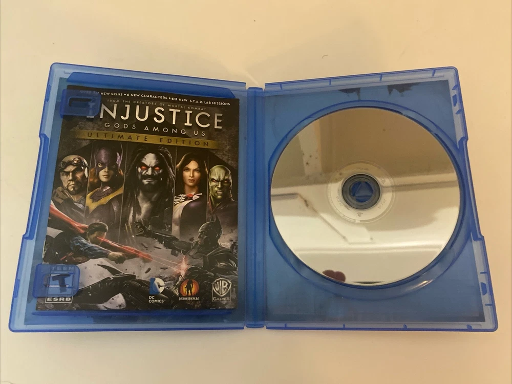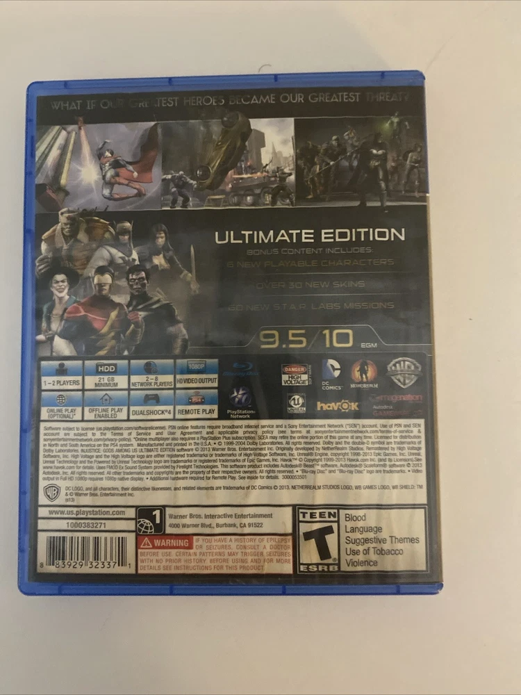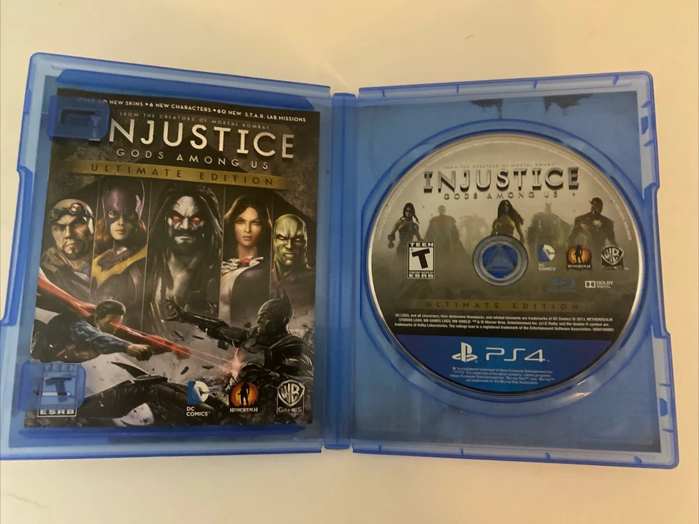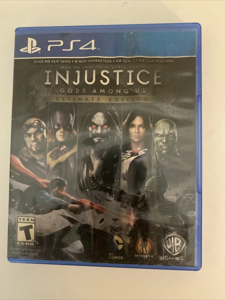 The product is "Injustice: Gods Among Us -- Ultimate Edition" for Sony PlayStation 4, released in 2013. It is a fighting game published by Warner Bros. The game features an Ultimate Edition and is rated T for Teen.