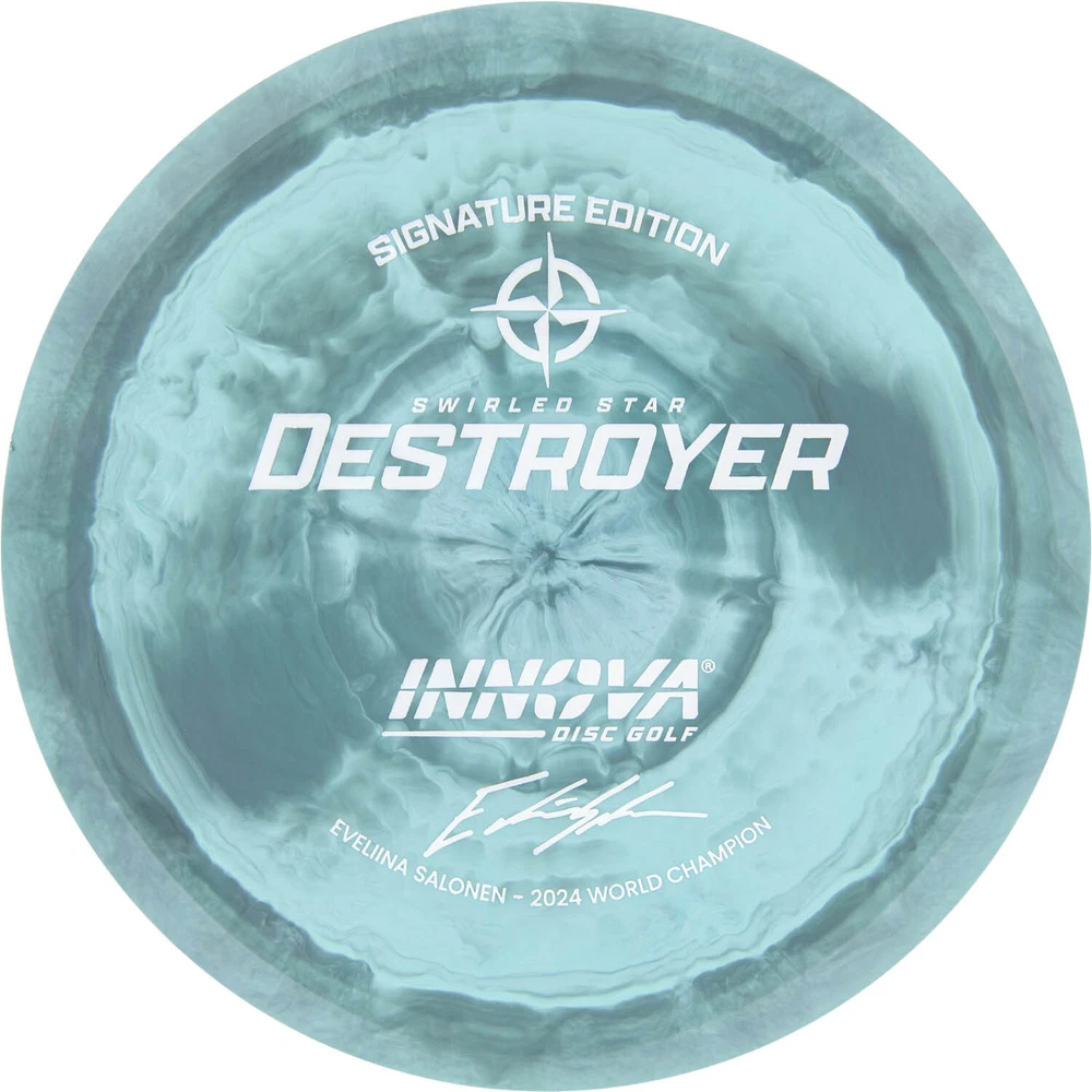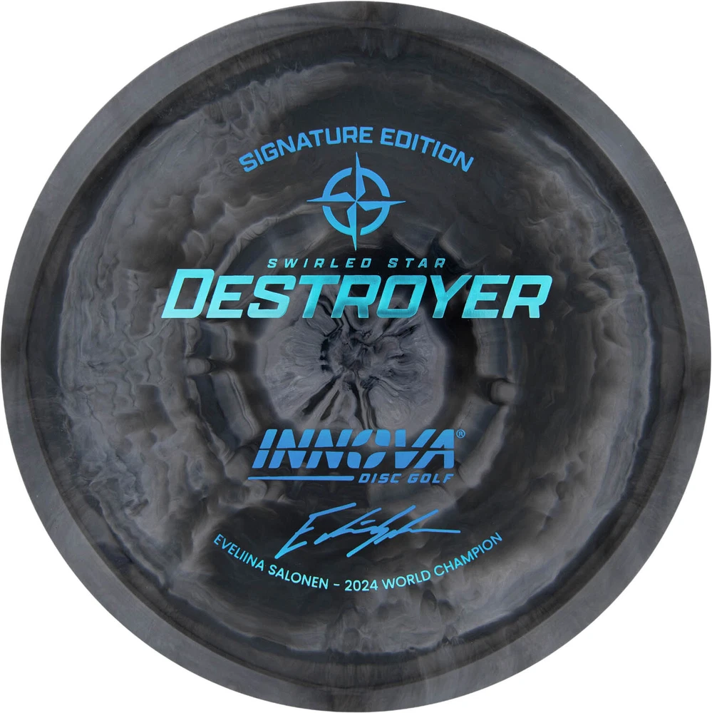 Please Note: Stamps colors and the exact hue of the disc color will vary from sample images. Eveliina Salonen confirmed she’s a world class disc golfer with her World Championship win. Show your support for her and the unrivaled Star Destroyer with this special signature edition. How the Destroyer flies: The Destroyer is a very fast, very overstable distance driver meant for advanced players. Thrown with the proper amount of power, the Destroyer disc flies straight followed by a slight turn for incredible distance until its mighty fade brings it back to the ground. Eveliina does it! Arguably the best driver in the women’s game, Eveliina’s accurate long throws were on full display in Lynchburg, VA. She unquestionably outdrove the competition to land her, her first World Championship, which was the first for her home country of Finland, too. Star Destroyer Flight numbers: 12 / 5 / -1 / 3 Star plastic: This is the plastic the Destroyer won the world over with and what you'll find in the bag of countless professional disc golfers. Star plastic gives you incredible durability while maintaining a grippy feel in the hand.