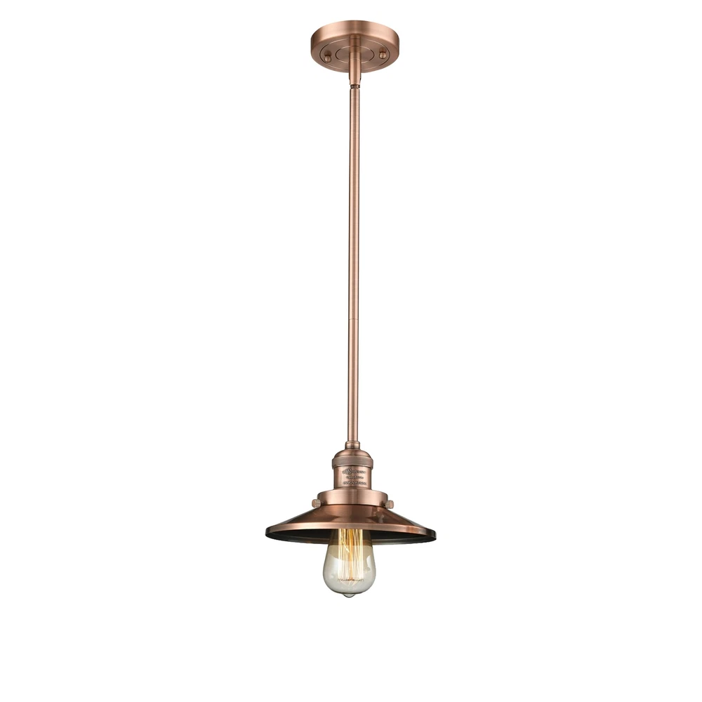 One of our largest and original collections, the Franklin Restoration is made up of a vast selection of heavy metal finishes and a large array of metal and glass shades that bring a touch of industrial into your home.This stem hung fixture Includes 10 feet of wireIncludes one 6 inch and two 12 inch stems. Additional 3, 6 & 12 inch stems sold separately as part numbers ST-3-AC, ST-6-AC and ST-12-ACSolid brass 90 degree hang straight swivel for sloped ceilings included4.5 inch 2mm heavy cast canopyThe interior finish of the shade matches the exterior finish of the shadeRated for 100 watt maximumUL/CUL and ETL/CETL damp ratedCompatible with incandescent, LED, fluorescent and halogen bulbsMinimum Height: 14.5 inchesMaximum Height: 38.5 inchesWeight: 2.7 poundsSloped Ceiling Compatible: Free Shipping Over $49.99* Details Innovations Lighting Franklin Restoration Railroad - 1 Light 8" Stem Hung Mini Product Description: One of our largest and original collections, the Franklin Restoration is made up of a vast selection of heavy metal finishes and a large array of metal and glass shades that bring a touch of industrial into your home. This stem hung fixture Includes 10 feet of wire Includes one 6 inch and two 12 inch stems. Additional 3, 6 & 12 inch stems sold separately as part numbers ST-3-AC, ST-6-AC and ST-12-AC Solid brass 90 degree hang straight swivel for sloped ceilings included 4.5 inch 2mm heavy cast canopy The interior finish of the shade matches the exterior finish of the shade Rated for 100 watt maximum UL/CUL and ETL/CETL damp rated Compatible with incandescent, LED, fluorescent and halogen bulbs Minimum Height14.5 inches Maximum Height38.5 inches Weight2.7 pounds Sloped Ceiling CompatibleYes Shade Dimensions8 inch length x 8 inch width x 2 inch height. Socket Quantity1 Bulb ShapeST64 Socket TypeMedium Base Lamp Type DetailsBB-60-A Light Bulb IncludedNo Fixture DimmableYes