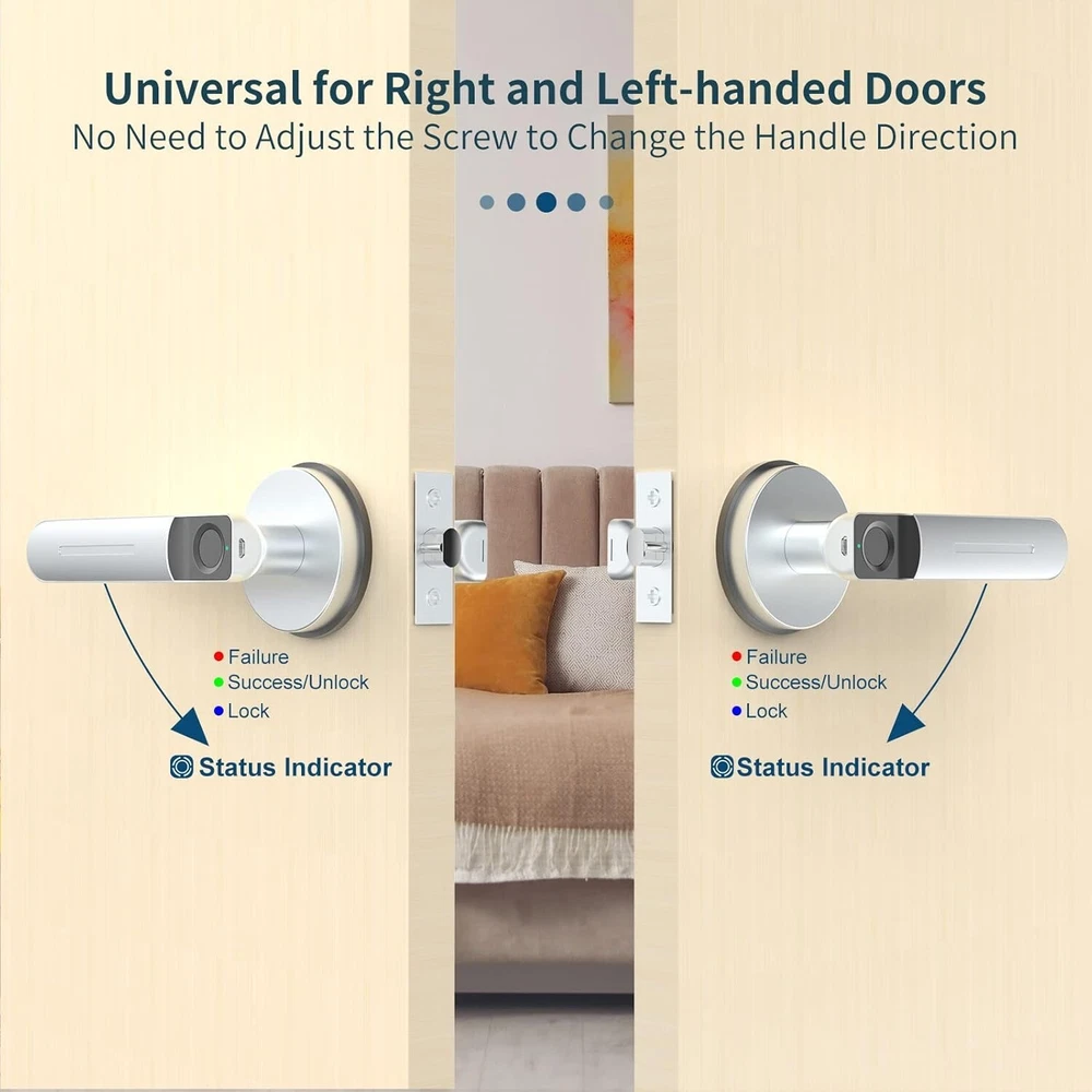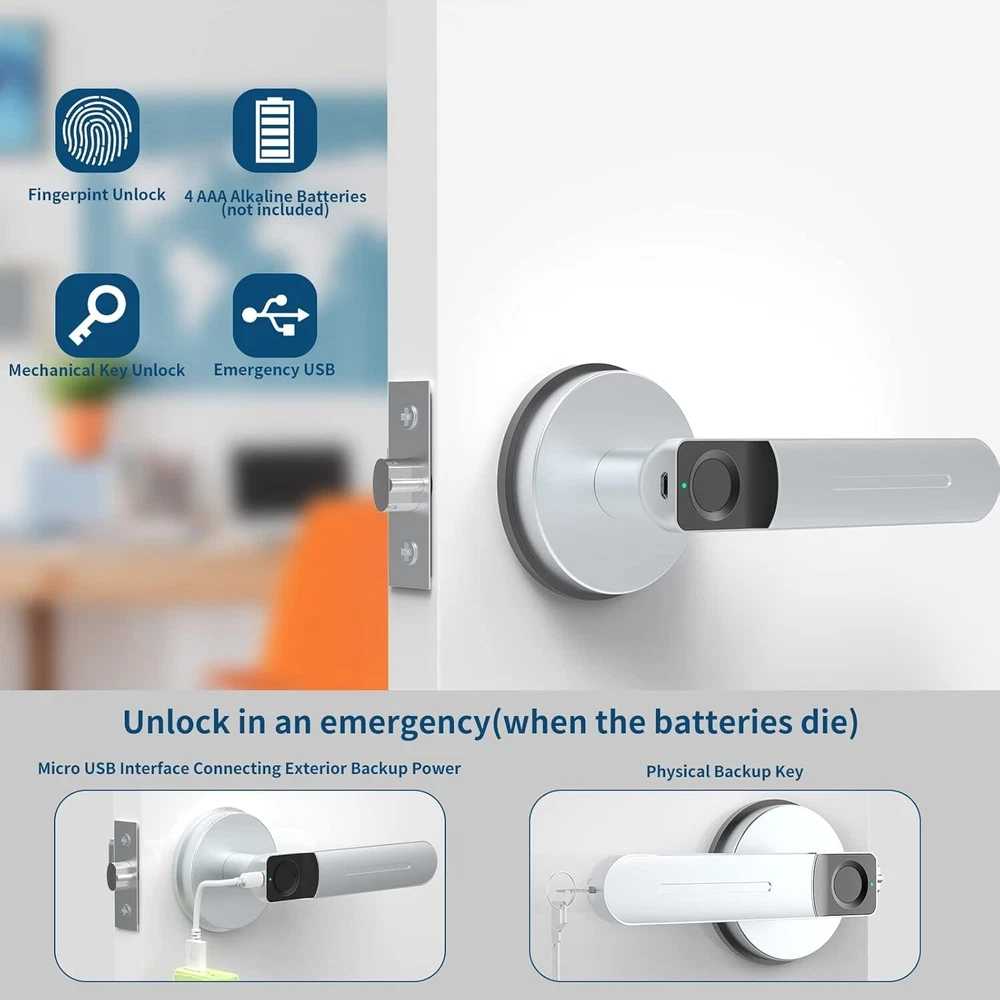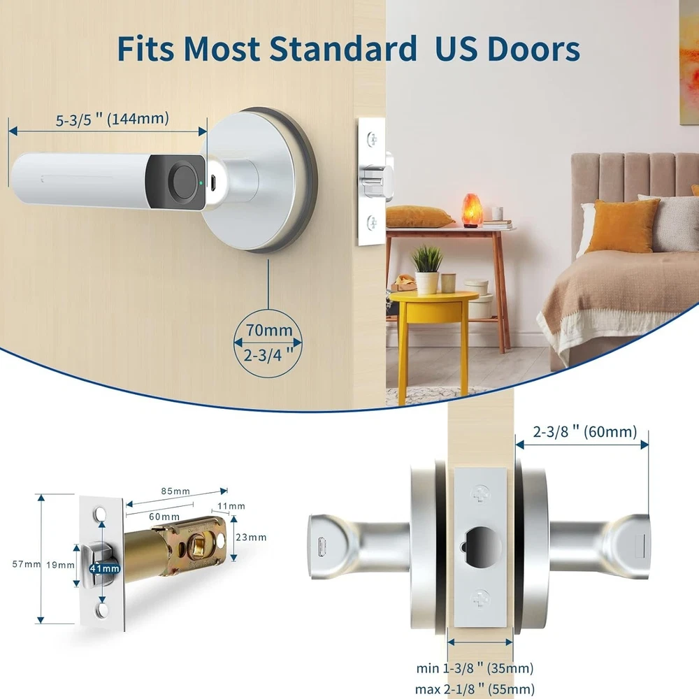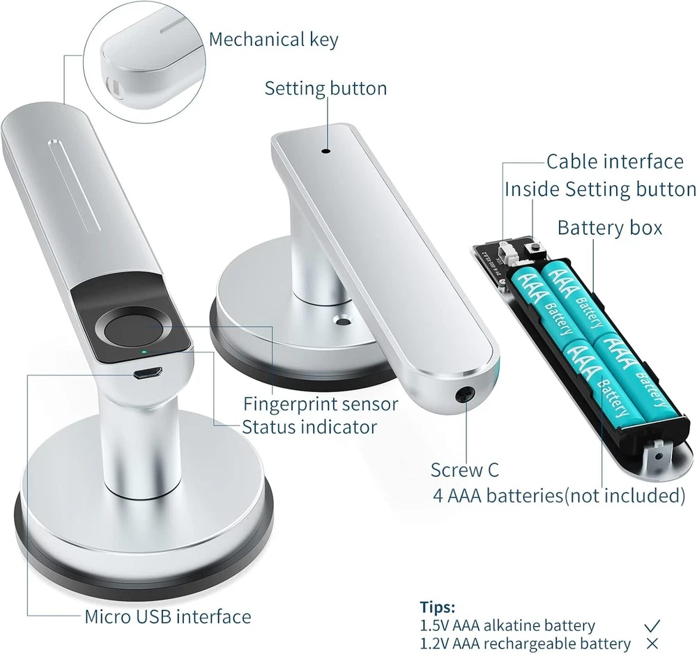 Product Dimensions: 6.49 X 2.6 X 2.5 Inches Battery Cell Type: Alkaline Shape: Door Handle gtin13: Does not apply Finish Type: Painted ANSI Grade: Not Specified Color: Silver Style: Modern Batteries Included?: No Type: Door Lock Brand: Unbranded Number in Pack: 1 UPC: Does not apply Suitable For: Interior/Room Door, Home, Office, Bedroom, Apartments, Closets, Interior Doors Features: Keyless, Easy to Install, Electronic, Adjustable Backset, Self Closing, Fingerprint Identification, 2 ways to unlock, Humanized design, DIY installation, Low battery alert, USB emergency power port, Auto-lock mode, Normal-open mode, Adjustable door handle Item Package Quantity: 1 Item Depth: 2.5 in Mounting: Universal Lock Type: Biometric Control Method: Touch Door Handing: Universal/Reversible Items Included: Hardware, Main parts, Front handle, Back handle, Single latch, Strike plate, 2 keys, Square cotter, 2 spiral tubes, Screws, Installation guide Controller Type: Finger Touch Item Dimensions L X W X H: 6.49 X 2.6 X 2.5 Inches Item Weight: 2.15 lb Fixings Supplied: Yes Number Of Pieces: 1 Batteries Required?: Yes Finish: Painted Material: Zinc Batteries: 4 Aaa Batteries Required. Cross Bore Diameter: Not Specified