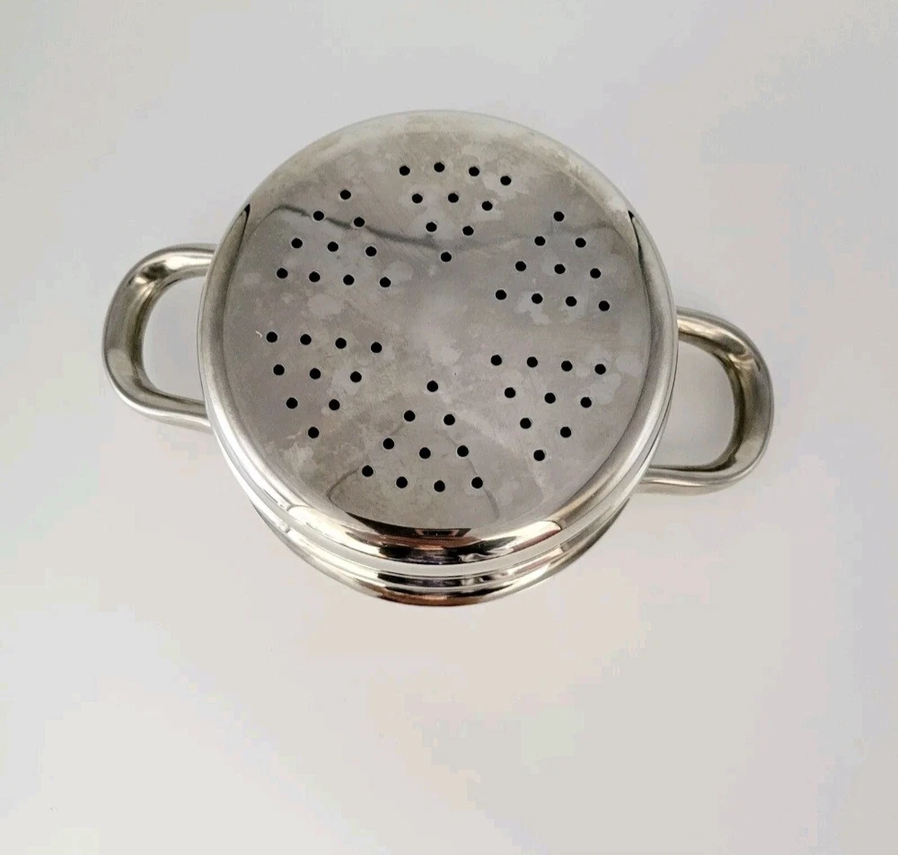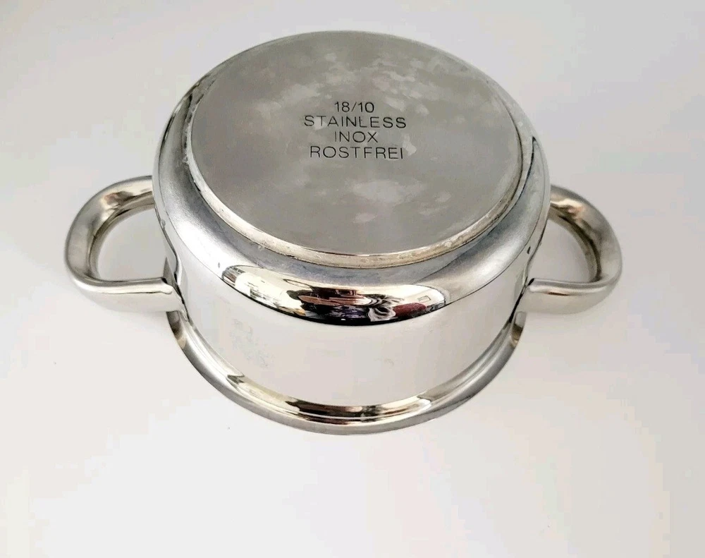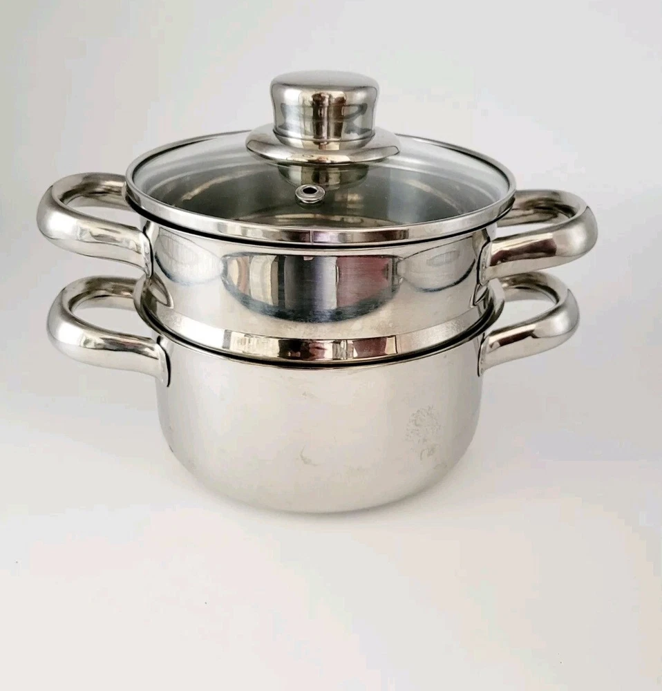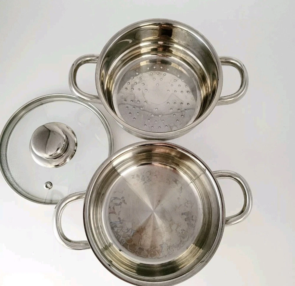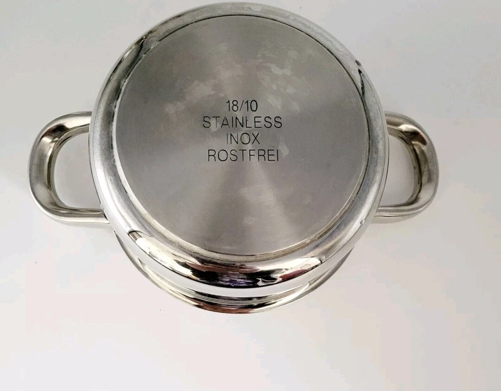 Inox Rostfrei 18/10 Stainless Steel 1 Quart Multi Cooker Steamer Set. This set is in great condition. Very clean. No cracks or chips on the glass lid. Pots have no dents or pits. Light wear. Set holds about 1 quart. 5" high by 8 1/2" wide. Bottom diameter is about 5". Both pots are about 3" deep. Glass lid has a steamer hole. 18/10 Stainless steel.