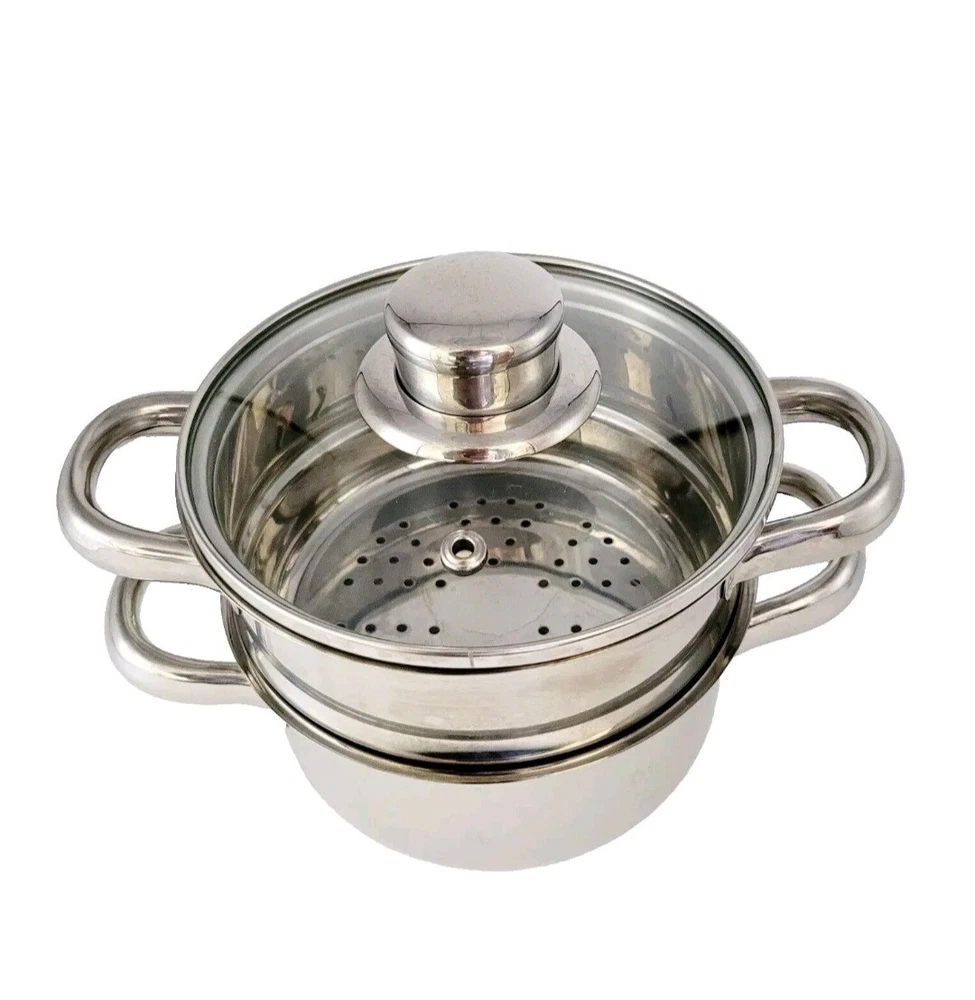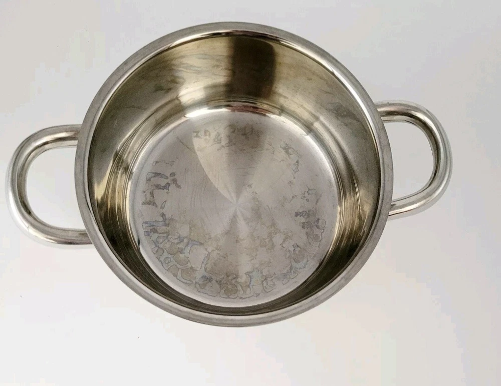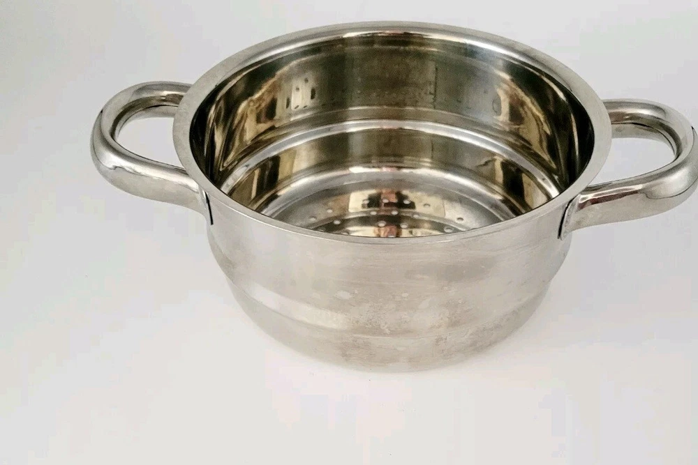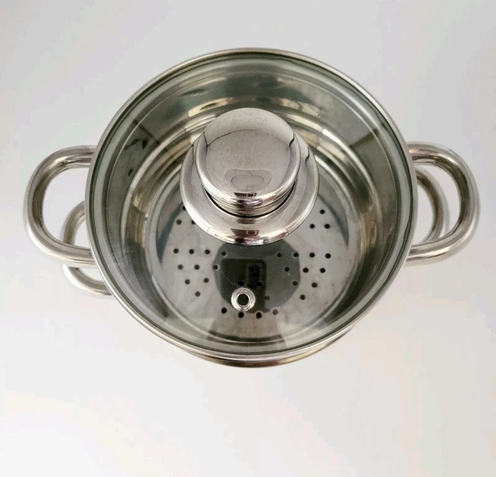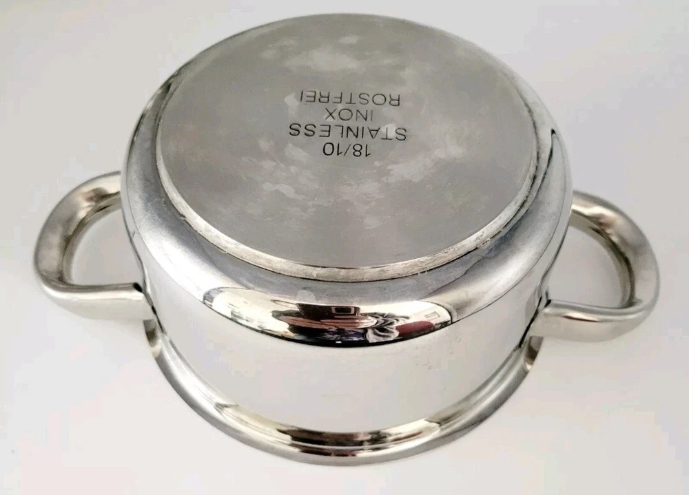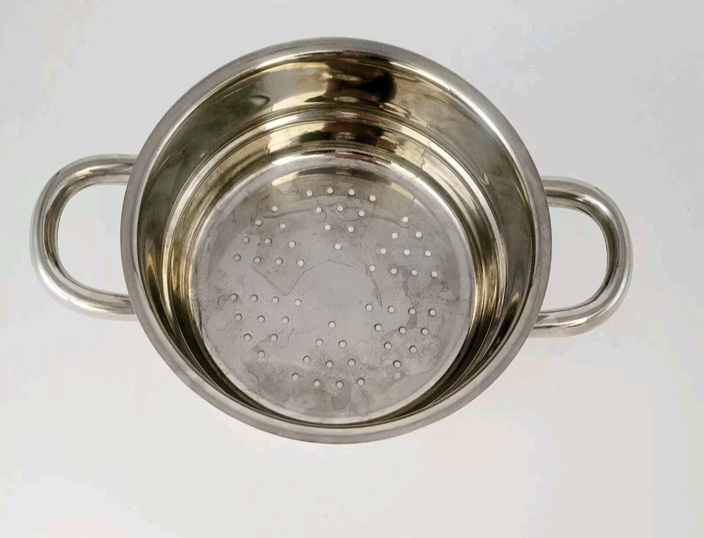 Inox Rostfrei 18/10 Stainless Steel 1 Quart Multi Cooker Steamer Set. This set is in great condition. Very clean. No cracks or chips on the glass lid. Pots have no dents or pits. Light wear. Set holds about 1 quart. 5" high by 8 1/2" wide. Bottom diameter is about 5". Both pots are about 3" deep. Glass lid has a steamer hole. 18/10 Stainless steel.