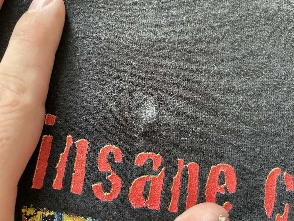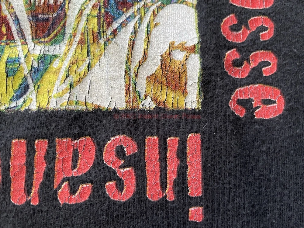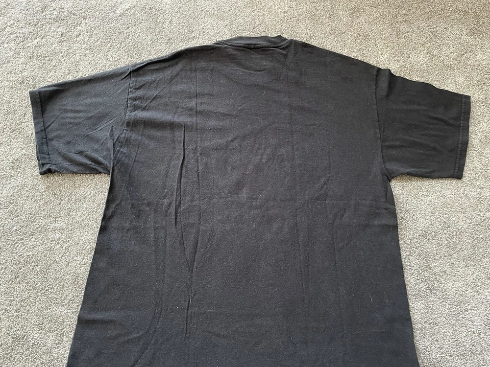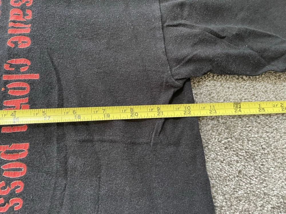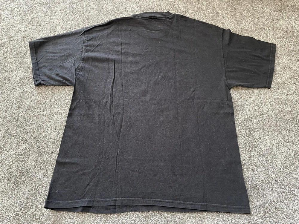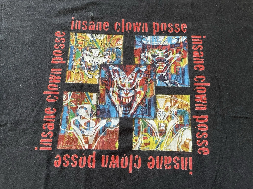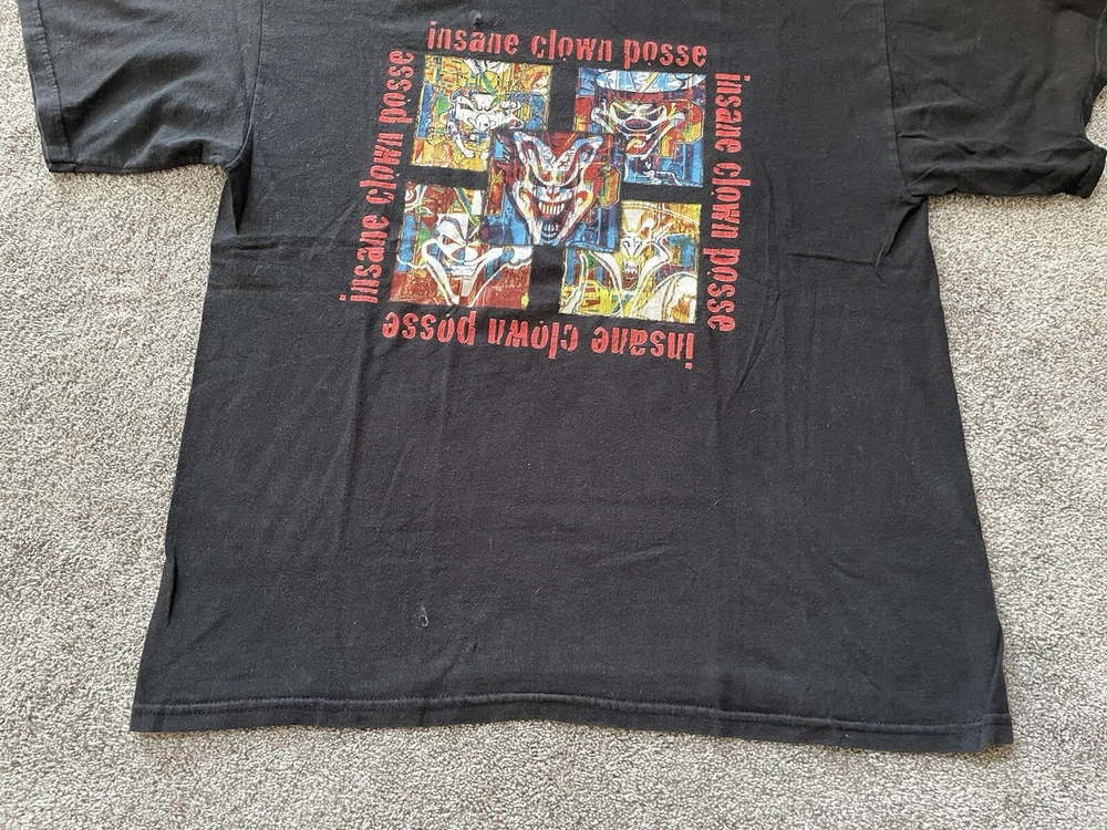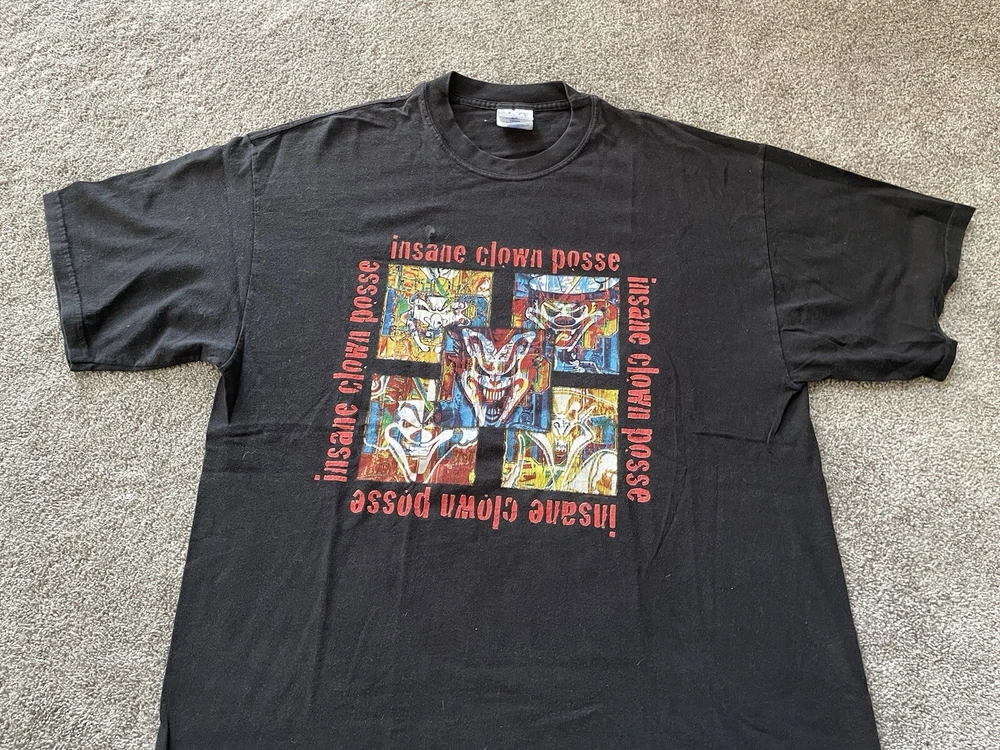 This vintage Insane Clown Posse shirt is a must-have for any fan of Y2K hip hop music. Featuring the five jokers graphic, this black shirt is a statement piece that will make you stand out from the crowd. Made in Mexico, this original piece of music memorabilia is perfect for collectors. The shirt is sized for men's XL and is sure to make a statement in any setting. Whether you're a fan of rock and pop music or simply appreciate the unique style of the Insane Clown Posse, this shirt is a must-have addition to your wardrobe. This item is preowned and shows signs of use and wear. Please see all photos for exact condition.