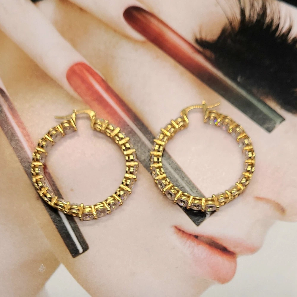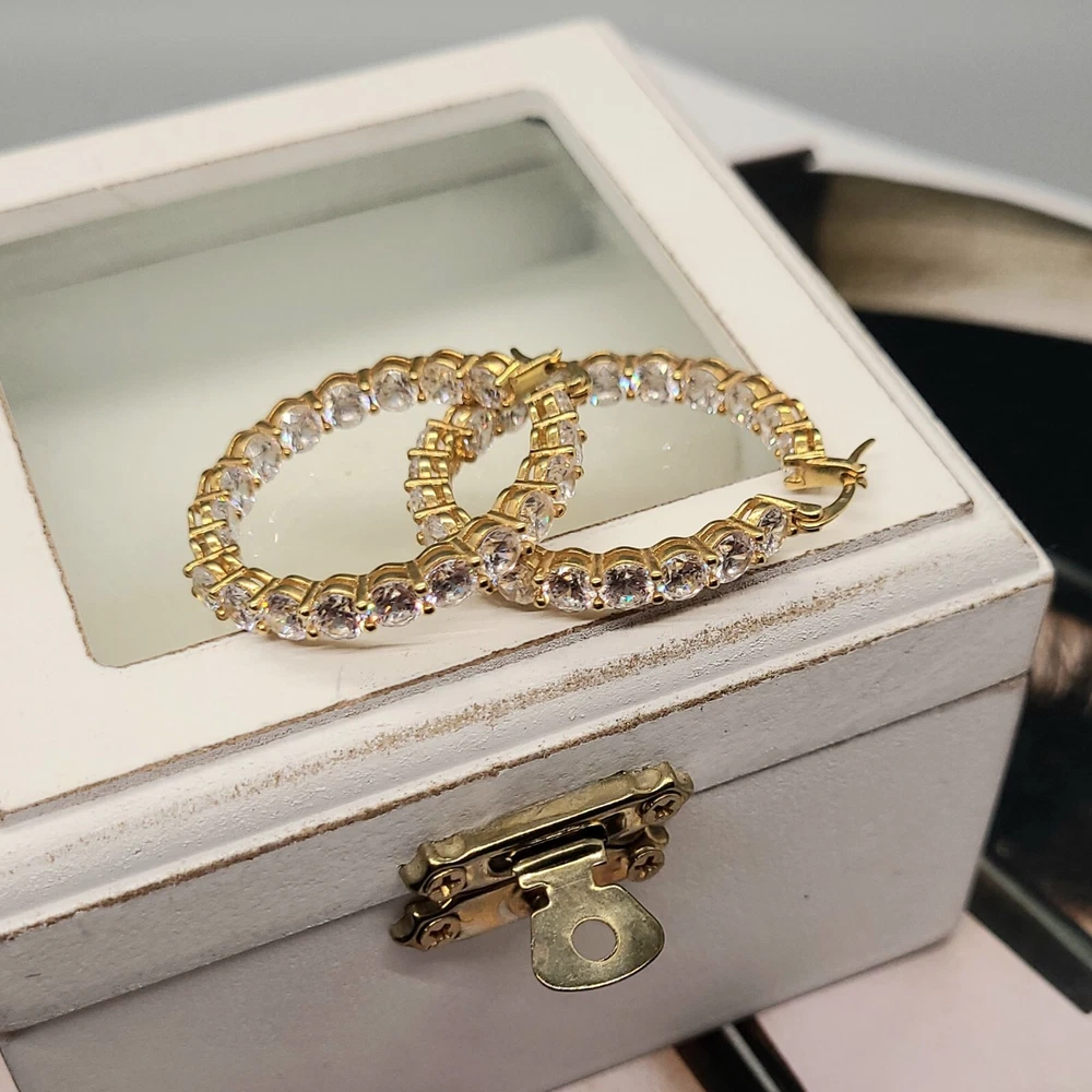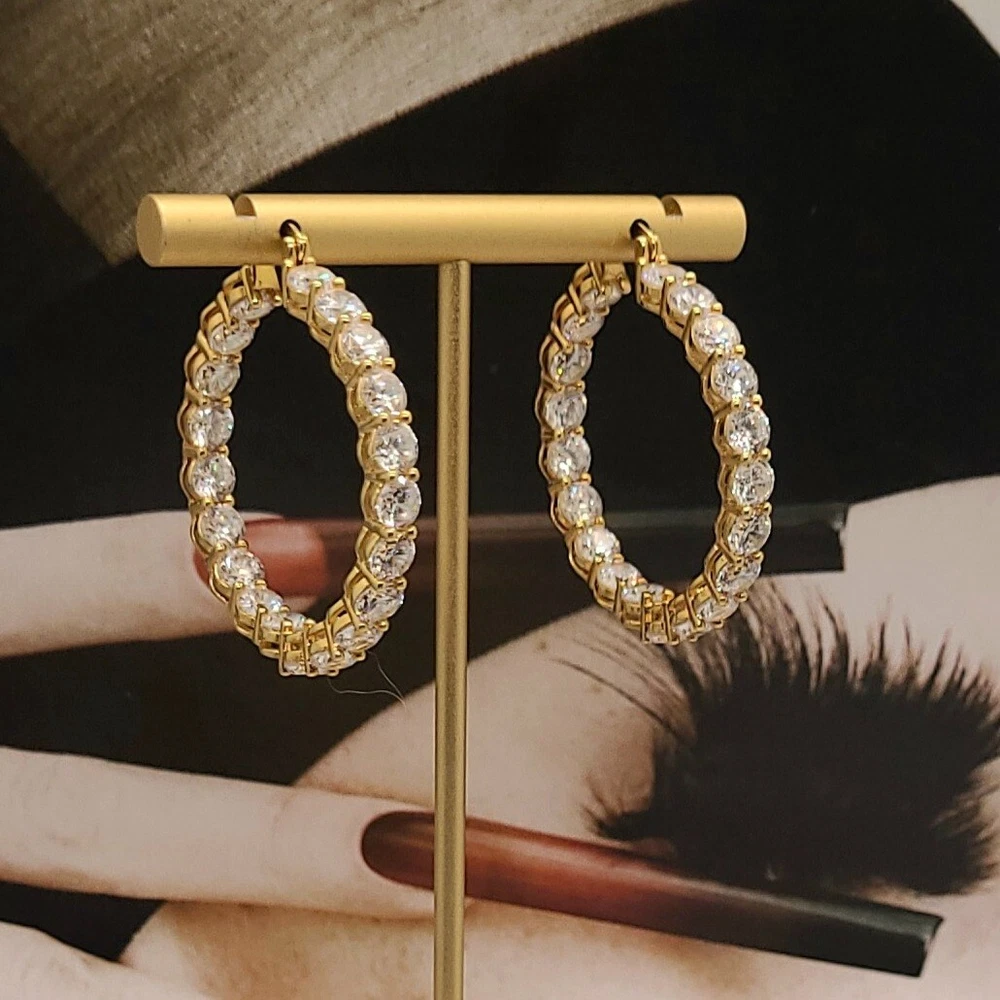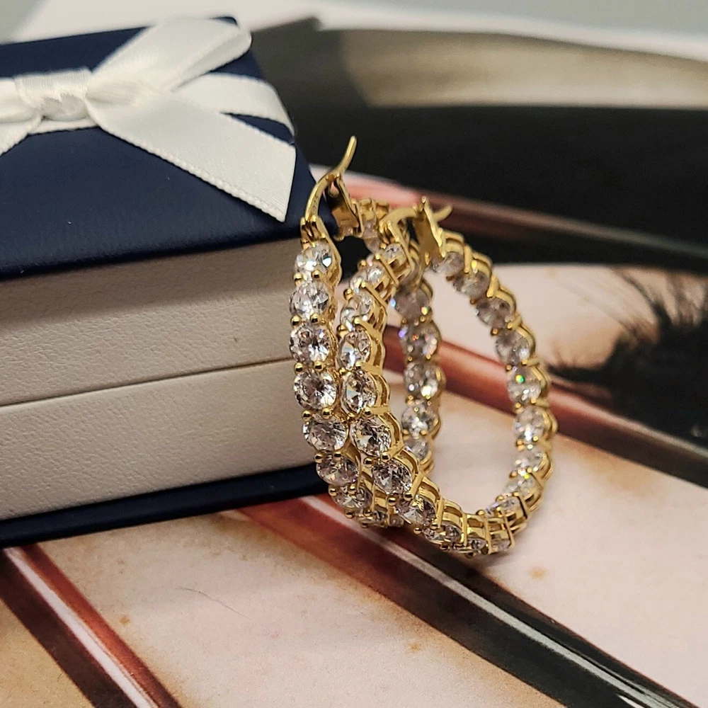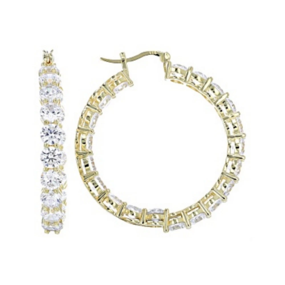 Add a touch of elegance to your look with these stunning hoop earrings. Crafted from 14K gold over sterling silver, these earrings feature lab-created simulated diamonds with a prong setting. The earrings are designed in a hoop style with a secure lock back closure, making them perfect for any occasion like Christmas, anniversary or birthday. The white/colorless simulated diamond adds a touch of beauty to the earrings, making them perfect for the lobe area. The earrings are 2 inches in length and are part of the Sterling brand. Give yourself a gift of beauty with these Inside Outside 23.20CTW Diamond Hoop Earrings.