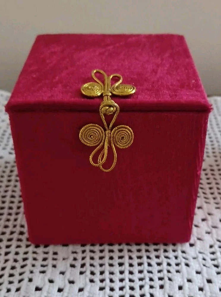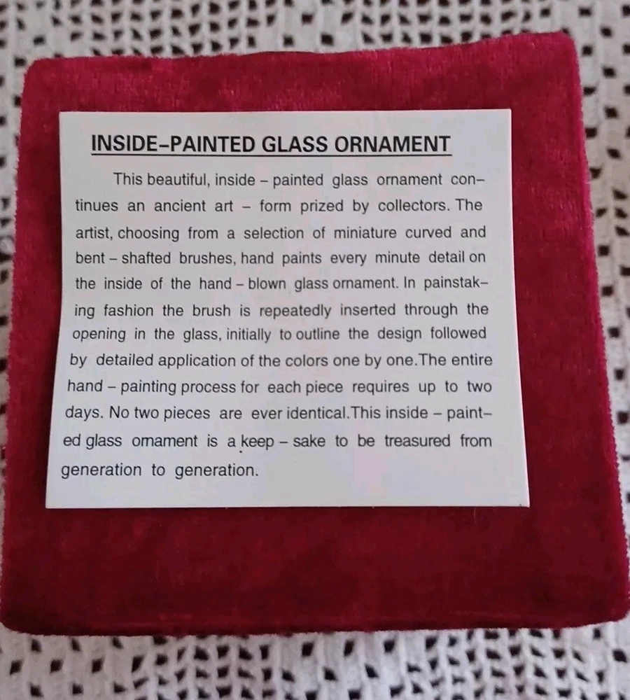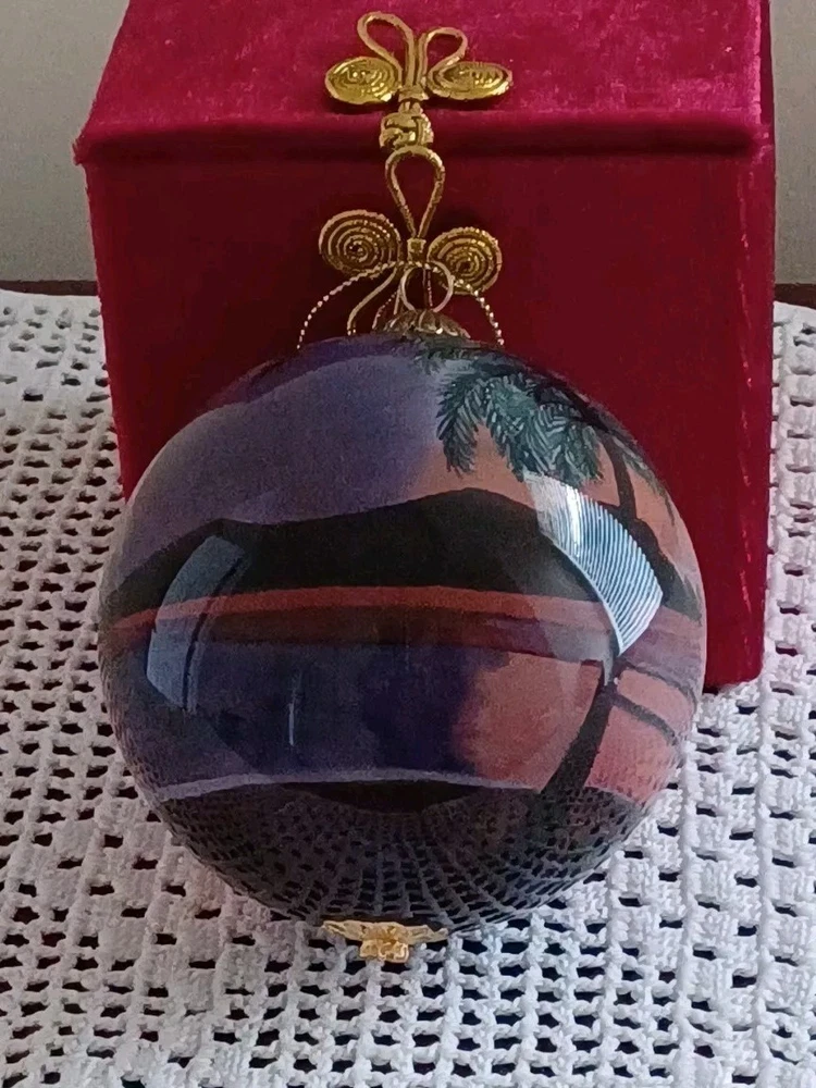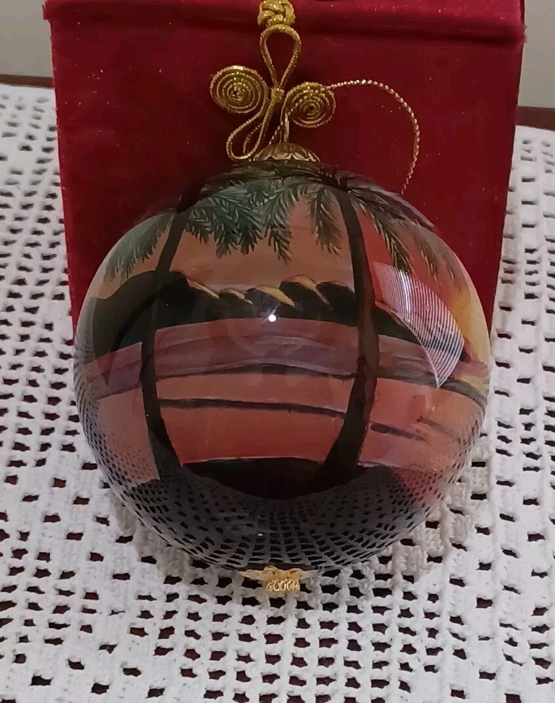 Beautiful inside painted round hand blown glass ornament. Design features an adult couple on the beach, palm trees, an amazing sunset, and mountains. Small area of glue next to the gold accent is somewhat noticeable. Red velvet box is included. Please review the pictures and reach out with questions