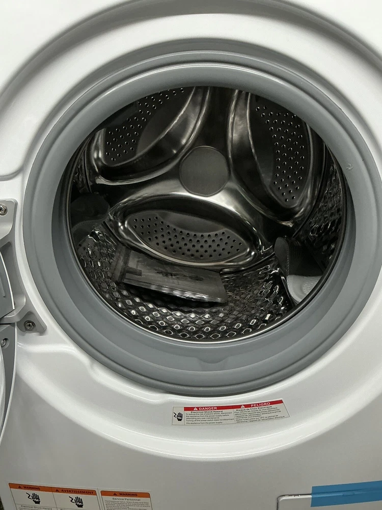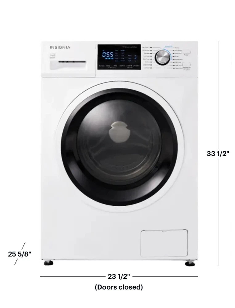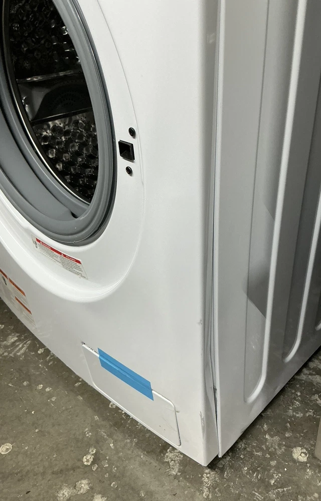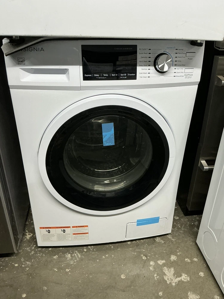 Side has dent, please see pictures. Make laundry simple with the Insignia NS-FWM27W1 2.7 Cu. Ft. 16-Cycle High Efficiency Front-Loading Washer. With 16 wash cycles, 5 temperature levels and 5 speed options to choose from, you have the power to fully customize your washing experience. Keep your children safe by selecting the child lock on the washer and never worry about the machine operating without an adult. An automatic lid lock prevents the lid from opening while the washer motor is in motion and automatic water level control fills the washer with the necessary water for each individual load. An available matching dryer model makes this the perfect set for any home. Keep your laundry frustrations low and options high by fulfilling every washing need.