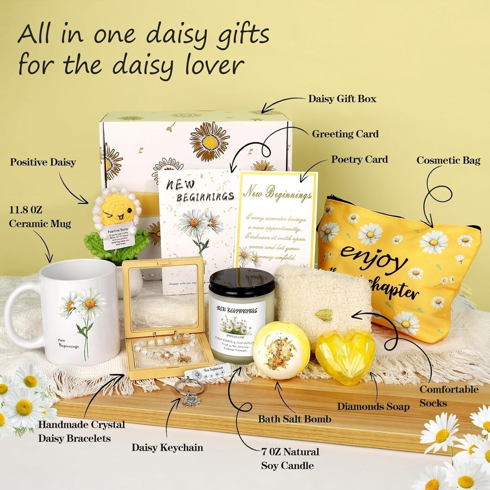 Inspirational Daisy Gift Basket - Candle, Keychain, Bracelet ‹ › ‹ › ‹ › ‹ › ‹ › ‹ › ‹ › ‹ › ‹ › Inspirational Daisy Gift Basket Heartwarming Daisy Gift Box - Surprise your loved ones with the New Beginnings Gift Basket, filled with hope and charm. This exquisite gift basket includes: Natural soy candle Elegant coffee mug Daisy bracelet Charming keychain Cosmetic bag Crochet flower daisies Cozy socks Bath salt bomb Diamond soap Greeting card and poetry card Perfect for Celebrating New Starts Imagine the joy on their faces as they unwrap this beautifully crafted Daisy Gift Box. A soothing scented candle and charming daisy keychain bring warmth and inspiration, making it ideal for: College graduations New job celebrations Housewarming gifts Farewell gifts for coworkers Relaxation gifts for women Thoughtful and Uplifting Gifts Brighten someone's day with the New Beginnings Gift Box. Inside, they’ll find a comforting bath salt bomb, cozy socks, and a crystal daisy bracelet, all designed to uplift and inspire. The lovely daisy theme and "new beginnings" message make it a heartfelt gift for any transition. Perfect for Life’s Transitions From the elegant ceramic mug to the positive knitted daisy flowers, each item is thoughtfully chosen to bring joy. This gift box is perfect for life's significant transitions: New jobs Breakups Divorces Co-worker departures Job promotions A Versatile Gifting Solution Suitable for various life transitions, the Positive Energy Daisy Gifts is perfect for: Going away gifts Inspirational gifts for women Funny coworker goodbye gifts Wishing someone good luck This thoughtful gesture is ideal for parents, hostesses, brides, sisters, best friends, bosses, coworkers, and loved ones. Each item radiates positivity and joy, making every new chapter in life special. Embrace New Beginnings With our daisy-themed gifts, you can celebrate every cherished moment with love and joy, reminding your loved ones that every ending is a new beginning! Shipping Free & Fast Shipping - We offer free shipping to most of the USA with a normal delivery time of 3-10 business days. However, due to various situations, additional delivery time (up to 3 weeks) may be required for some items. Alternative Carriers - We may use alternative carriers (e.g. USPS, FedEx, UPS, etc.) to ensure your package arrives safely and on time. Due to the use of multiple carriers, we are unable to provide a tracking number automatically. Handling Time - Orders are processed and shipped within 1-5 business days of receiving cleared payment. Shipping Restrictions - Shipping to Alaska, Hawaii, Puerto Rico, Guam, and other US territories may incur shipping charges or delivery restrictions. Please contact us before ordering, or your order can be refunded/cancelled. State Restrictions - There may be restrictions based on your state of purchase. For example, certain items may not be shipped to California due to state regulations. Contact for Tracking Updates - If you require tracking updates or have any concerns about the delivery of your order, please feel free to contact us, and we will be happy to assist you. Return 30-Day Hassle-Free Returns - We want you to be completely satisfied with your purchase. If you are not, you can return the item within 30 days of receiving it for a full refund or exchange. Easy Return Process - To start a return, simply contact us and we will provide you with a prepaid return shipping label and detailed instructions. Restocking Fee - There are no restocking fees for returns. However, the buyer is responsible for return shipping costs if the return is not due to a seller's error. Refund Processing Time - Refunds will be processed within 5 business days of receiving the returned item in its condition. Payment We accept all major credit cards, PayPal, and Apple Pay for your convenience. Your payment information is secure and encrypted to ensure a safe and seamless transaction. Please complete your payment within 3 days of purchase to avoid any delays in shipping. Feedback Your feedback is extremely important to us. We strive to provide the best products and customer service possible. If you are satisfied with your purchase, please take a moment to leave us a positive review. If you have any concerns or issues with your order, please contact us before leaving negative feedback. We are committed to resolving any problems and ensuring your satisfaction. Contact Us If you have any questions or concerns, please feel free to out to our customer support team. You can contact us through the eBay messaging system. We are available Monday to Friday, 9:00 am to 5:00 pm EST, and we will do our best to respond to your inquiry within 24 hours. Buy it now and enjoy a pleasant shopping experience! Unit Quantity: 2.83 pounds Material: Plastic,soy wax,ceramic,cotton,paper,metal Type: Gift Box Size: Medium Number of Items: 1 Color: Yellow Occasion: Graduation Recipient: Multipurpose Origin: California Shape: Round Style: Glam