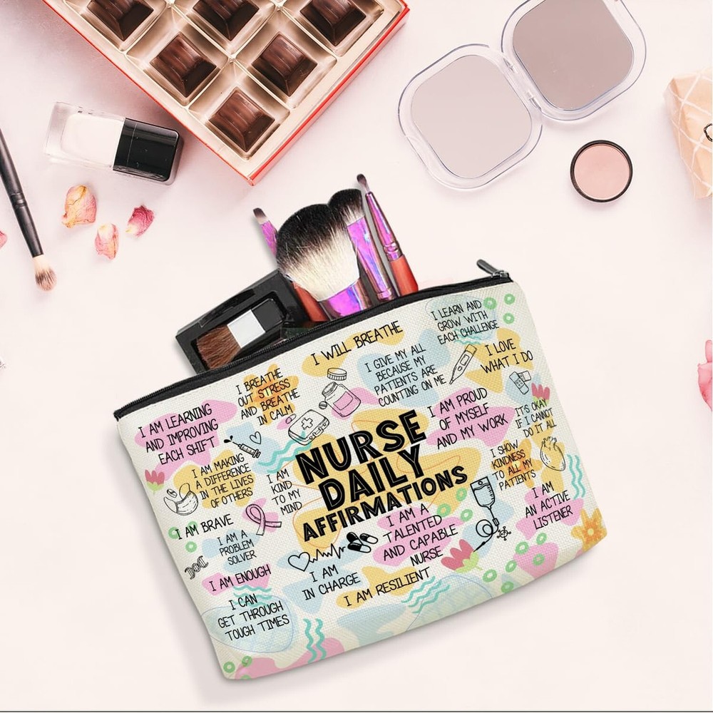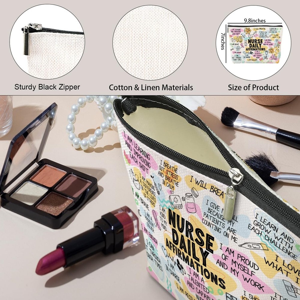 Daily Affirmations Makeup Bag Nurse Accessories for Work Nurse Gifts Nursing Student Essentials Inspirational Gifts for Women Female RN Nurse Coworker Birthday Friendship Nurse Day Travel Toiletry Bag Product Details Color: Multicolor630 Brand: jeilink MPN: cosmetic bag630 UPC: Does not apply EAN: Does not apply Product Dimensions: 9.8 x 2 x 7 inches Item Weight: 1.44 ounces Department: Unisex Adult Manufacturer: jeilink Country of Origin: China Item model number: cosmetic bag630 Material: This make up bag is made of cotton and linen, with a metal zipper, It is durable, easy to clean, lightweight, which is easy to be carried. Our cosmetic bag is with unique double-sided printed. Size: The size of this travel toiletry bag is about 9.8x7 Inches. Suitable for you to put different cosmetics, skin care products, sunglasses, cellphone, keys, purse, or other small items on the bag. Not take much space. TIPS: Manual measuring permissible error. Great Gift Ideal: Our makeup bag is a good ideal for women, best friend, lover, wife, coworker, teacher, mom, grandma, nurse, doctor, boss, bestie, sister aunt birthday, Wedding, Anniversary, housewarming, Thanksgiving, Christmas, New Year, Valentine's Day, Mothers Day etc. Multipurpose: The bag can it be used as a travel cosmetic bag, makeup bag organizer, make up pouch, storage bag, toiletry bag, skincare bag, glasses bag and so on. Wide Occasions: Our bag can be applied for different occasions, like vacation, business, travel, gym, yoga, sports, bathing, wedding, camping, or other indoor & outdoor activities. Portable & Lightweight makeup bag, cosmetic bag, toiletry pouch, multifunctional bag, great to store toiletries, it is great gift idea mom, wife, sister, girlfriend, leader, mentor, colleague, coworker, teacher, mom, grandma, nurse, doctor, boss, bestie, BFF, female.
