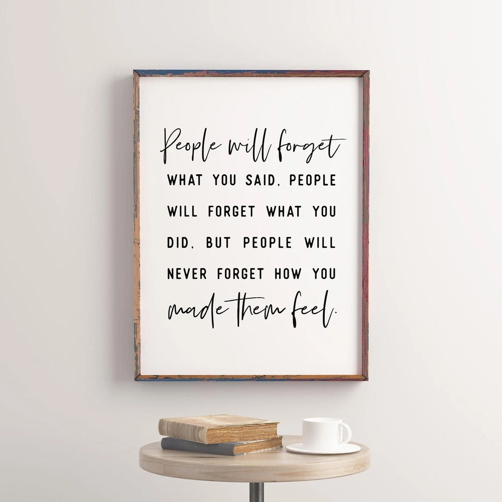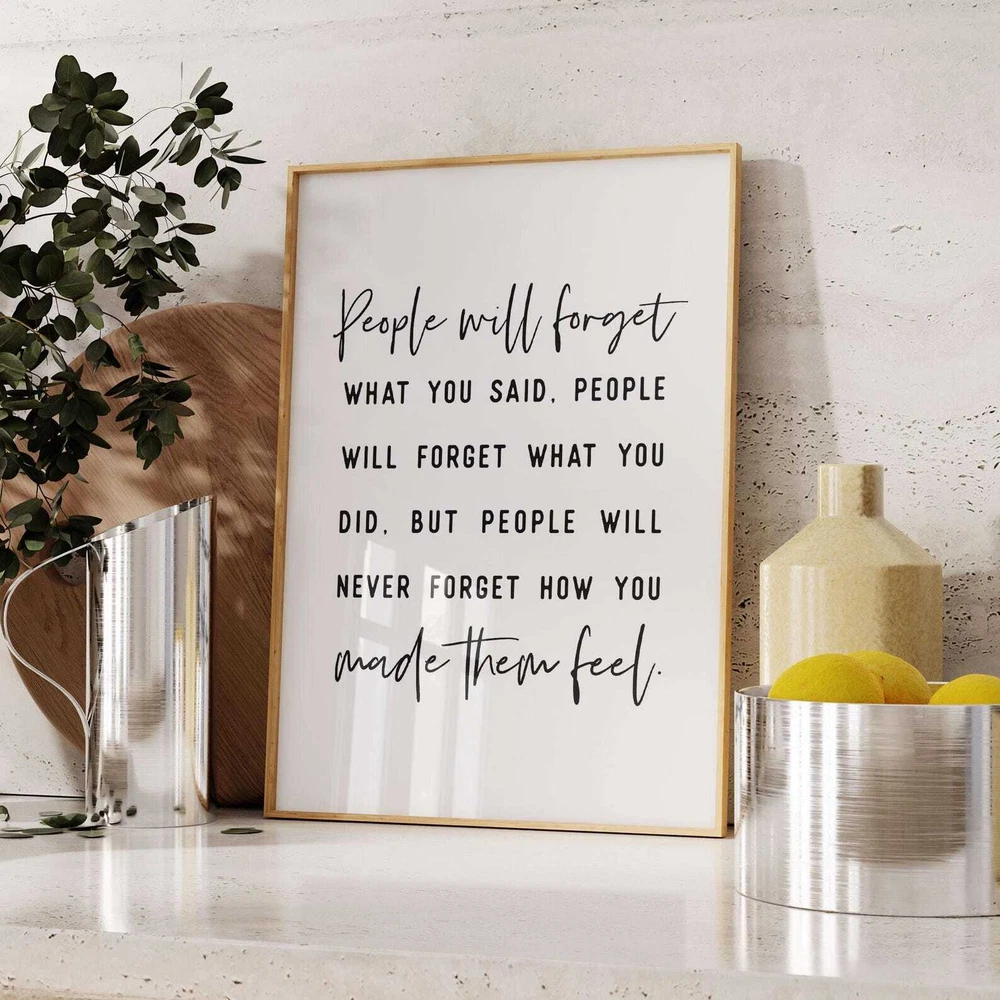 Inspirational Quotes Poster Printable Motivational Wall Art Maya Angelou People Will Never Forget Quote Print Art Material: Premium luster photo paper Print type: Inkjet printing One side printed + The finish provides the highest possible resolution and color saturation + Lasts up to 200 years in color and 400 years in black-and-white + Printed on high-quality resin-coated photo base paper medium + Posters can be hung with double-sided tape, tacks, or framed + Hand washing with a gentle cry cloth is recommended for extended durability I will hand select the best choice of paper for your chosen design to ensure top quality results for a beautiful, bright and luxurious print. All prints are sealed in cellophane slips for protection during transportation, and are shipped in a protective cardboard envelope.